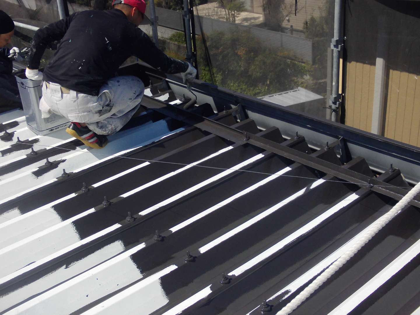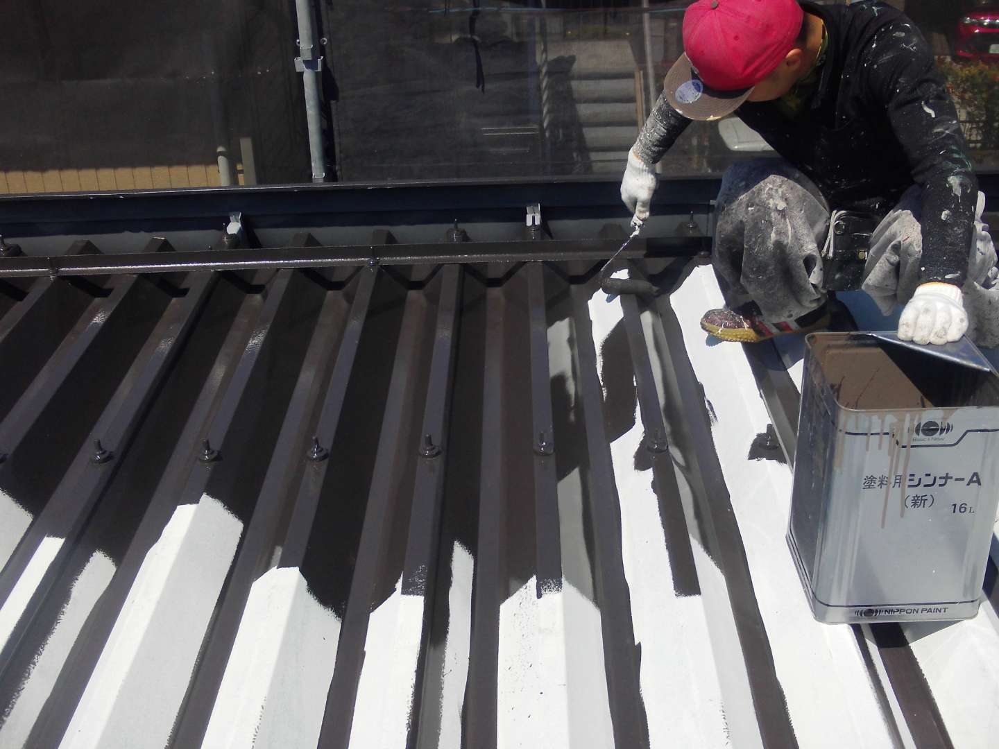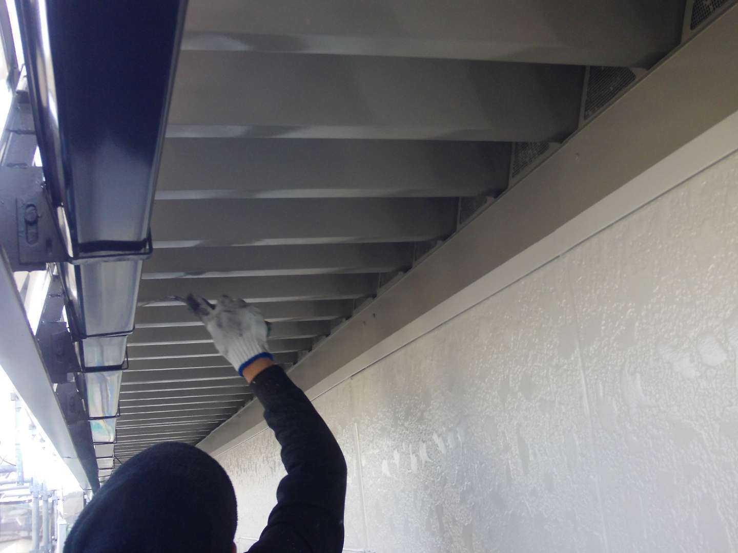 本日の作業は屋根中塗り・軒樋・軒天塗装工事