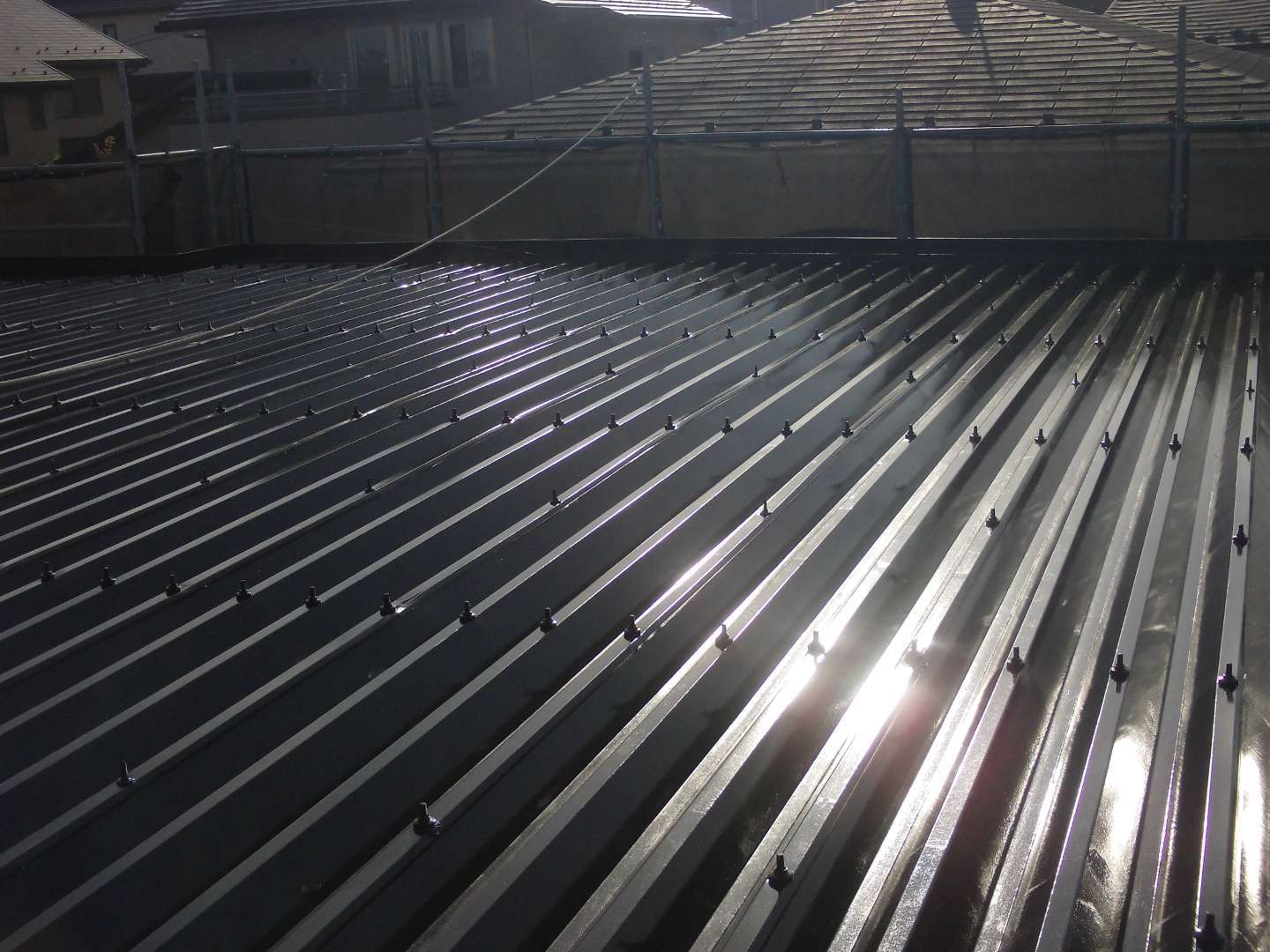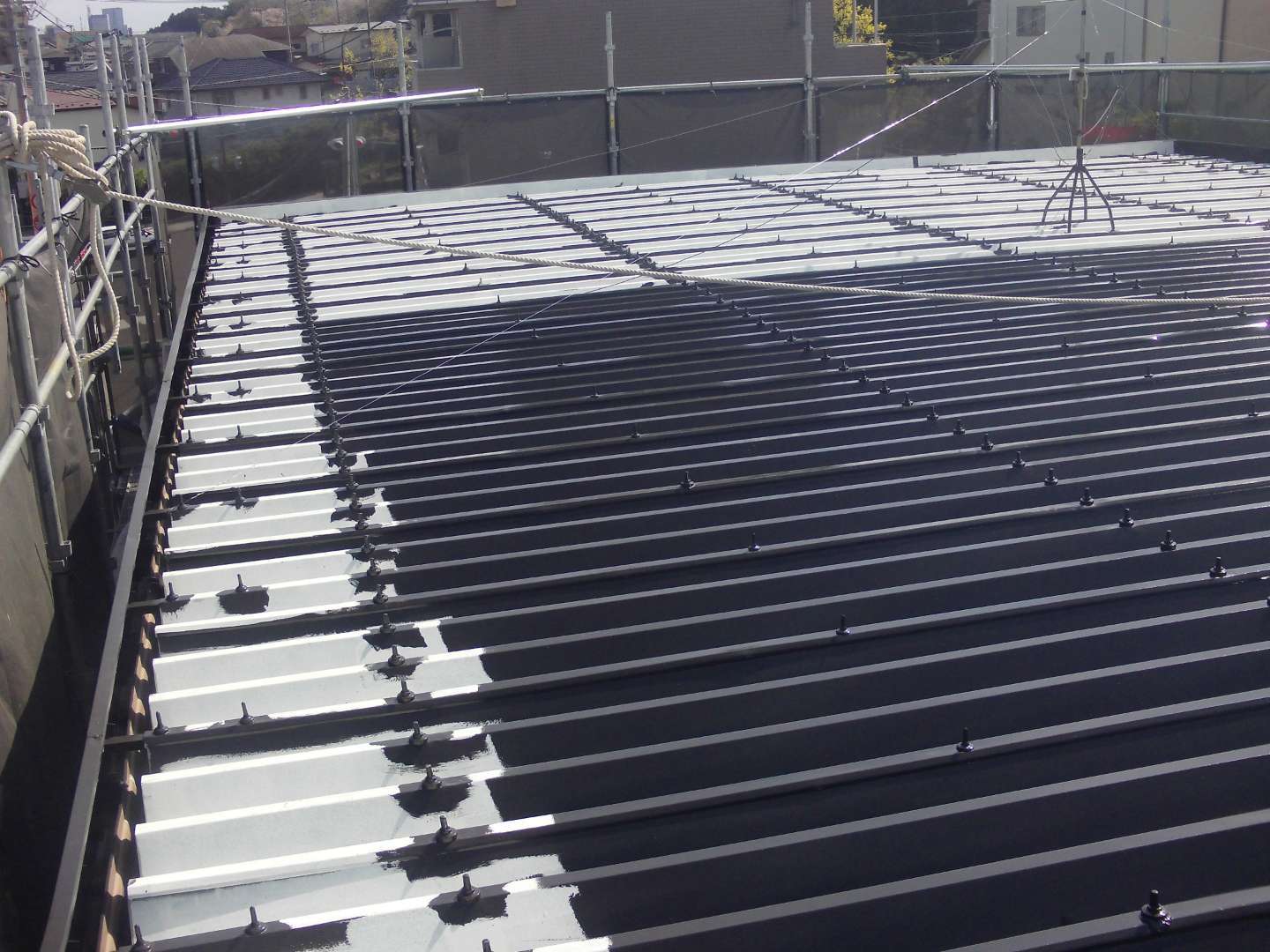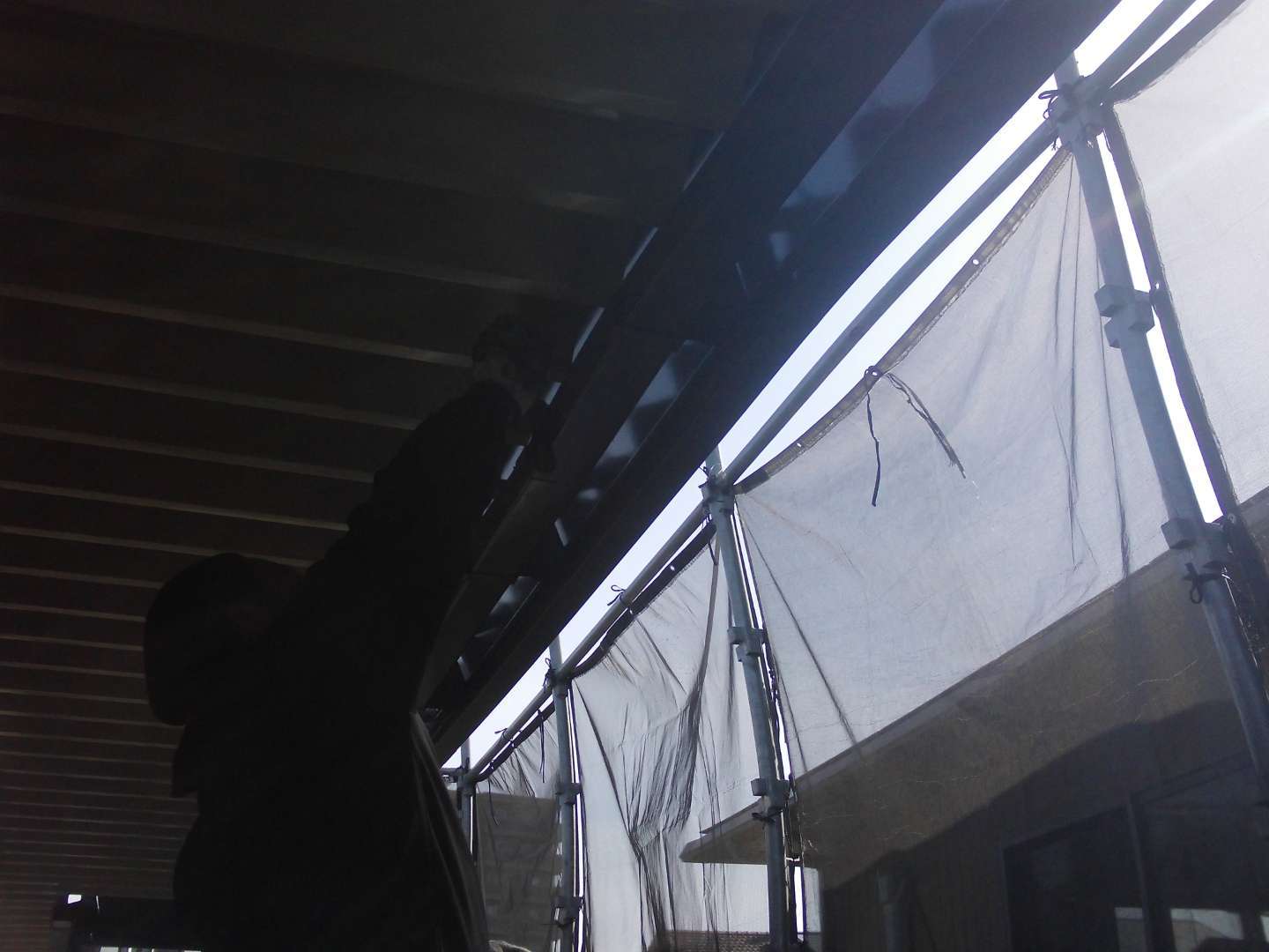 本日の作業は屋根中塗り・軒樋・軒天塗装工事