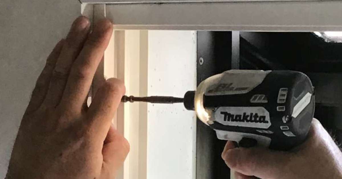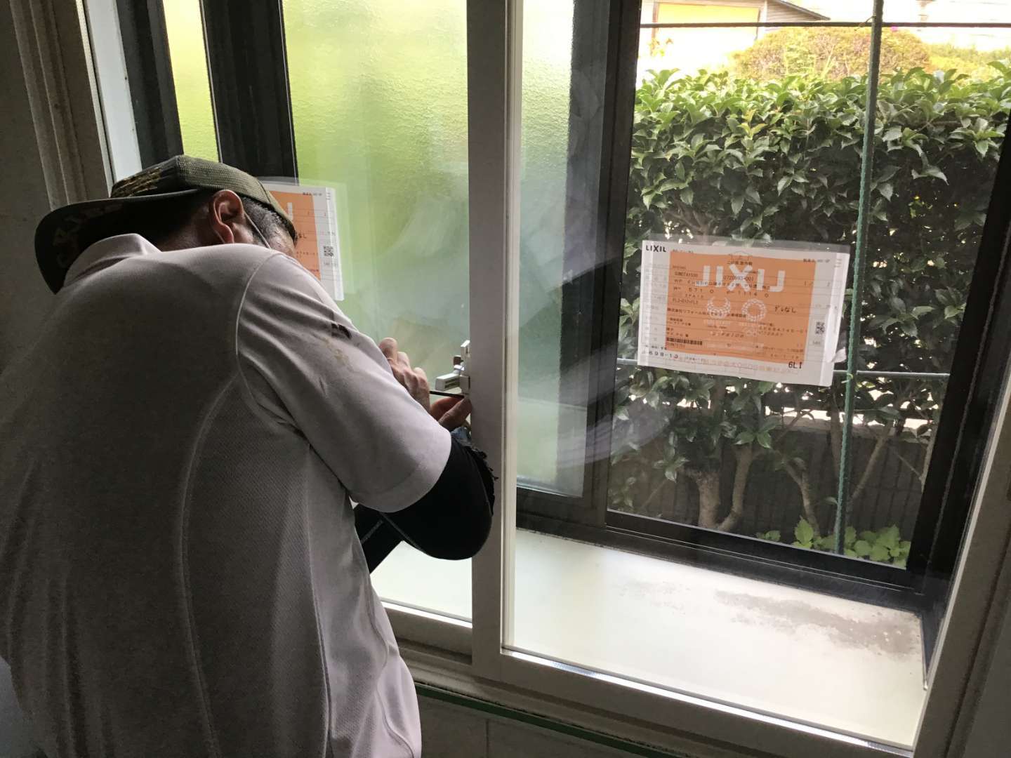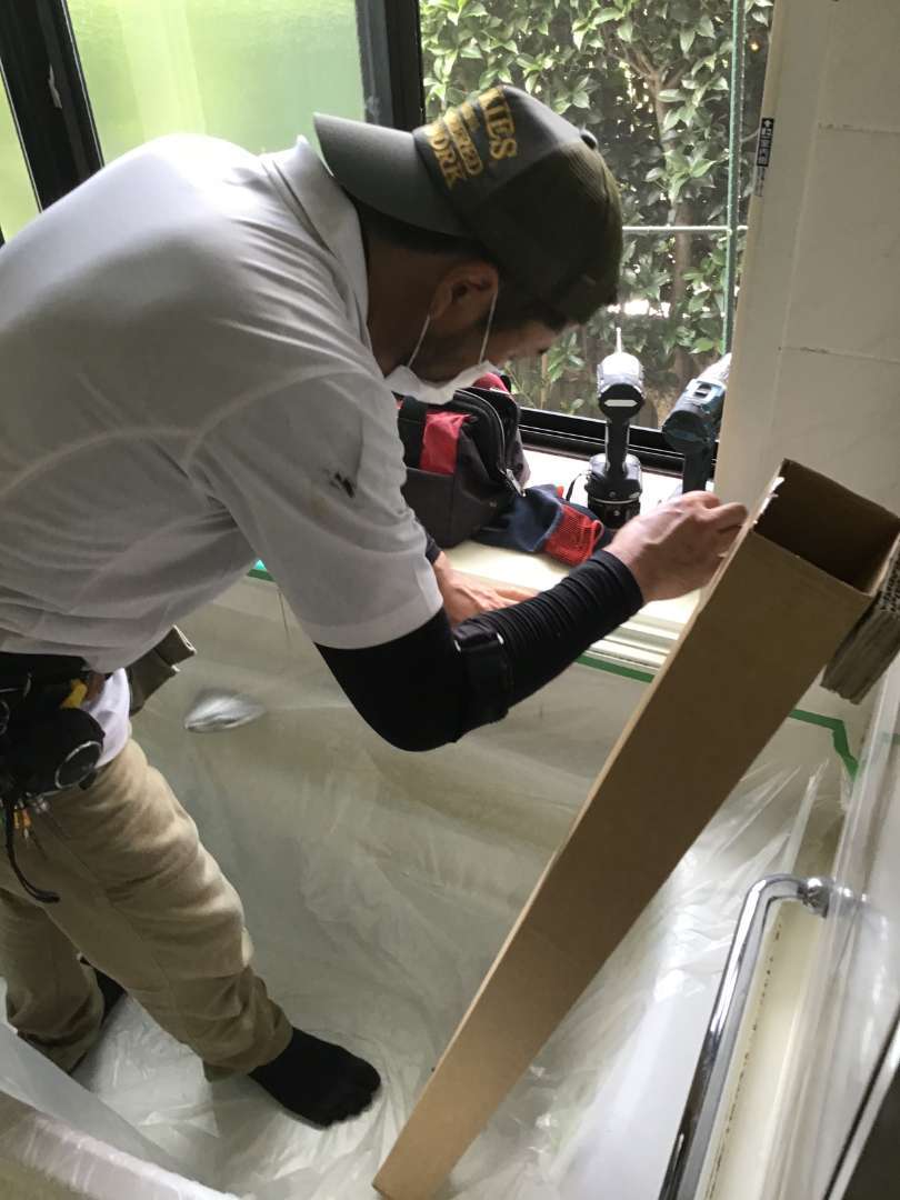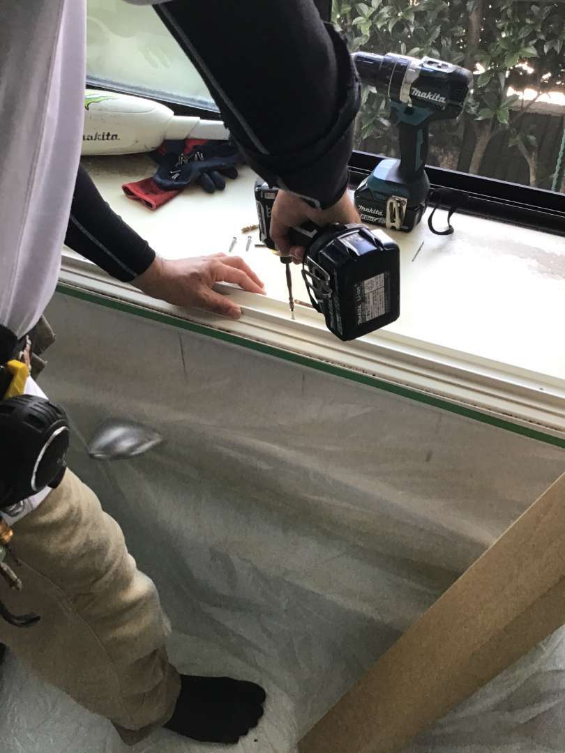 出窓の内側に樹脂サッシ枠取付作業中