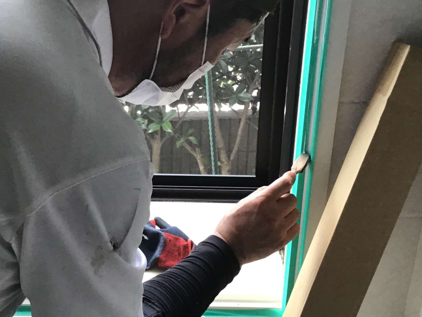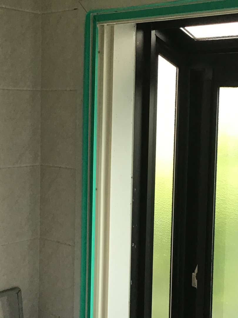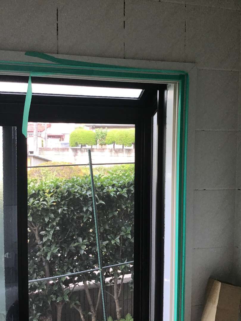 樹脂サッシ枠にシーリング打ちの為マスキングテープ張り