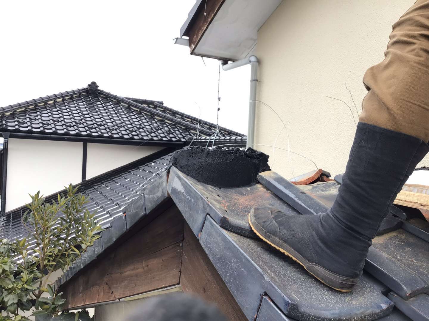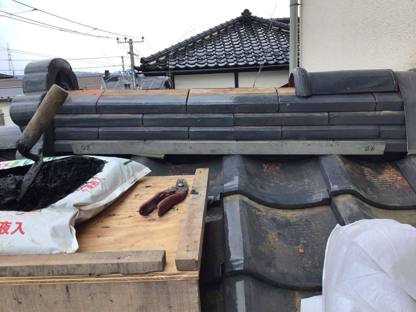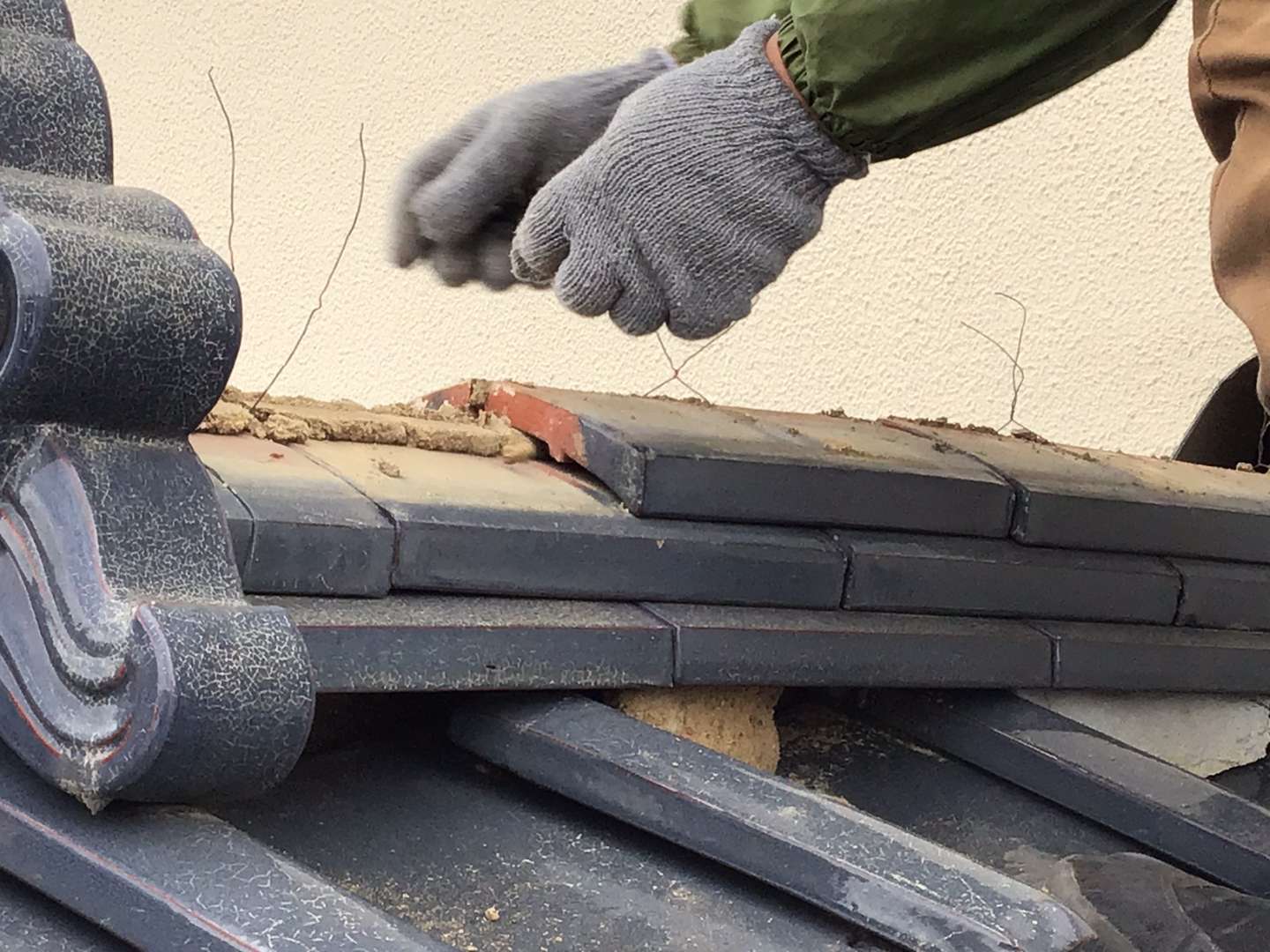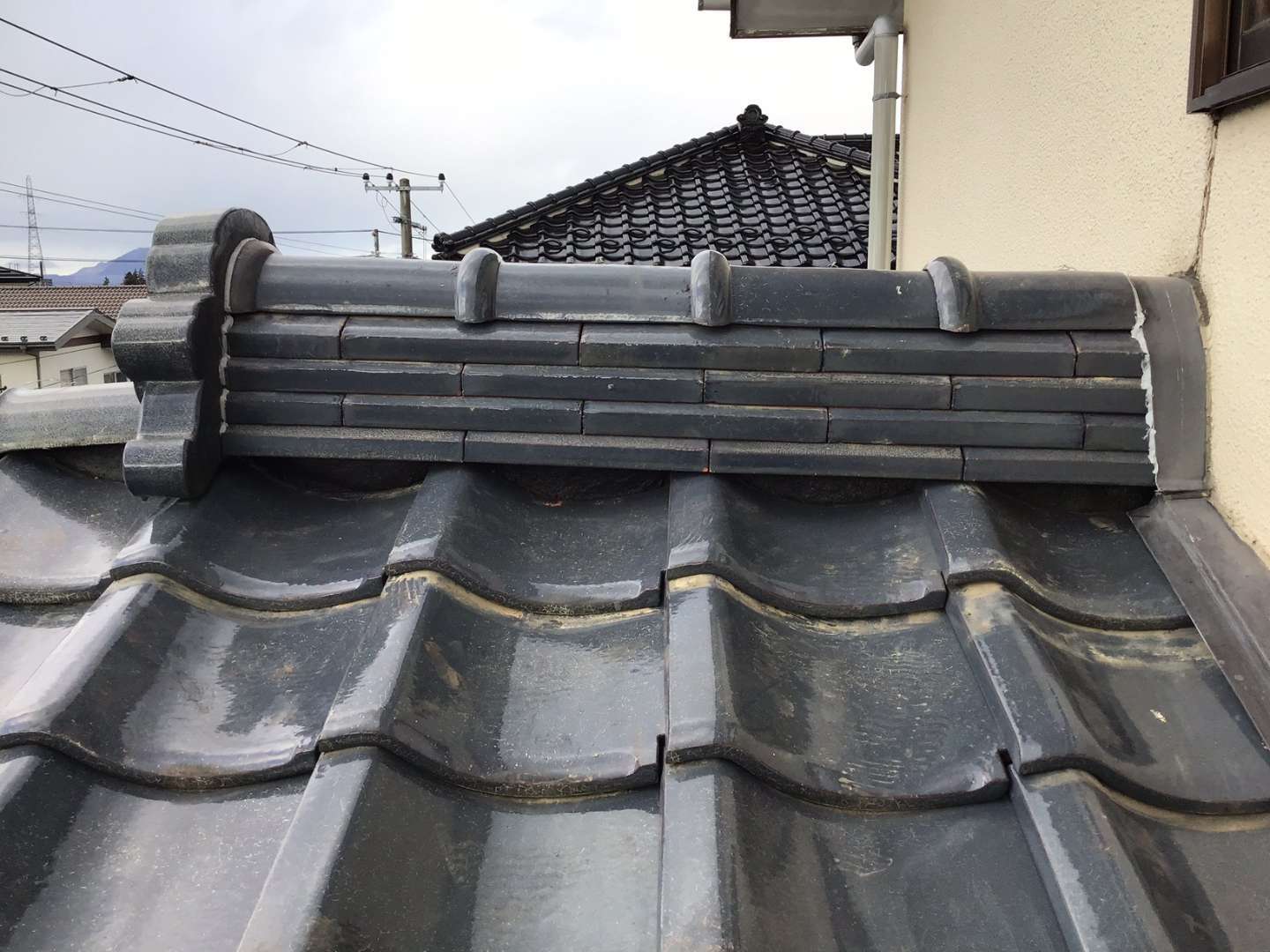 本日は1階屋根瓦屋根の棟取り直し・雨漏れ箇所の修理です。