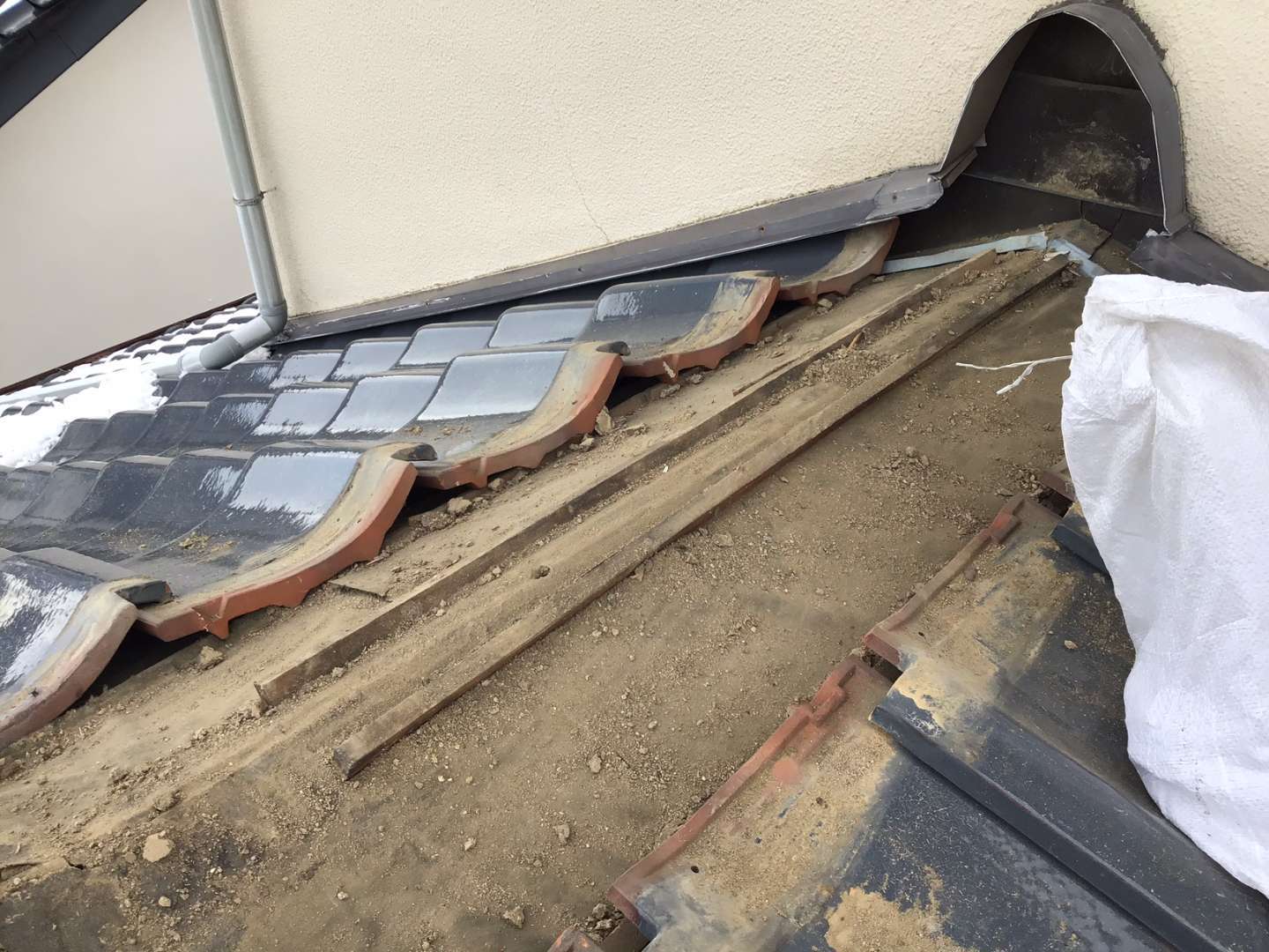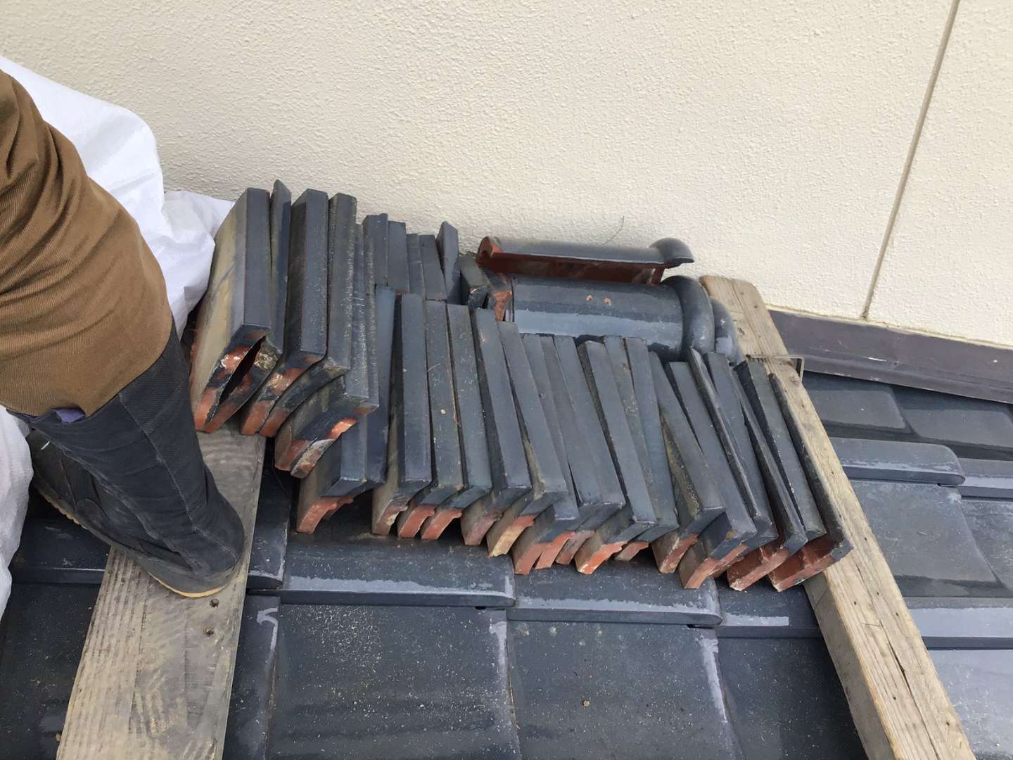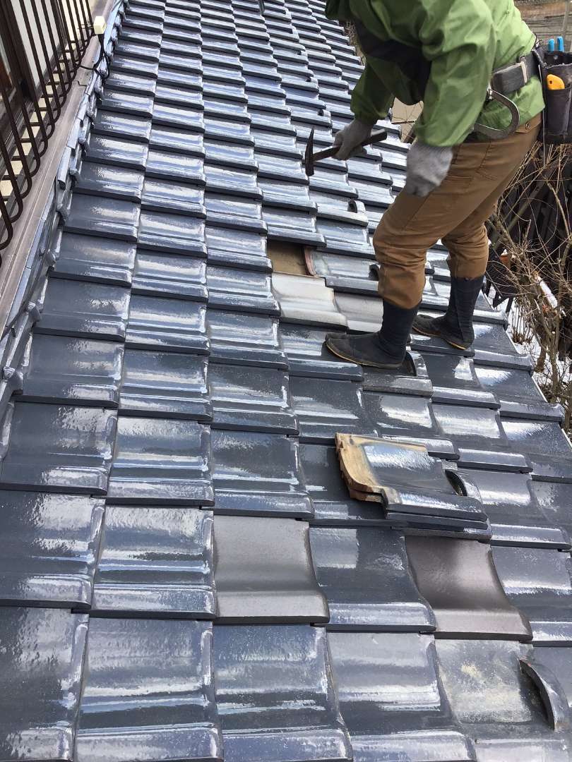 雨漏れ箇所の瓦取り外し作業