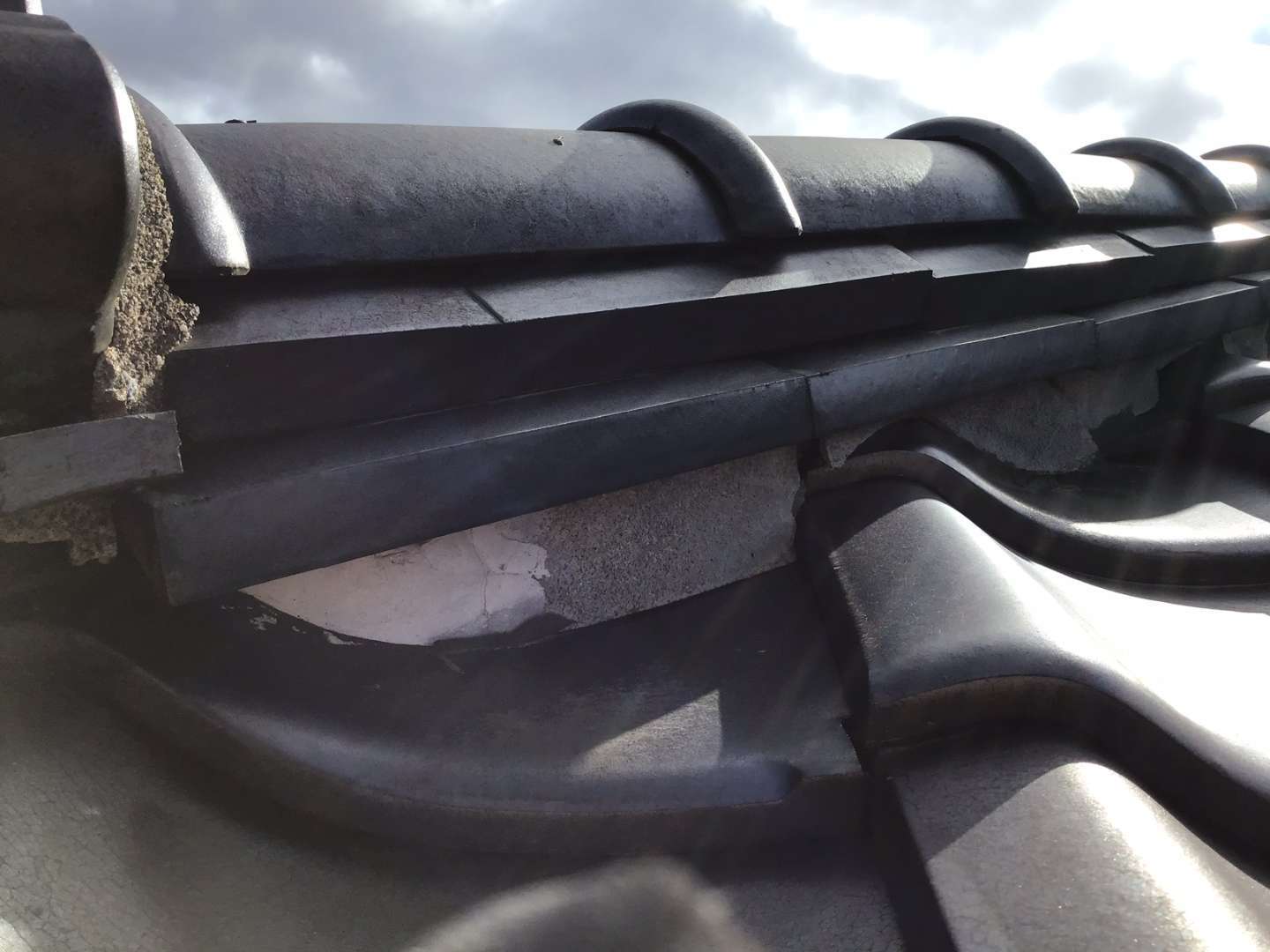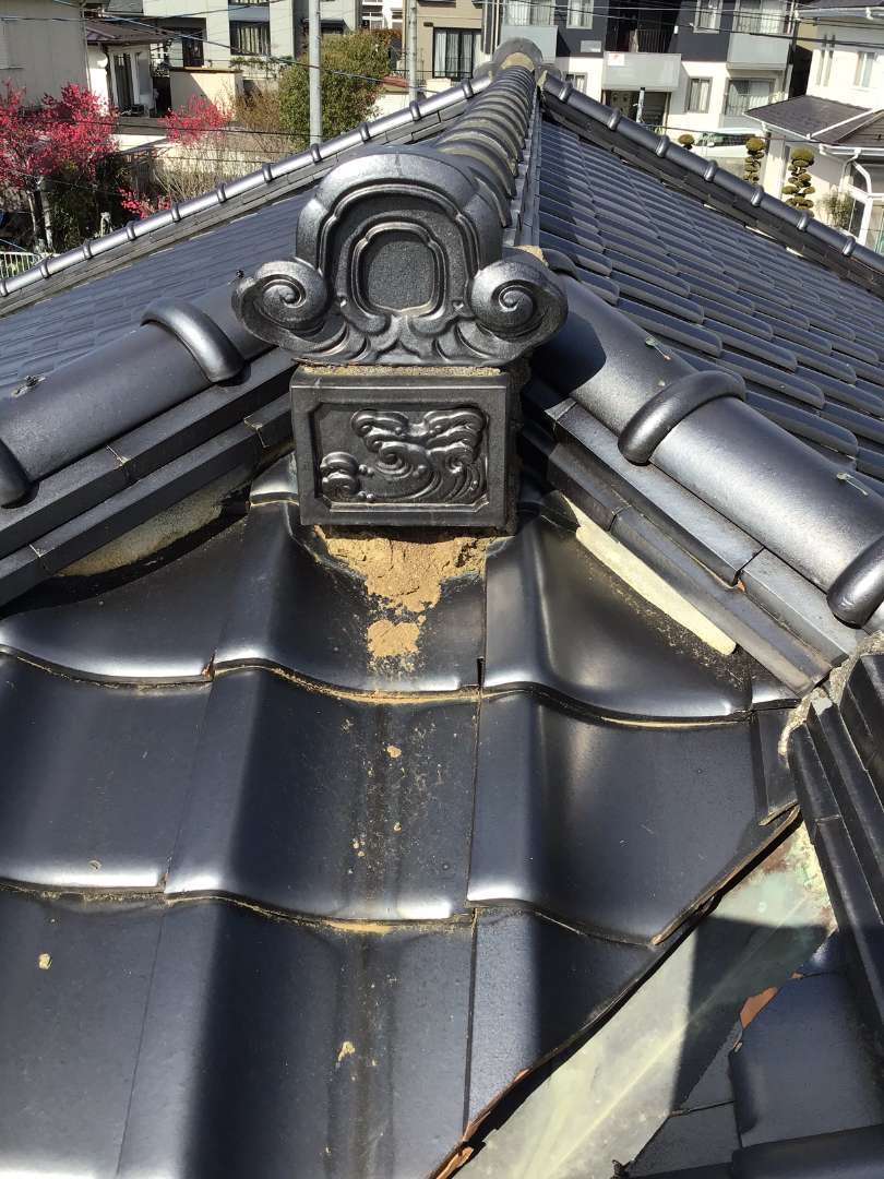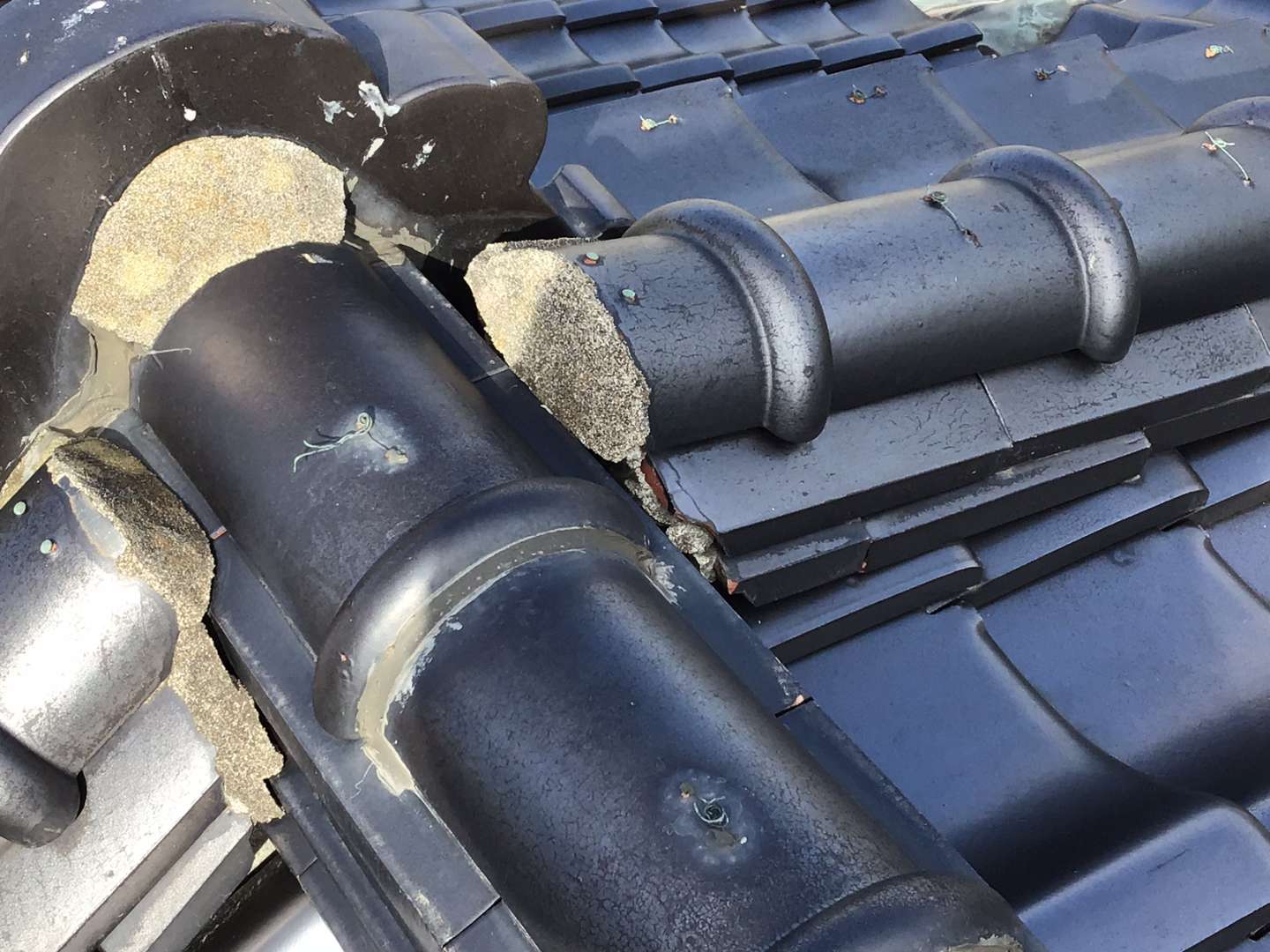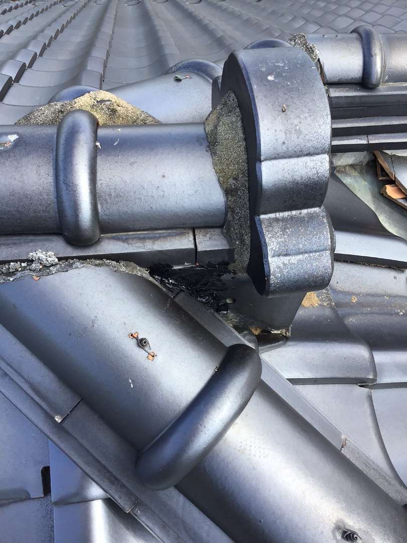 瓦屋根棟のずれ、シックイの剥がれの補修作業です。
