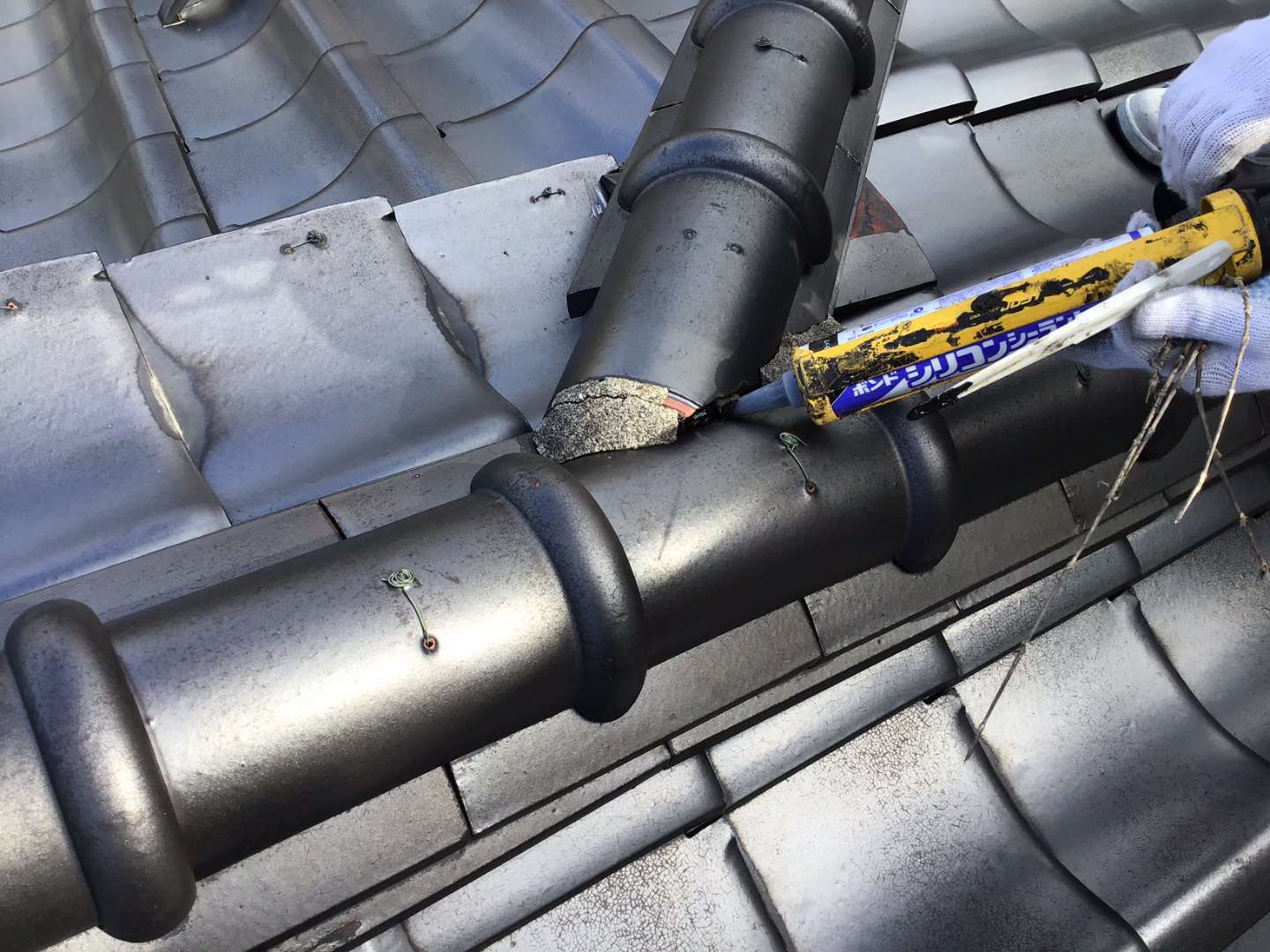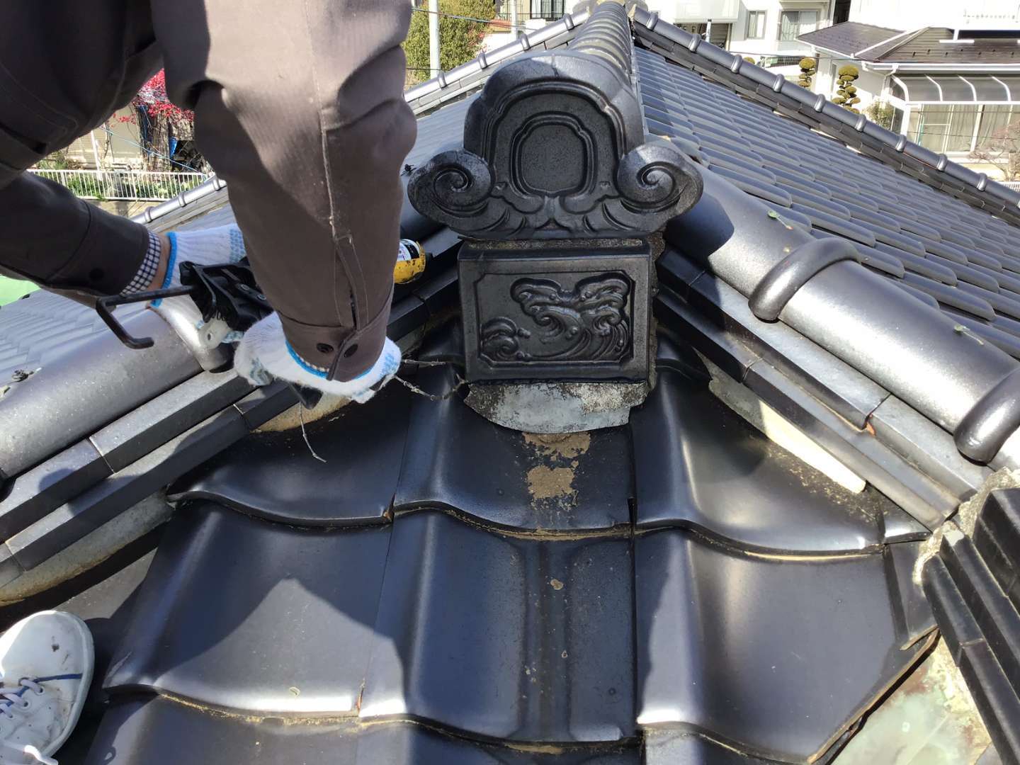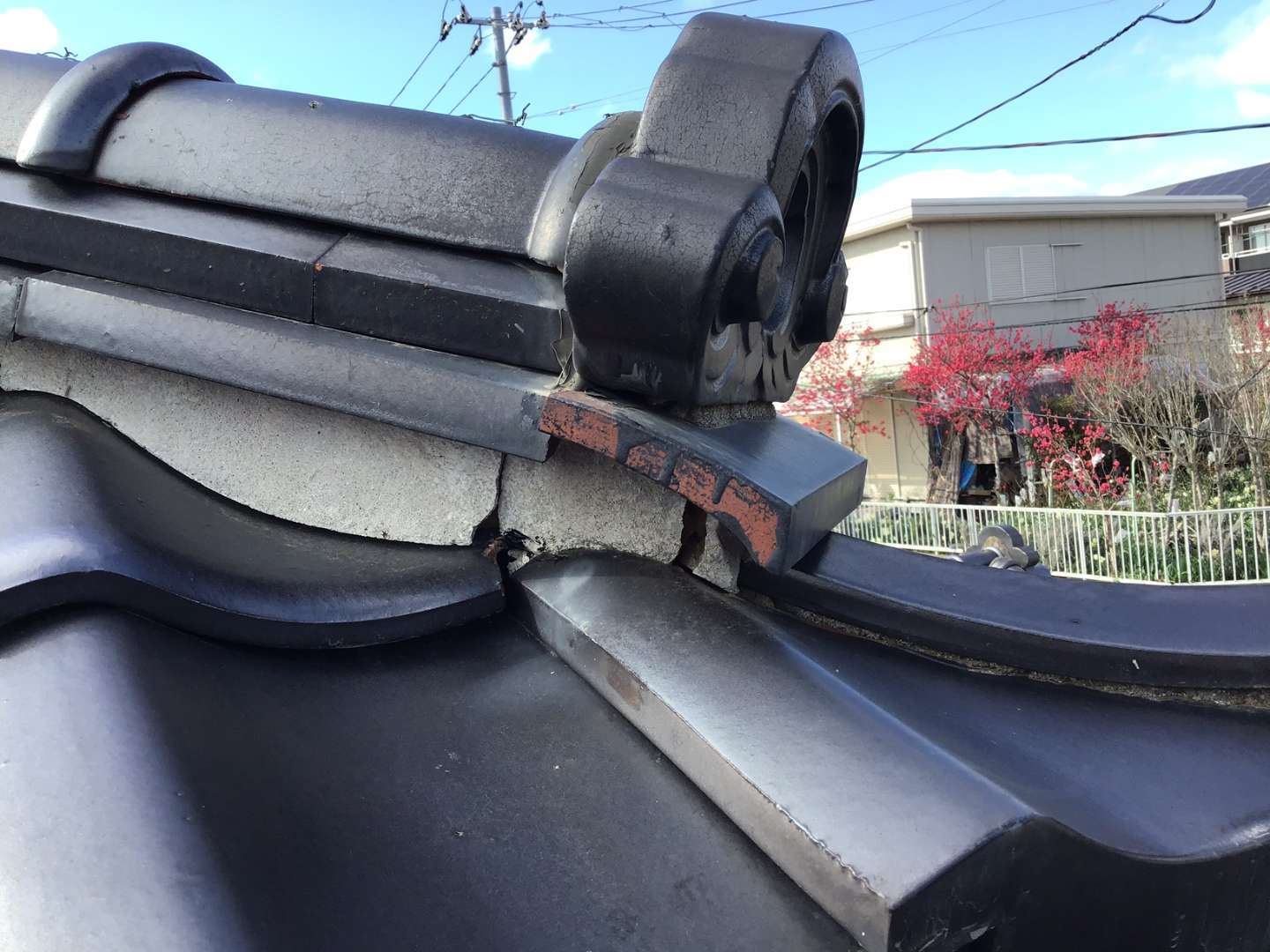 瓦屋根棟のずれ、シックイの剥がれの補修作業です。