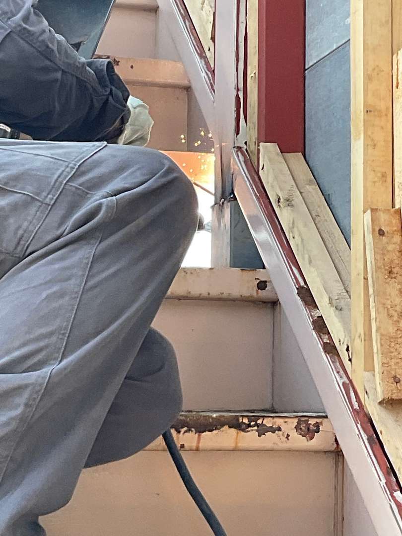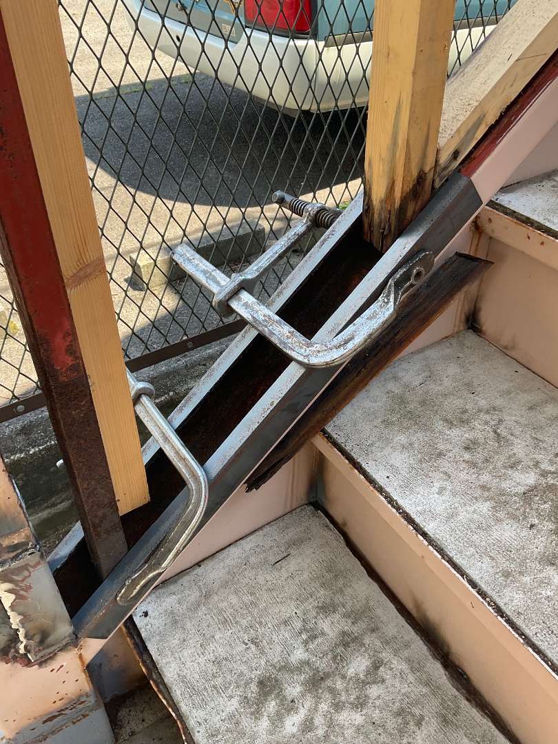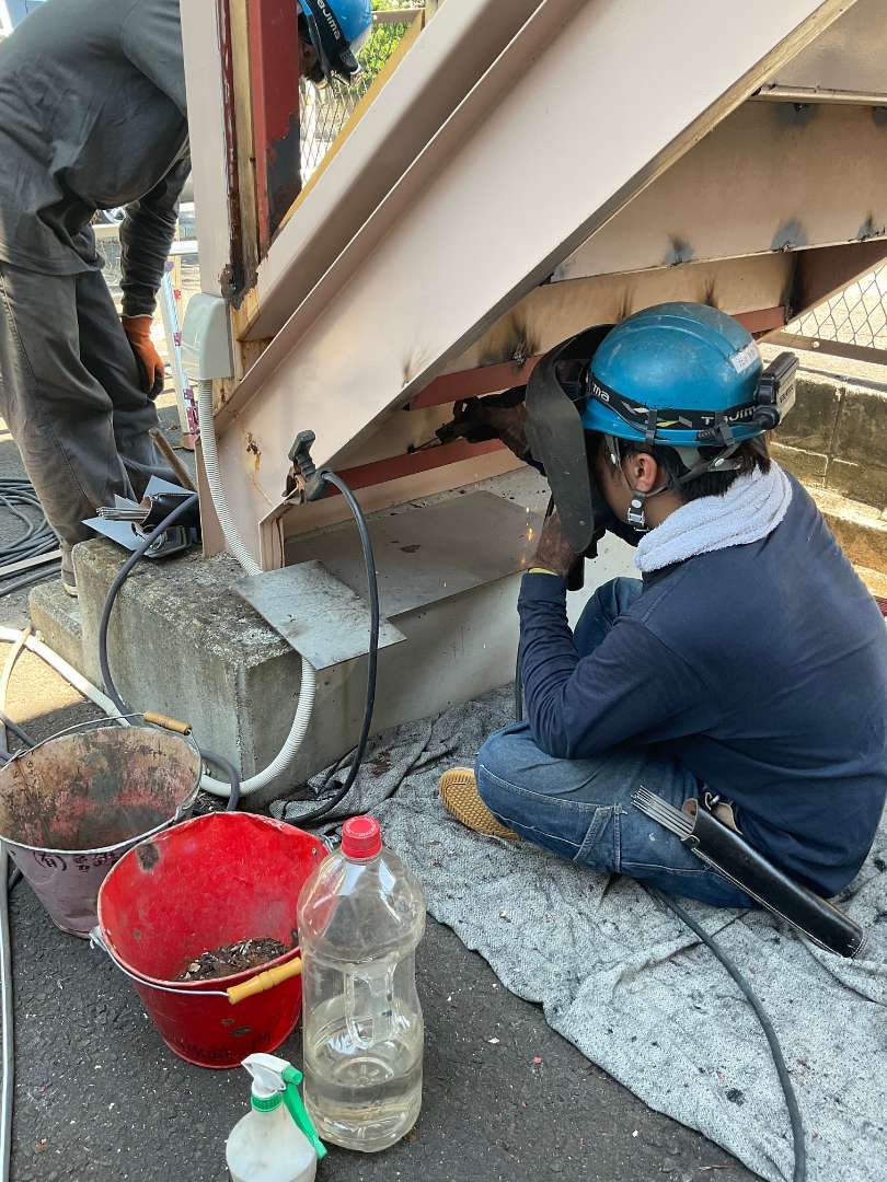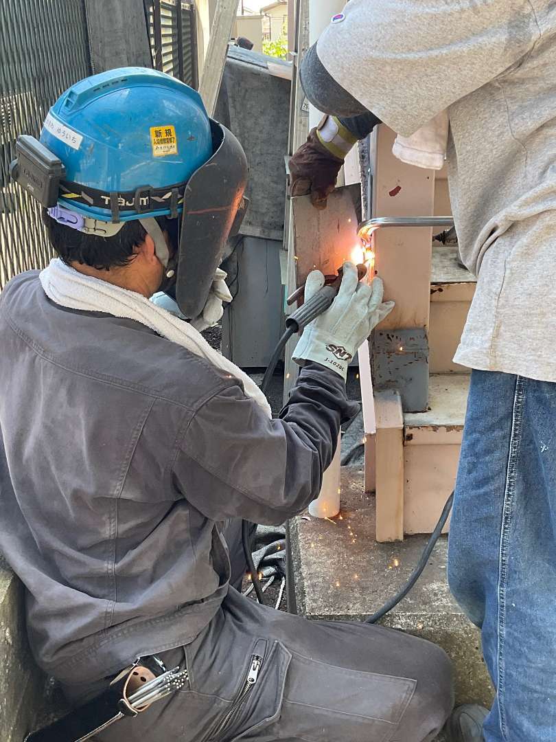 階段裏面鉄骨製のアングル材溶接作業