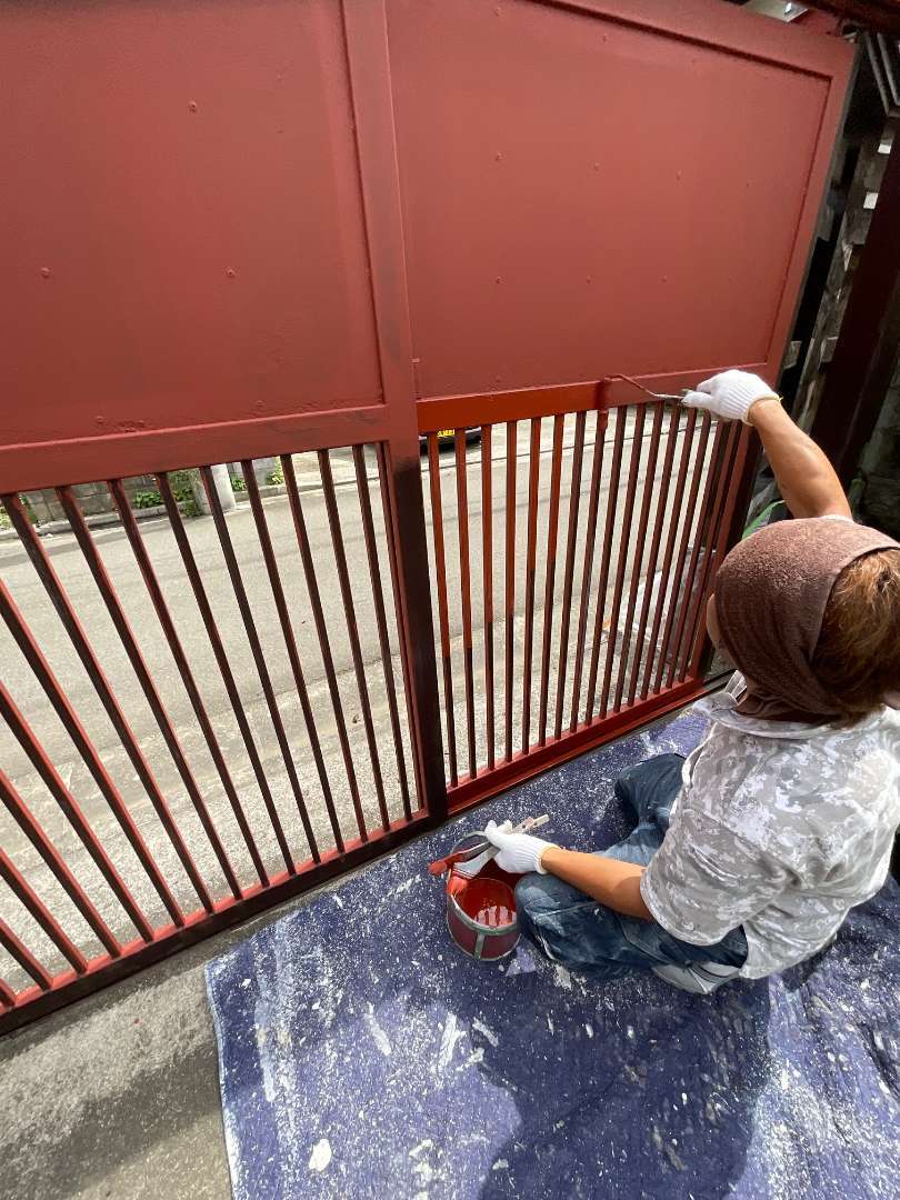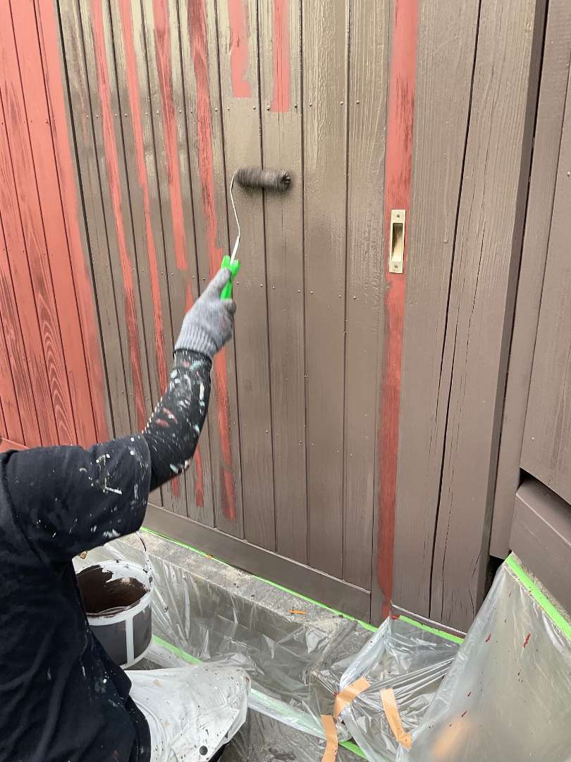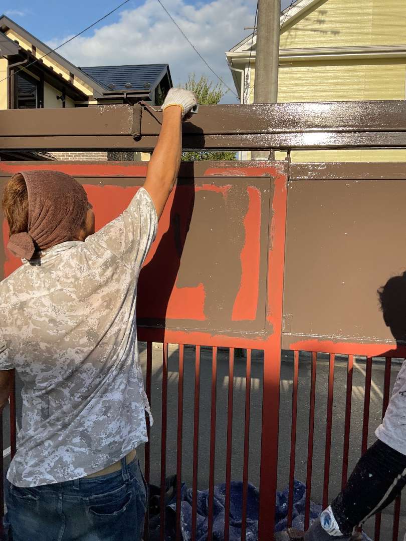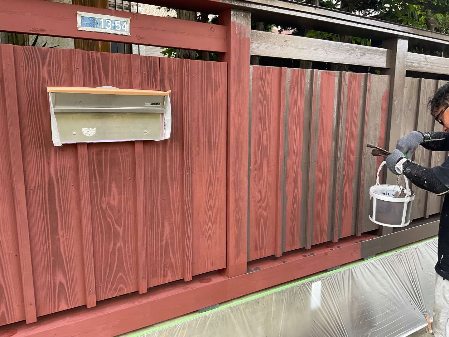 本日の作業は塀木部(下塗り・中塗り)・車庫入口門扉(錆止め・中塗り)・玄関木部(下塗り)作業です。