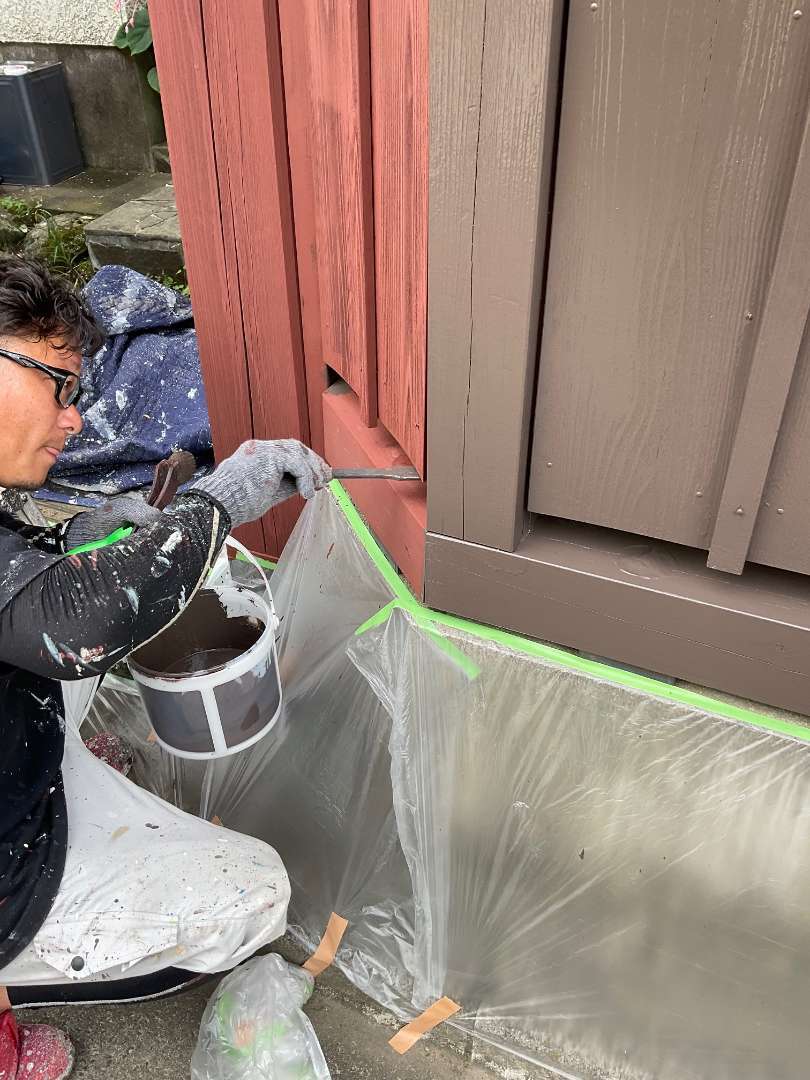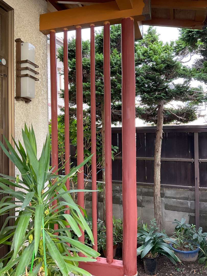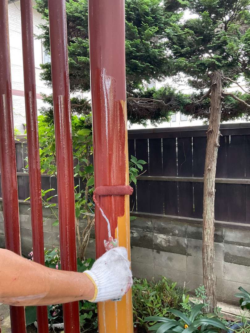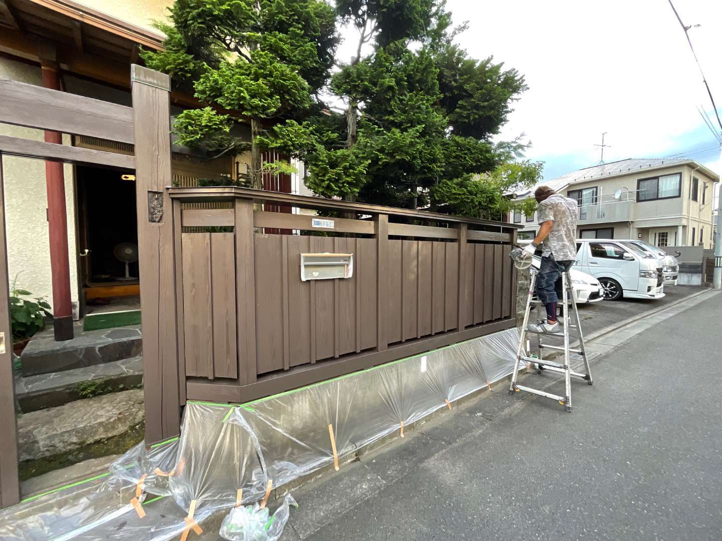 本日の作業は塀木部(下塗り・中塗り)・車庫入口門扉(錆止め・中塗り)・玄関木部(下塗り)作業です。