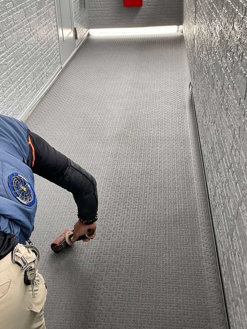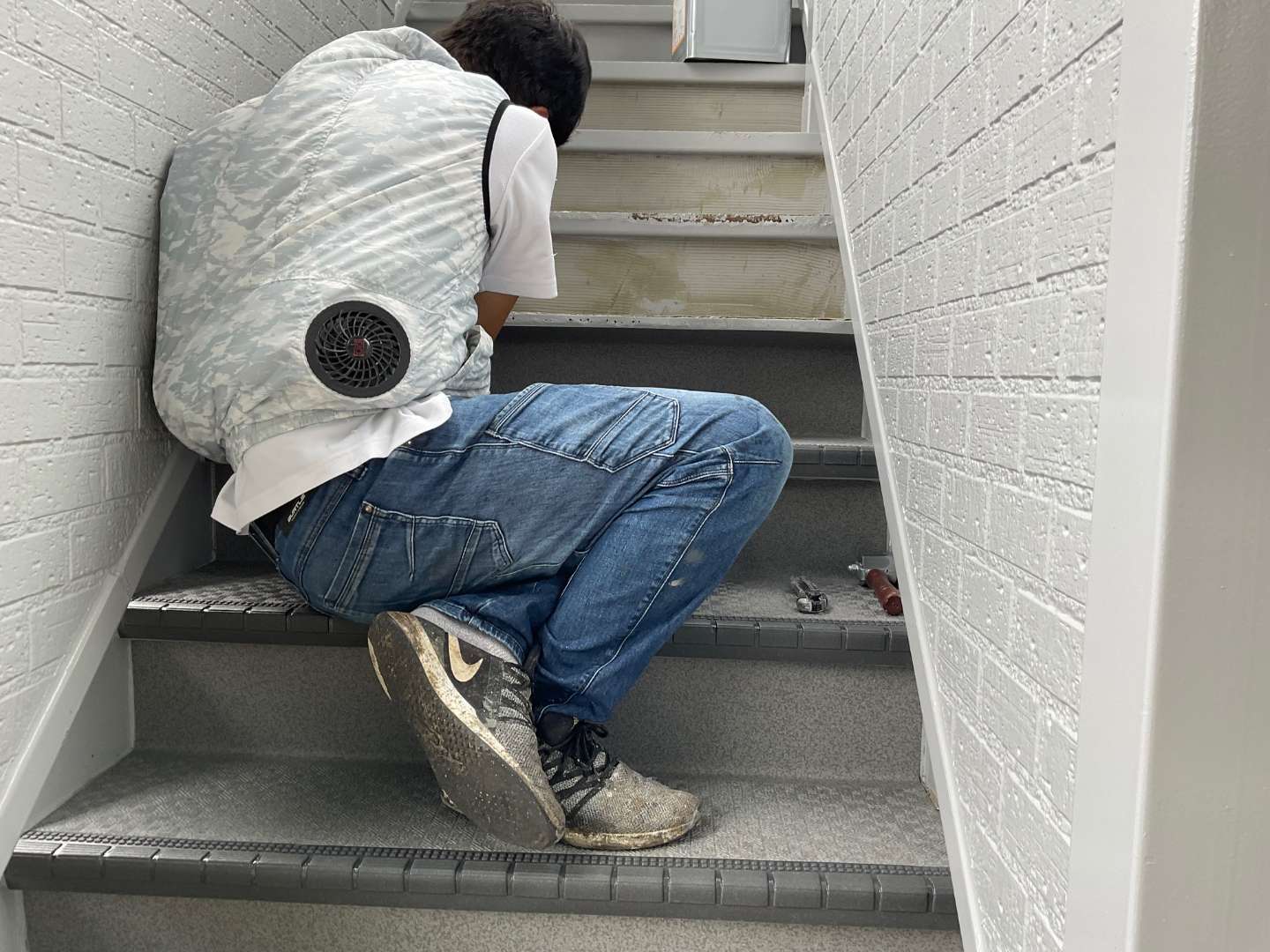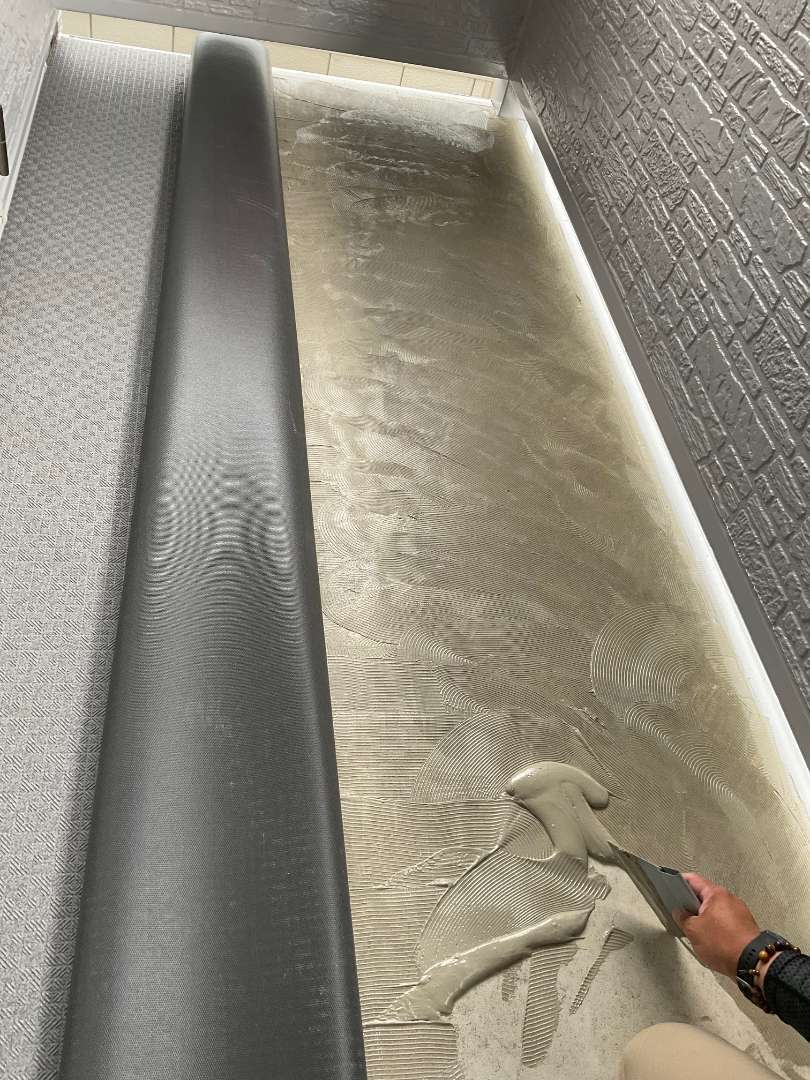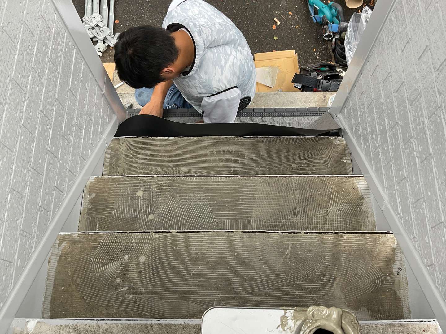本日は階段・2階廊下化粧シート材(長尺シート)張り方作業です。