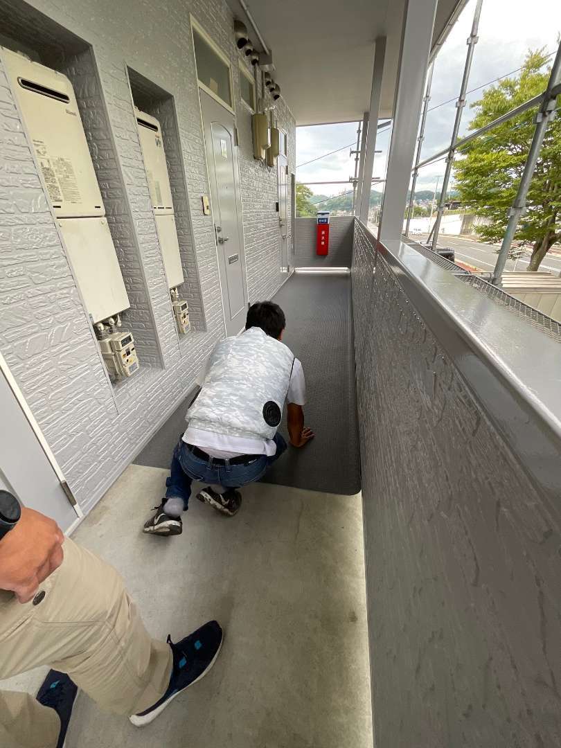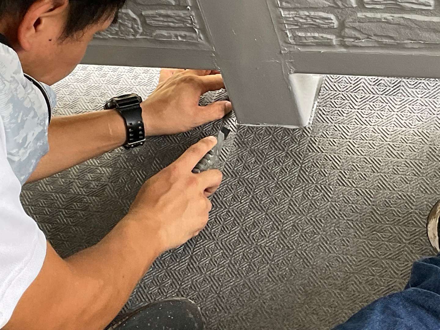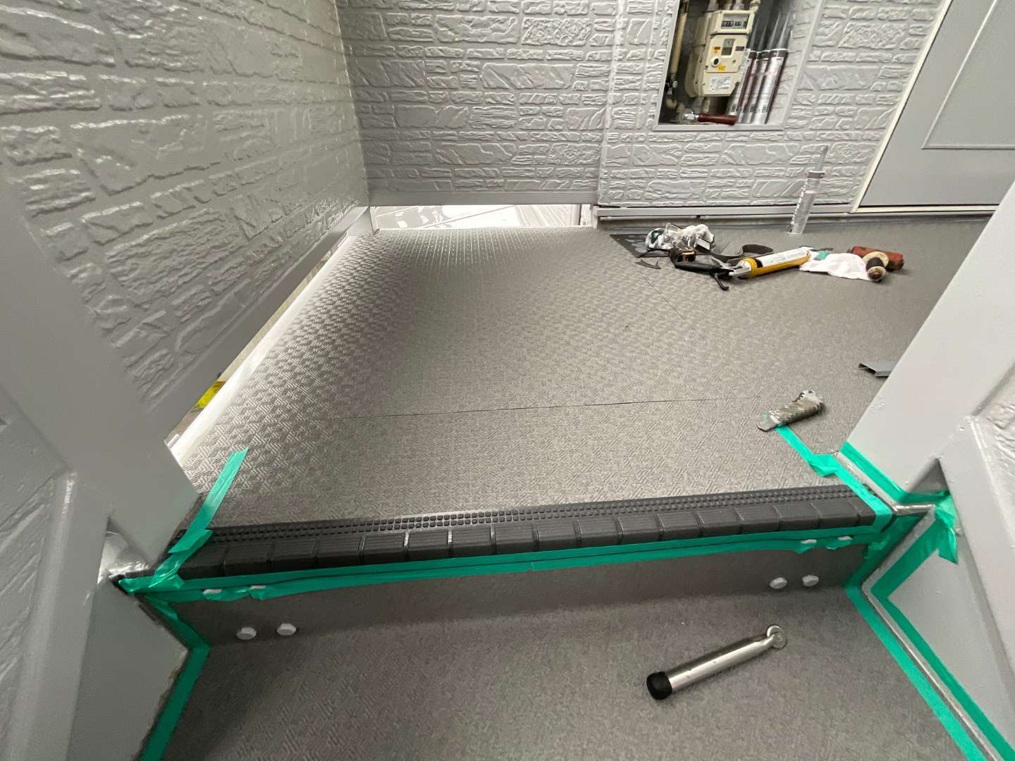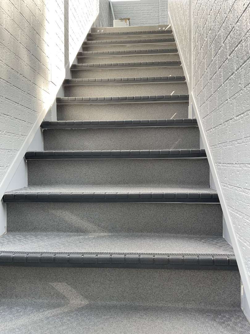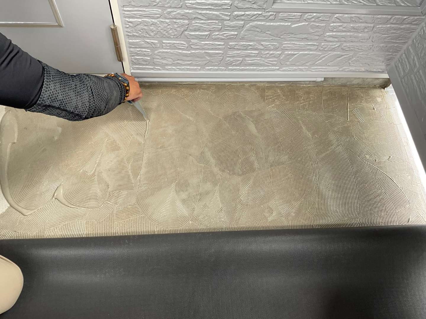 本日は階段・2階廊下化粧シート材(長尺シート)張り方作業です。