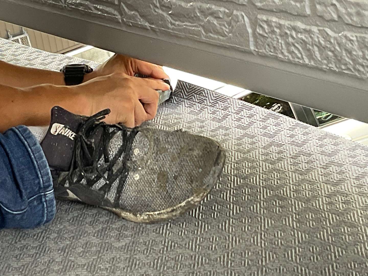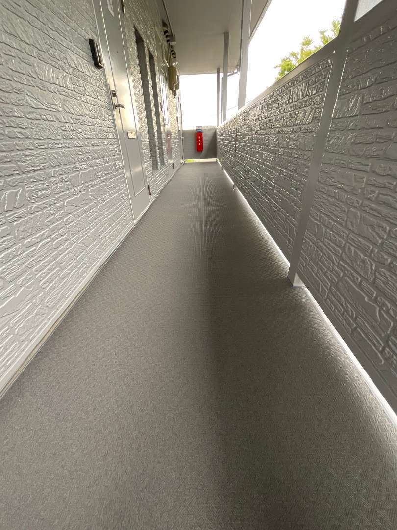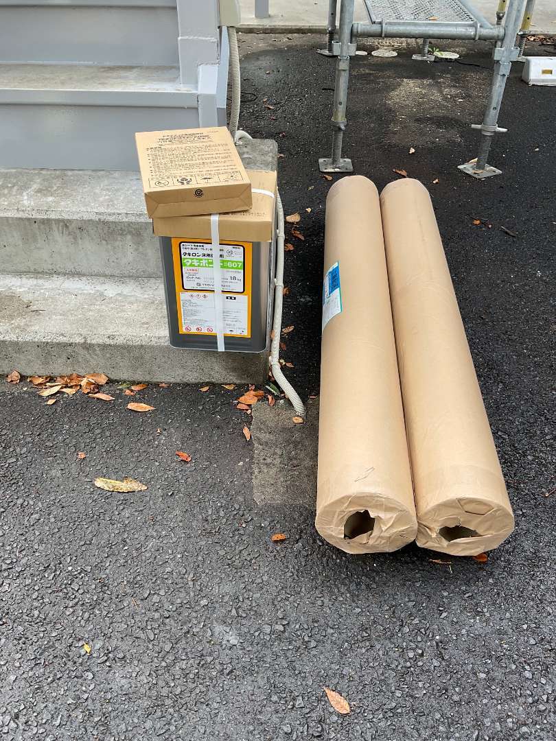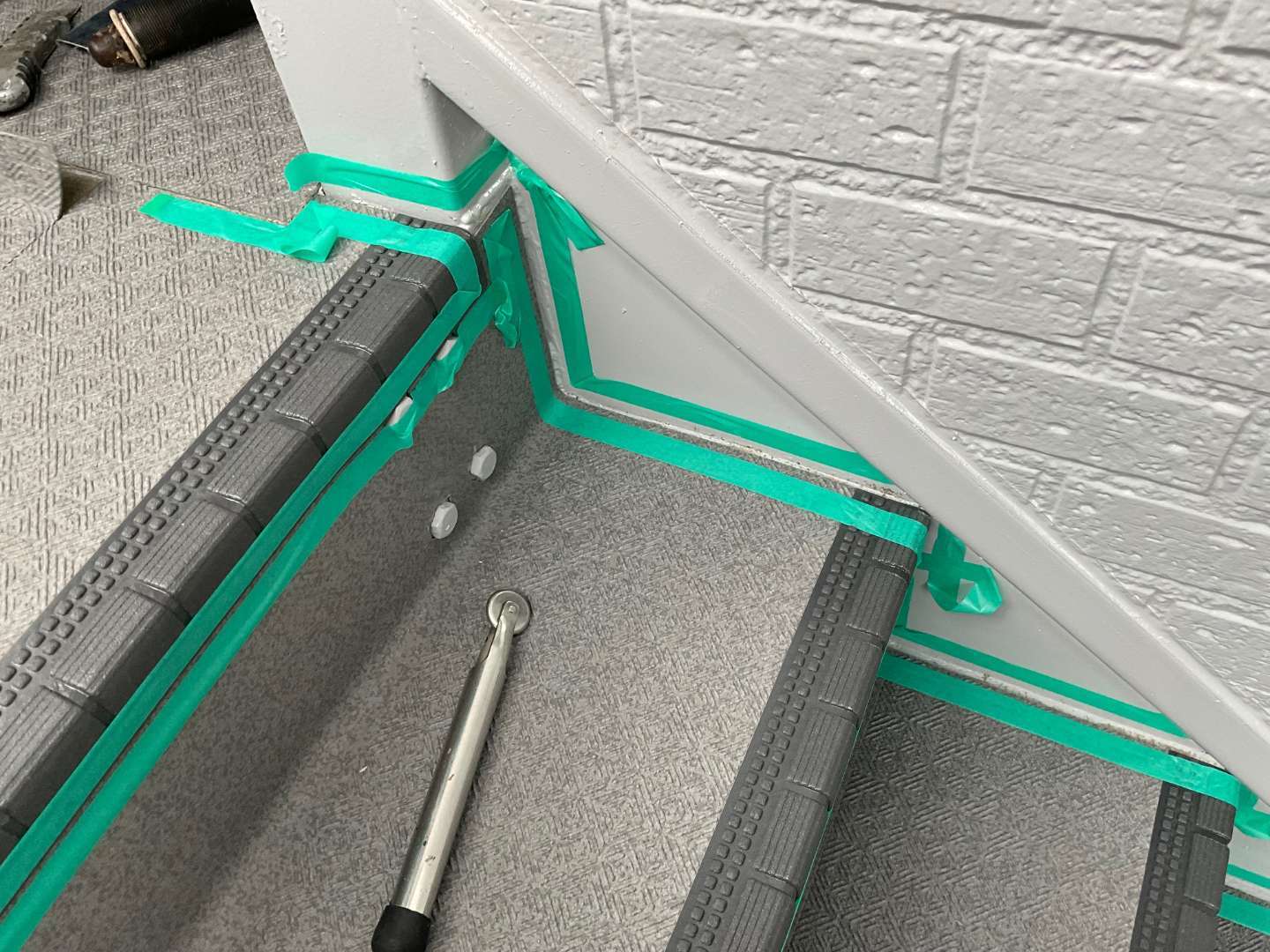 本日は階段・2階廊下化粧シート材(長尺シート)張り方作業です。