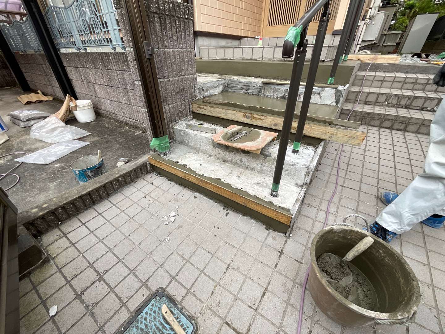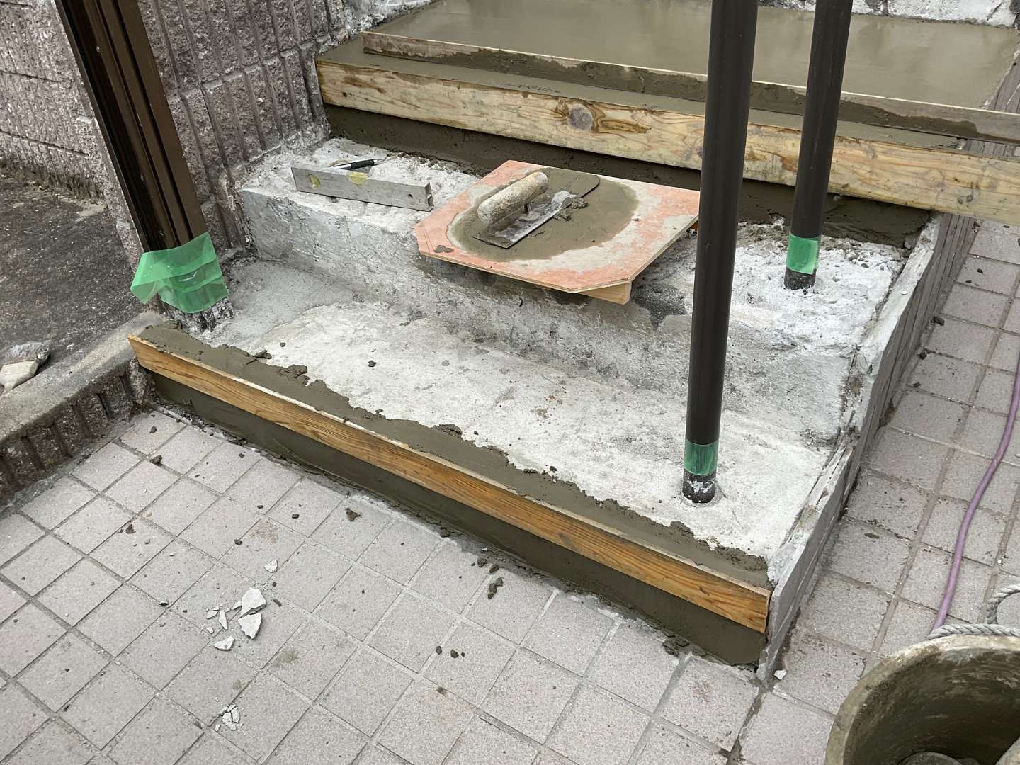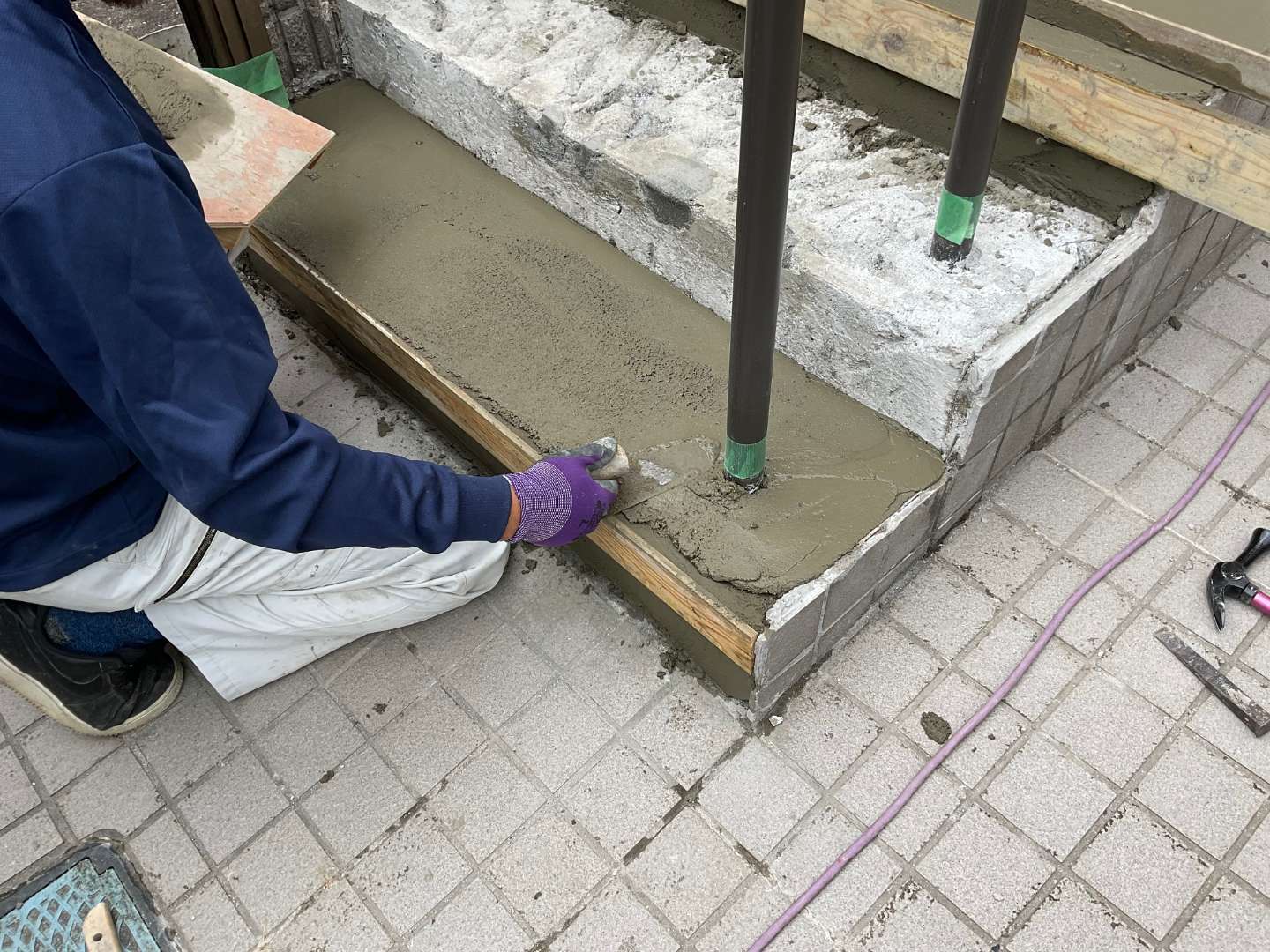 本日の作業は、建物基礎巾木モルタル補修・階段左官モルタル塗りです。