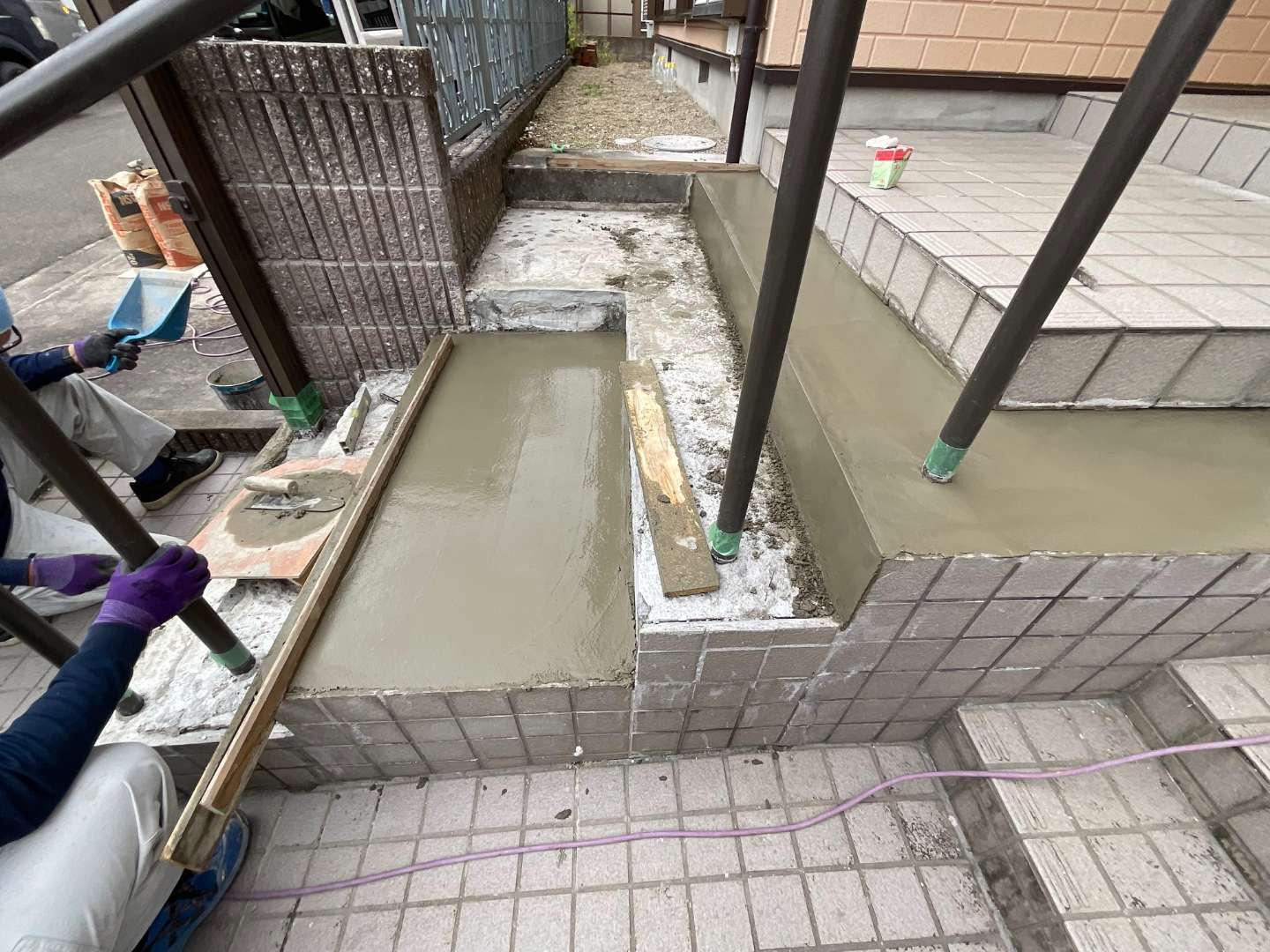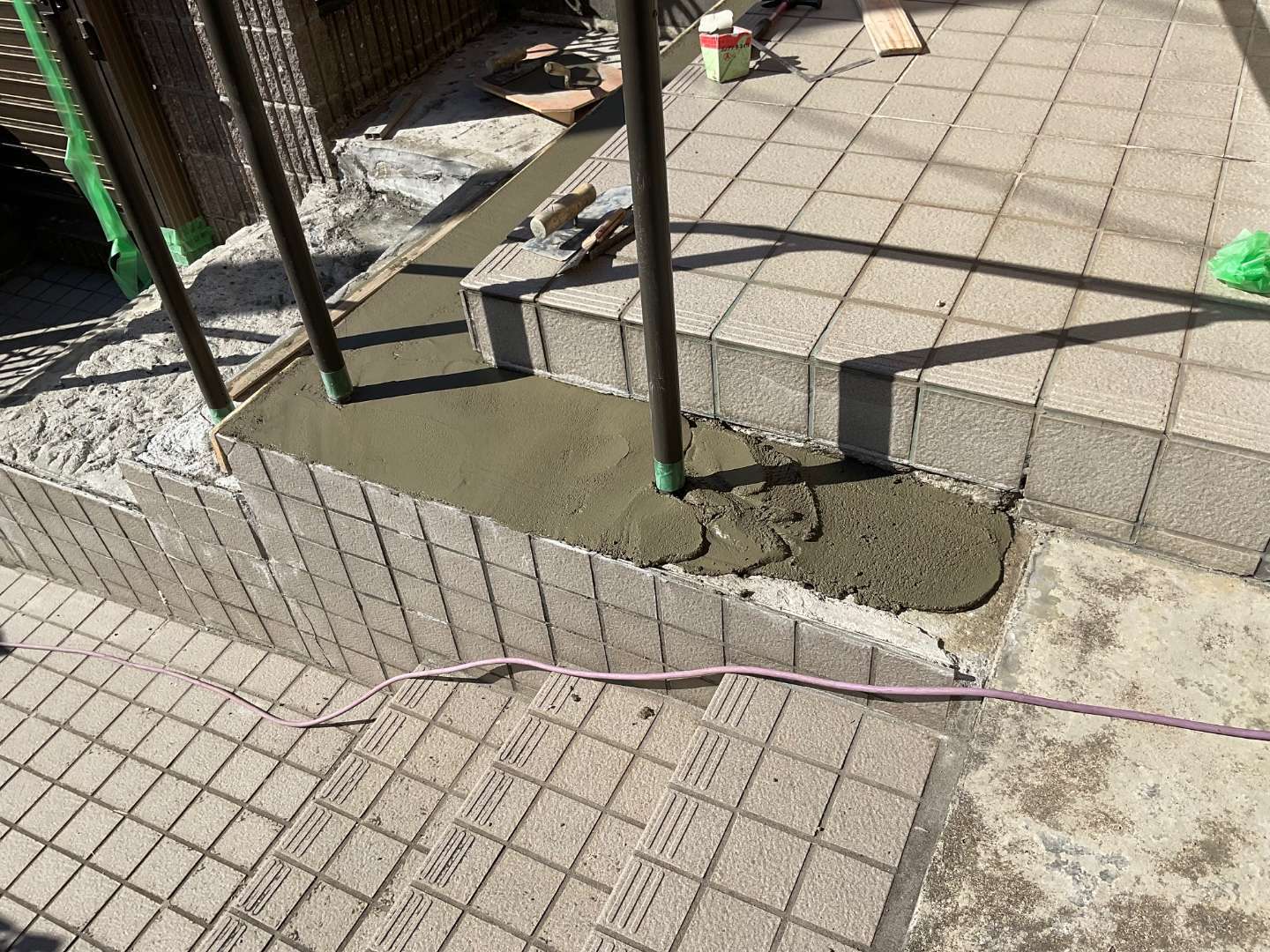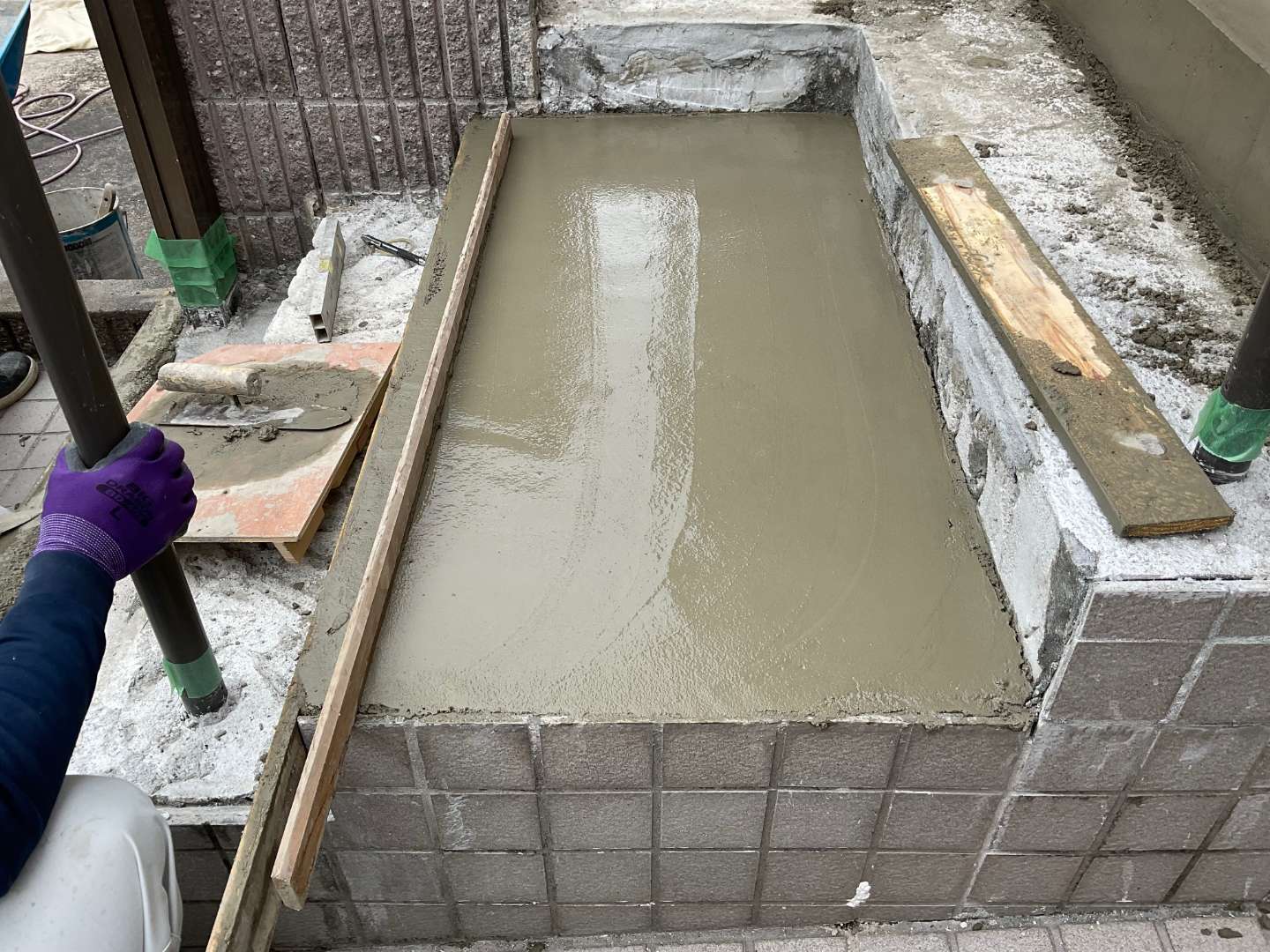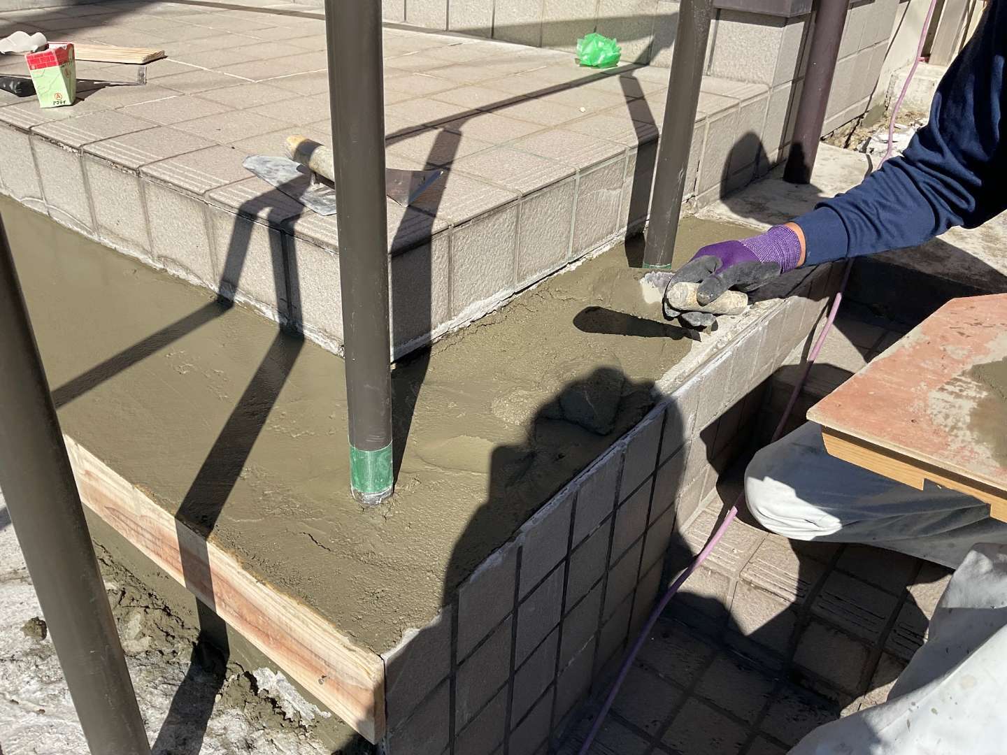 本日の作業は、建物基礎巾木モルタル補修・階段左官モルタル塗りです。