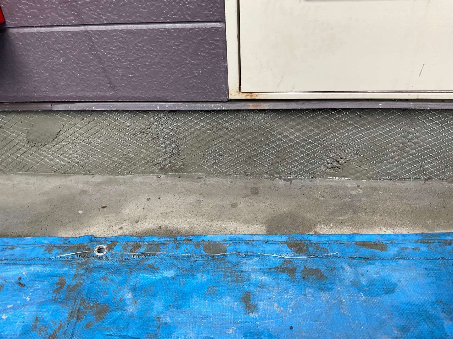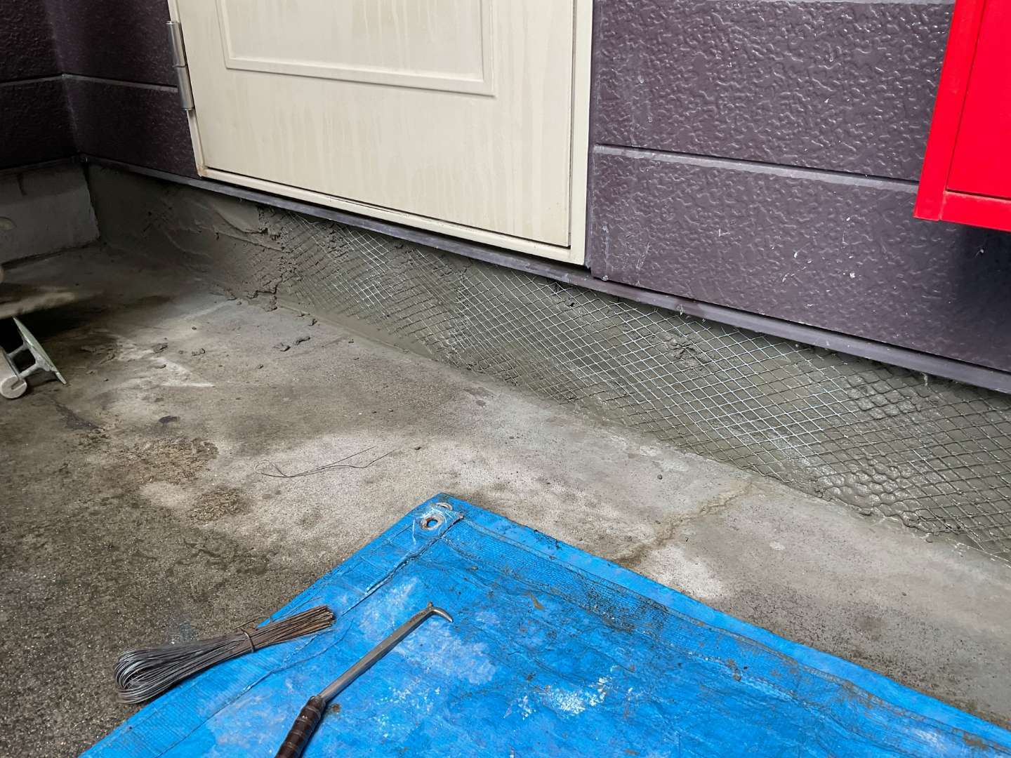 入り口ドア基礎左官工事(メッシュ入れ~モルタル塗り)