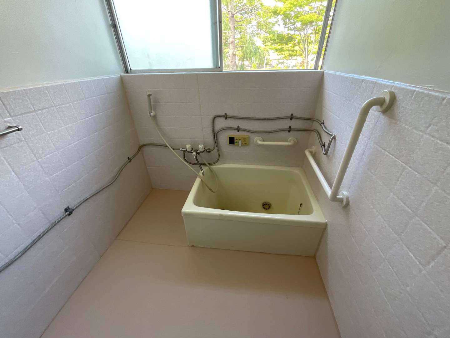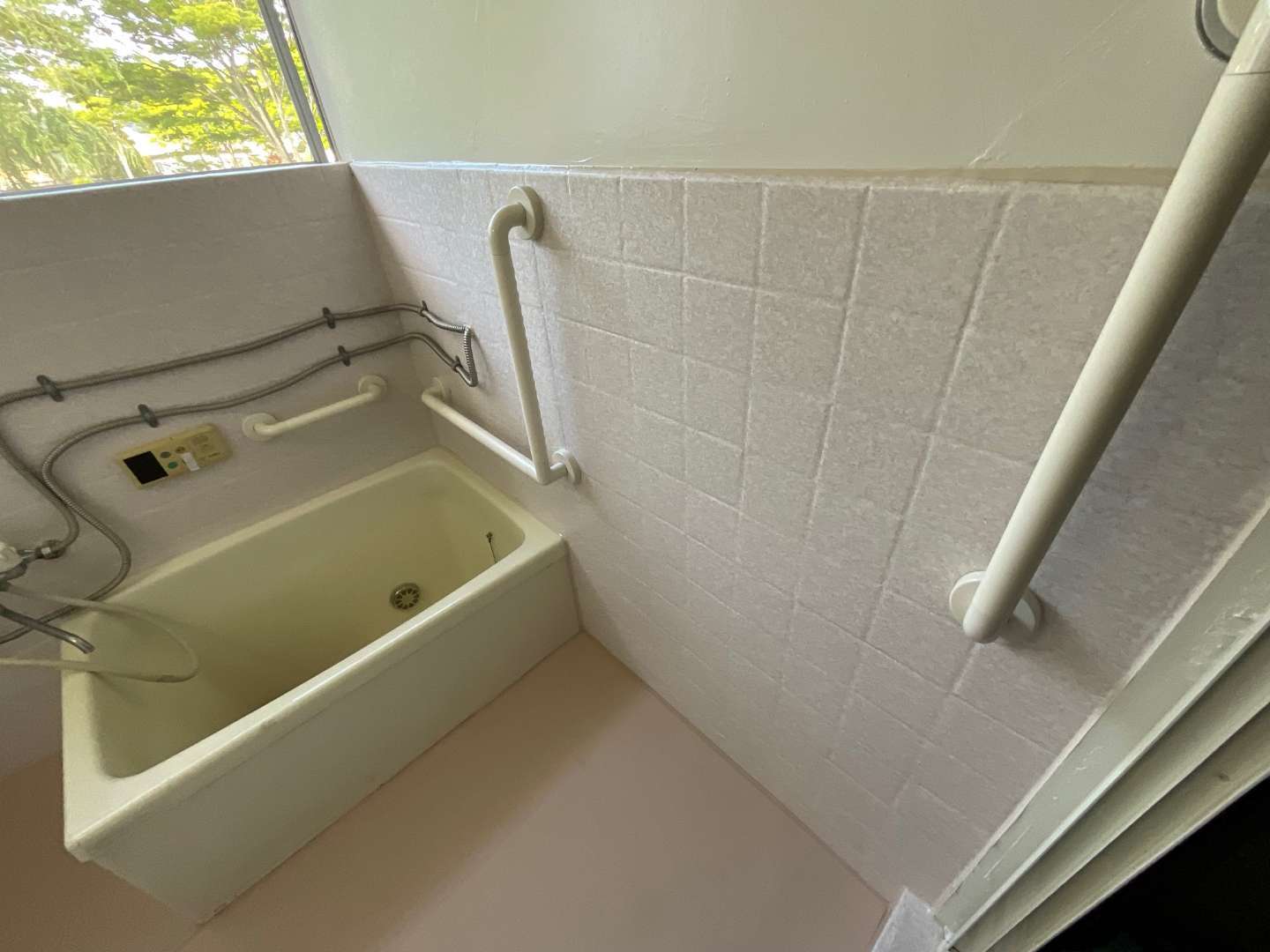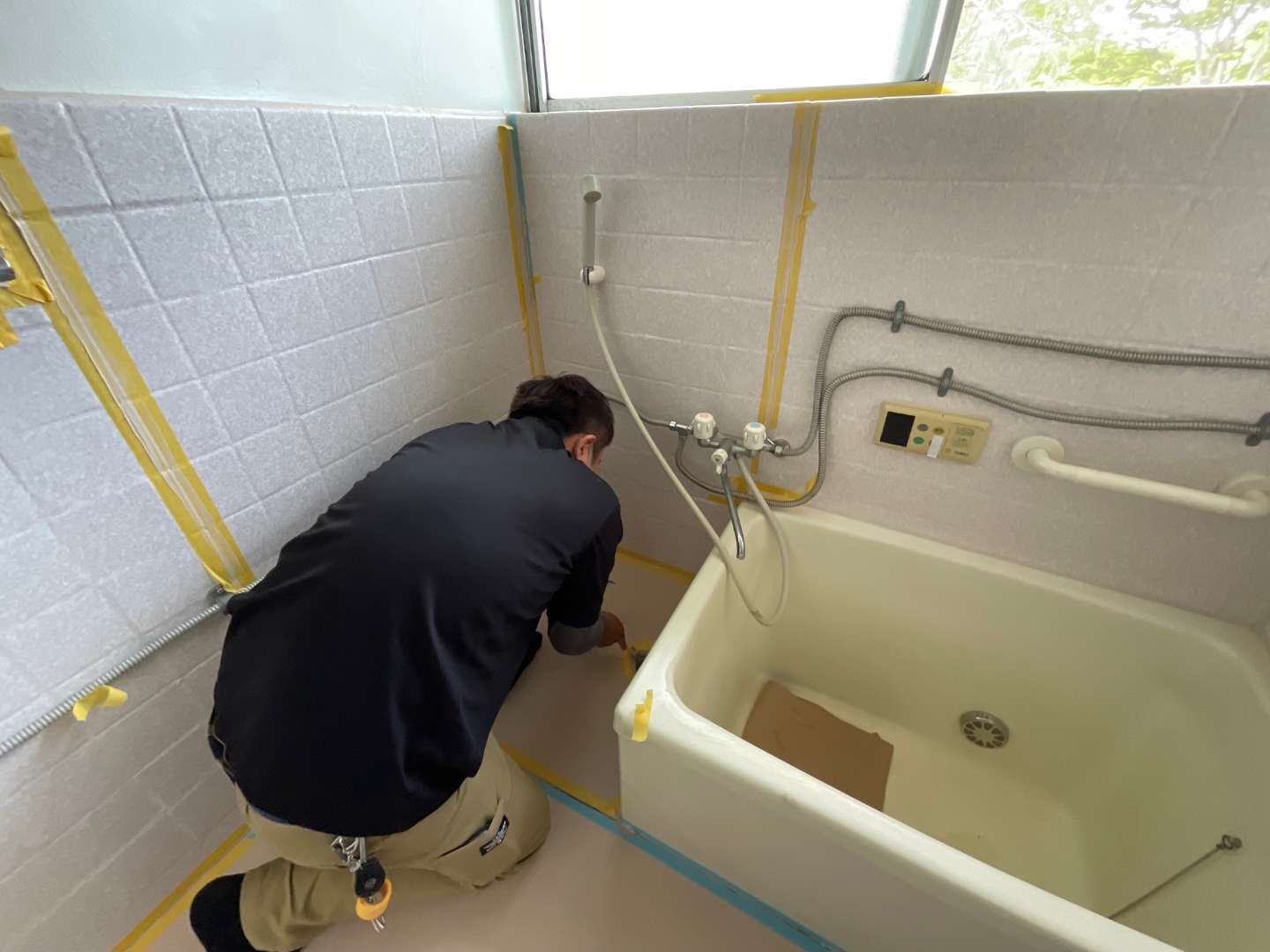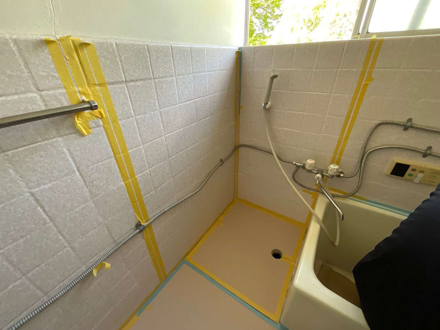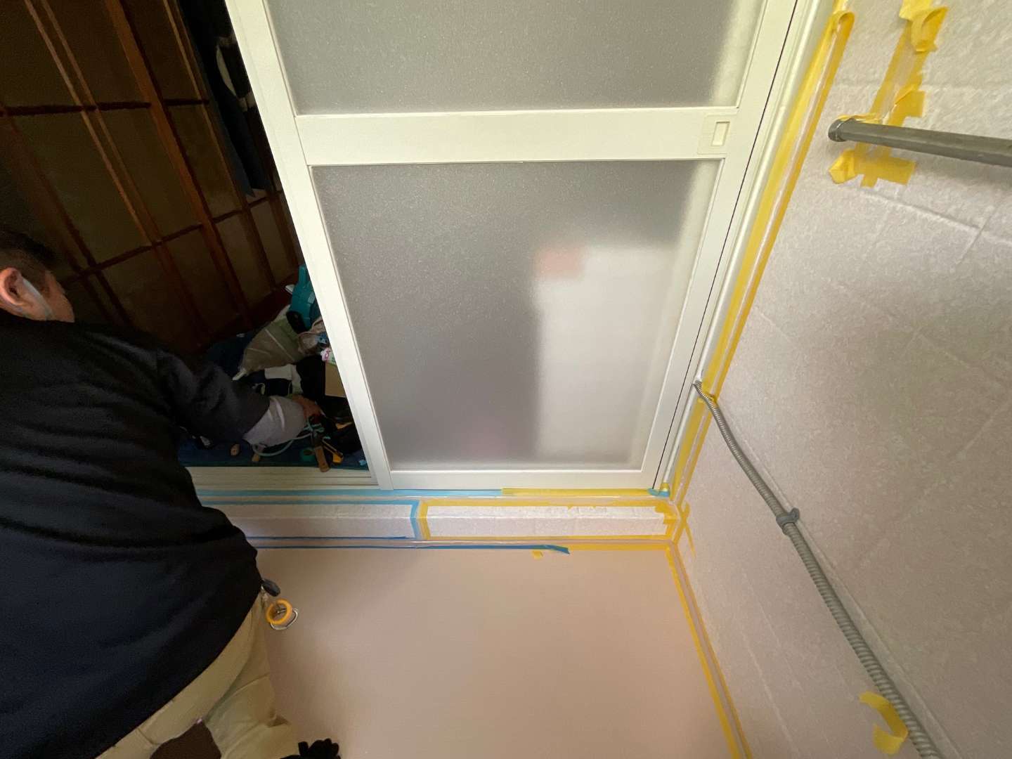 本日の作業は、浴室壁・床化粧シート貼りです。