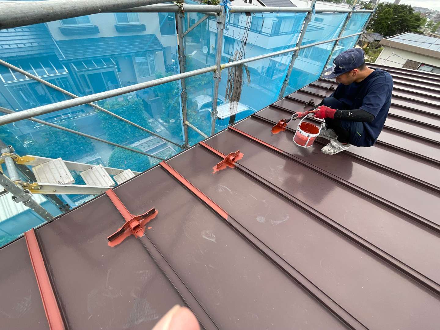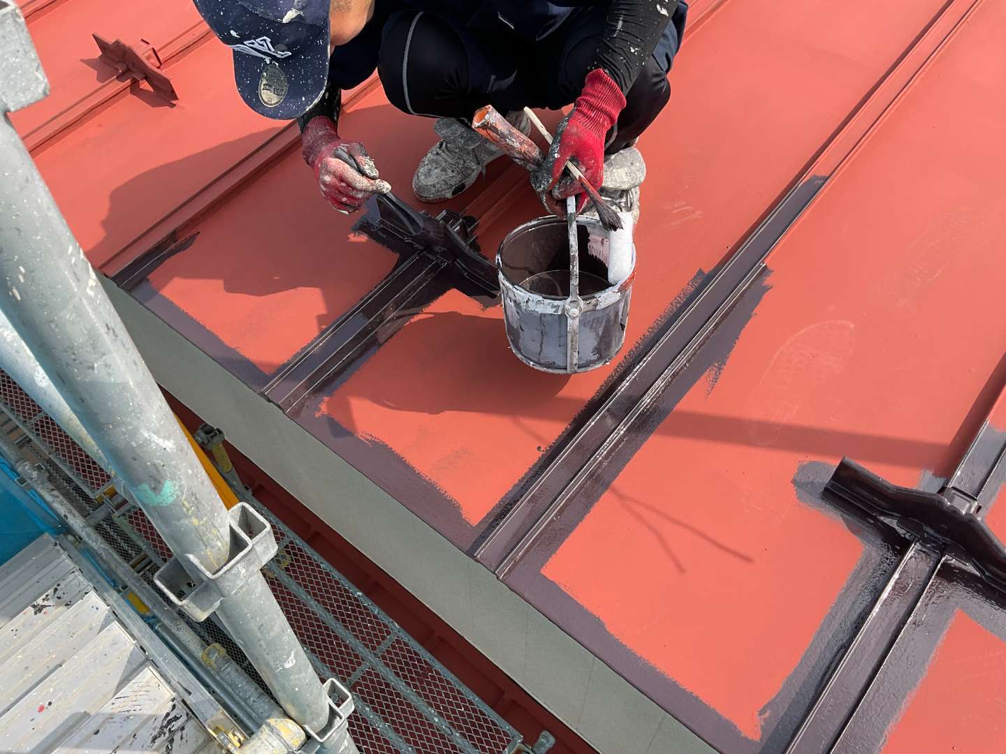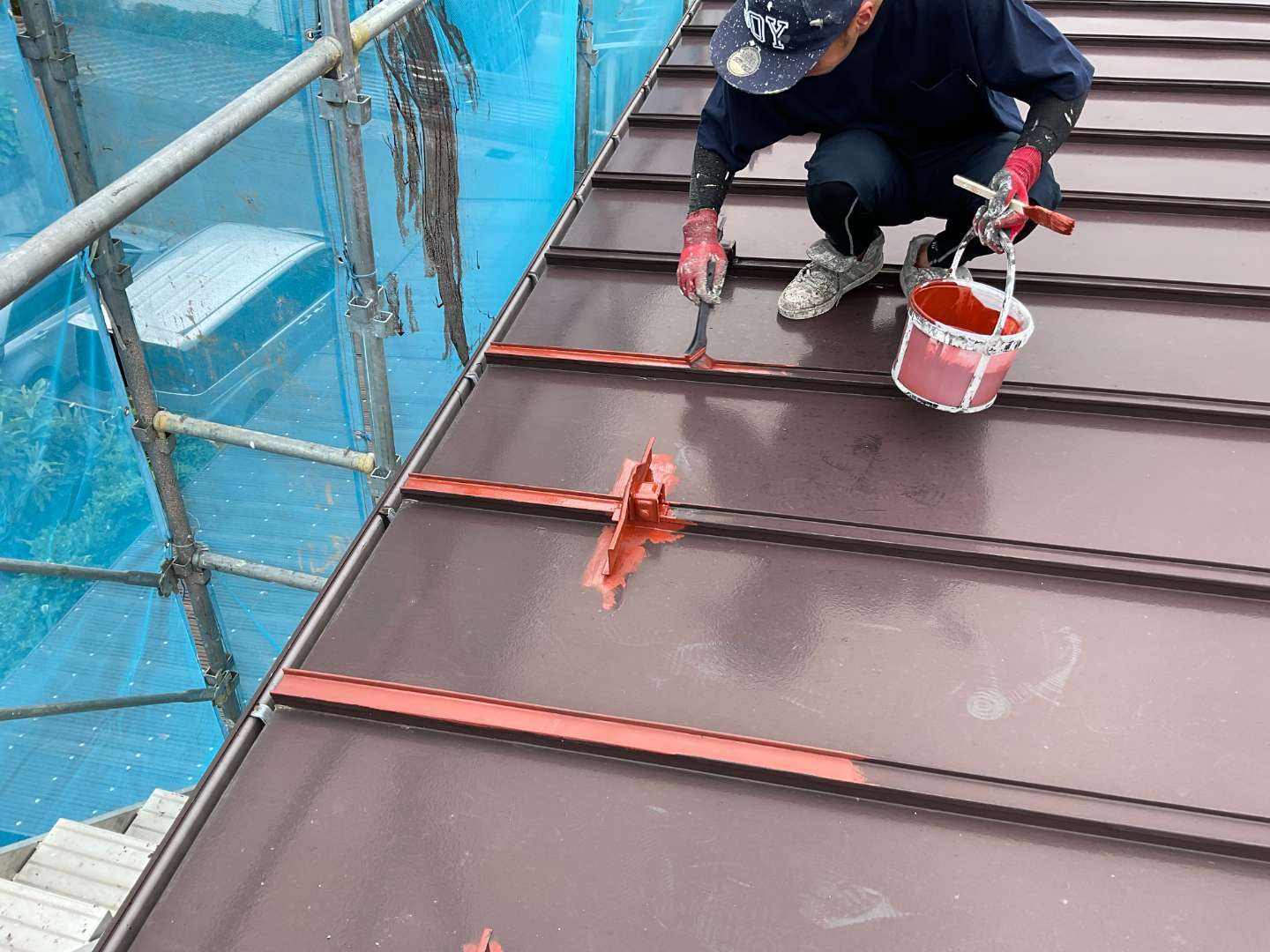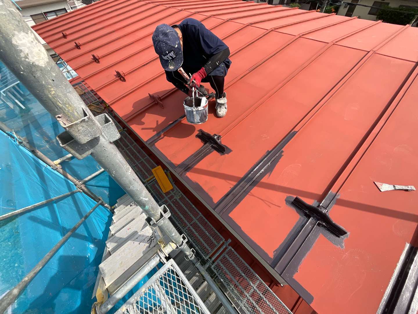 本日の作業は、屋根錆止め塗装:中塗り刷毛入れ塗装です。