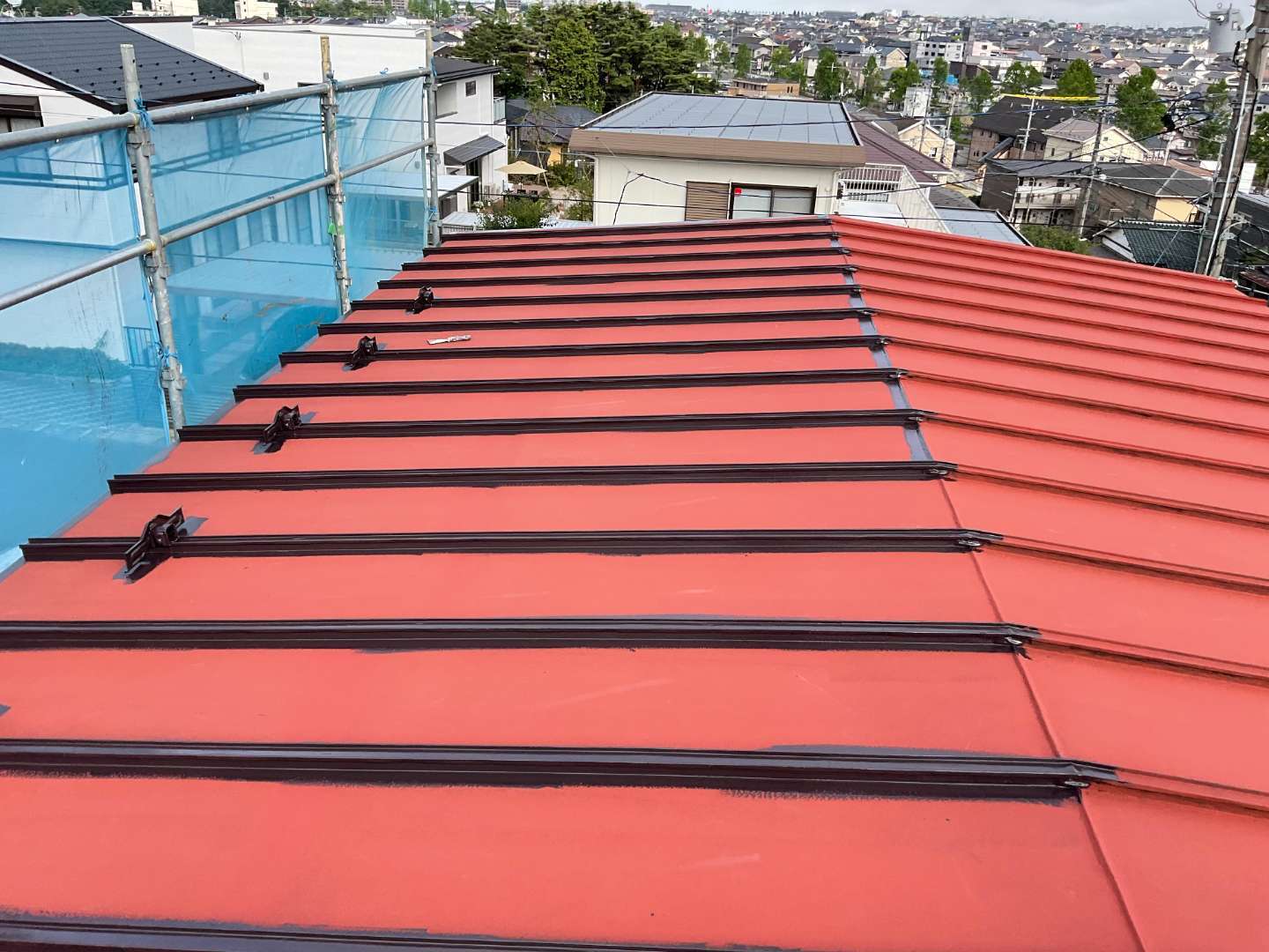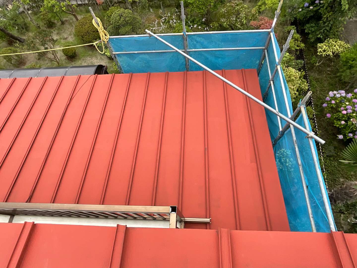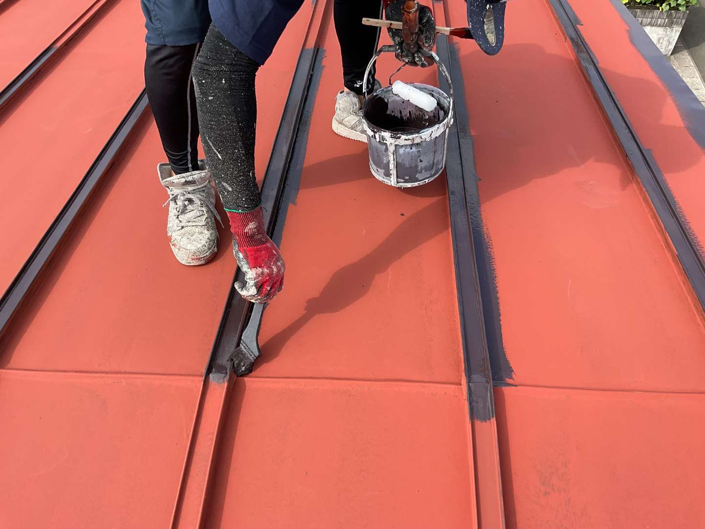 本日の作業は、屋根錆止め塗装:中塗り刷毛入れ塗装です。