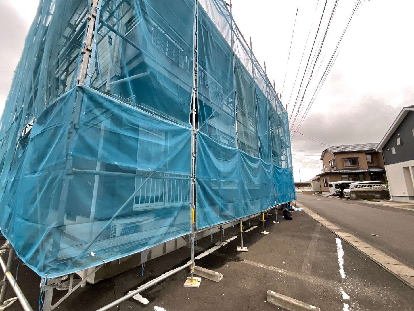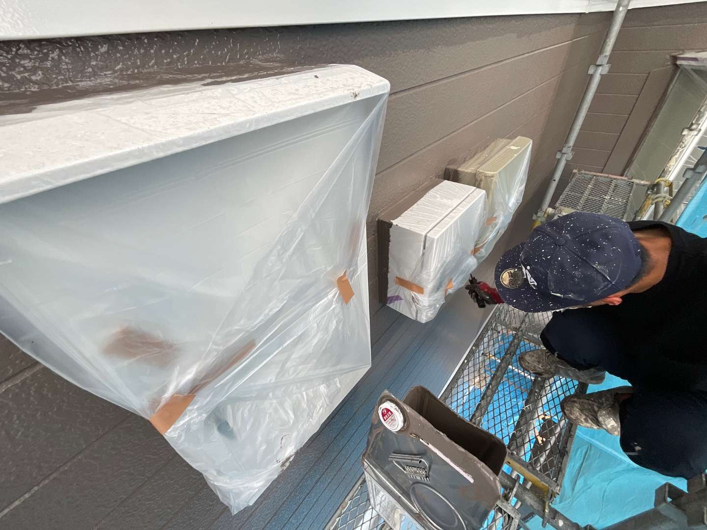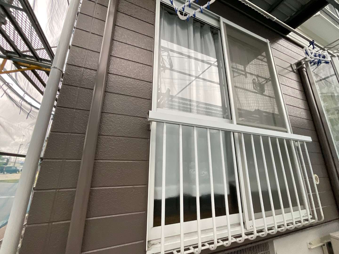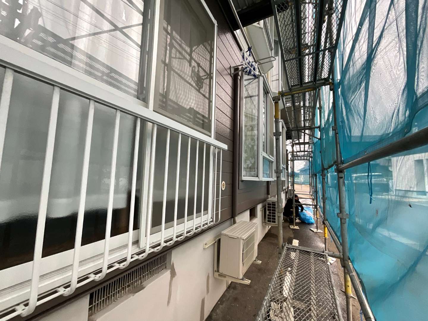 本日の作業は、アパート1階外壁仕上げ塗装・サッシ廻り養生剥しです。