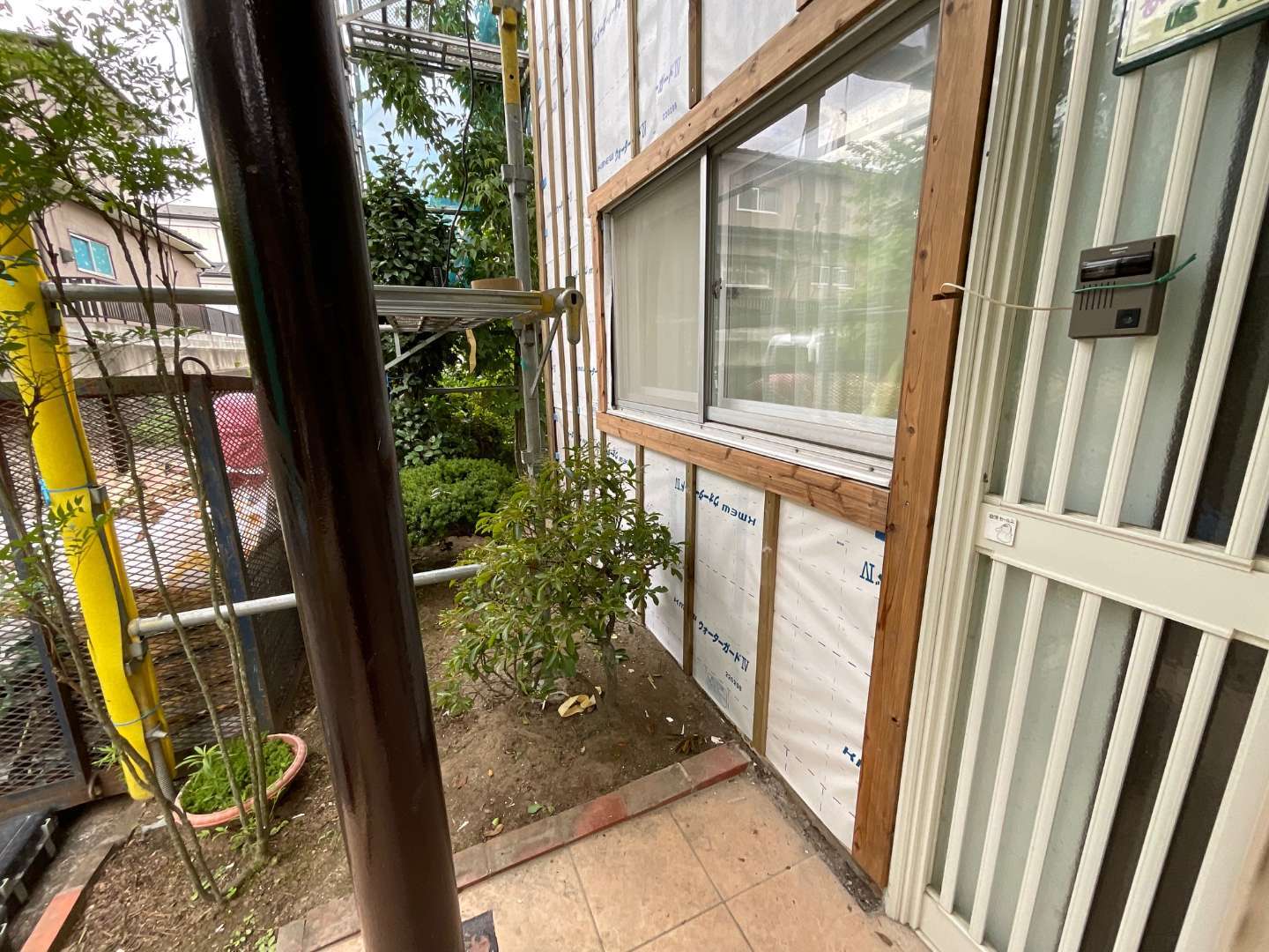 既存外壁がモルタル壁の為、キリで穴開けた後、ビス止めです。