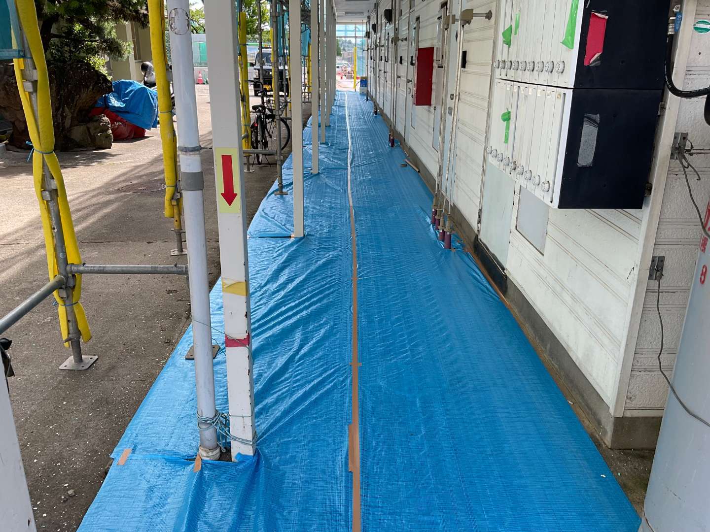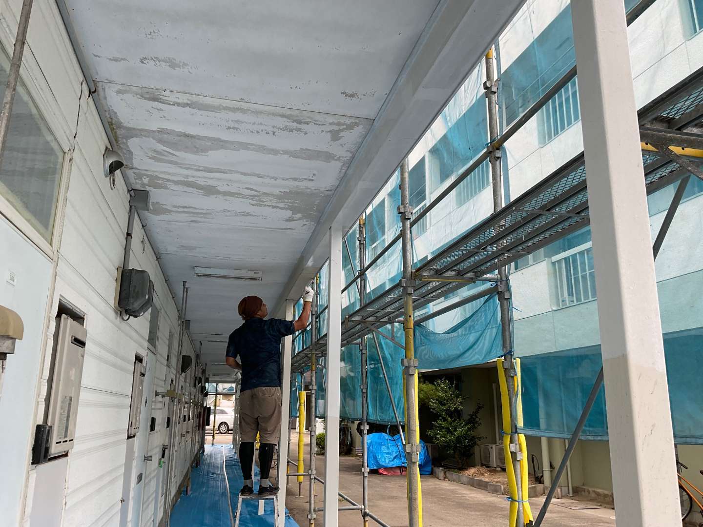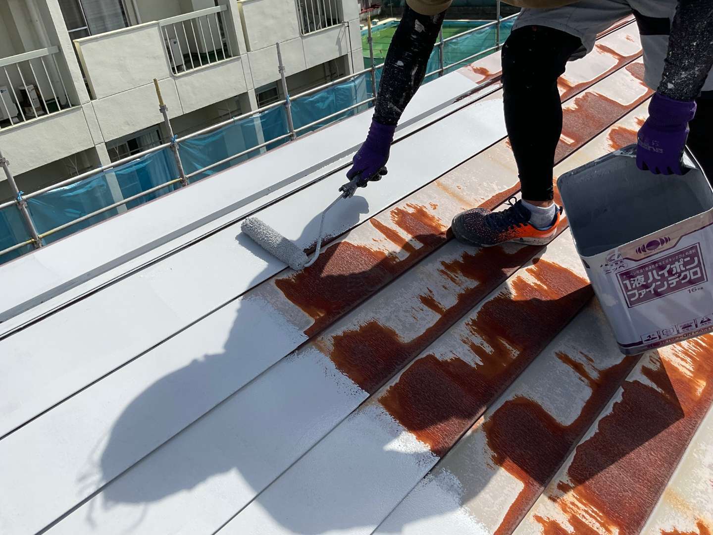 本日の作業は、アパート屋根錆止め塗装・養生・鉄部錆止め塗装です。