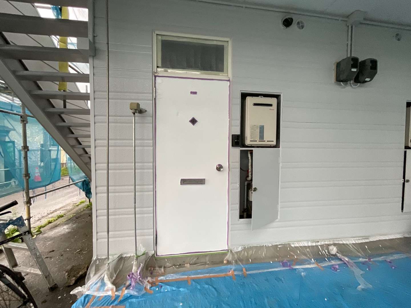 本日の作業は、アパート入口ドア関係塗装・軒天補修・他です。