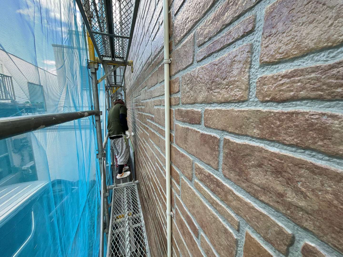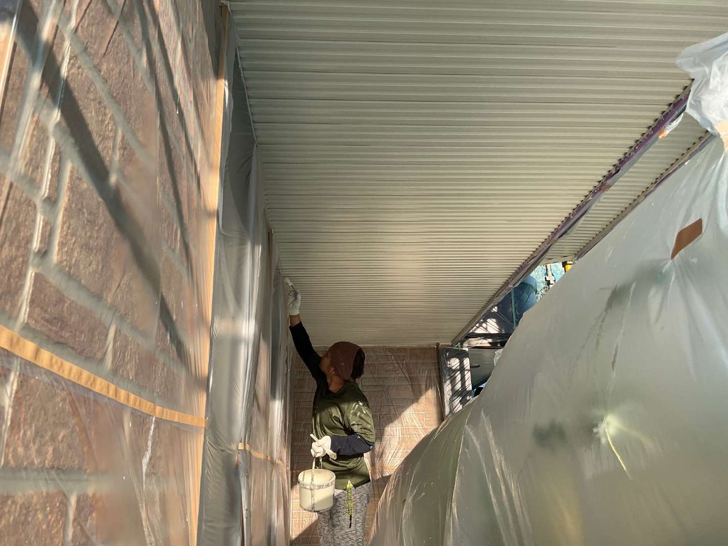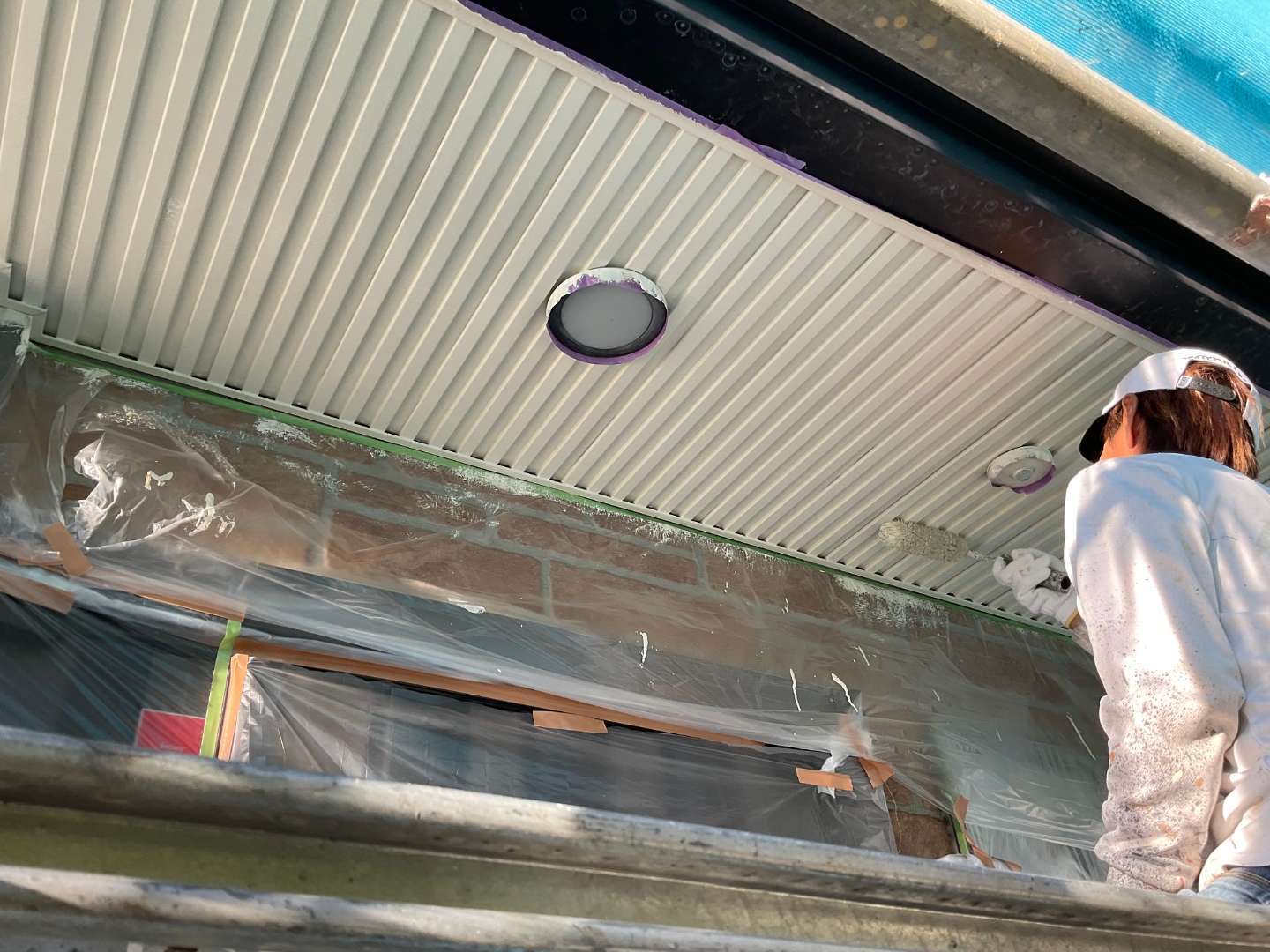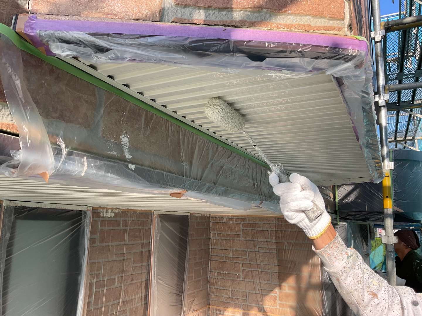 本日の作業は、外壁中塗り塗装、軒天塗装です。