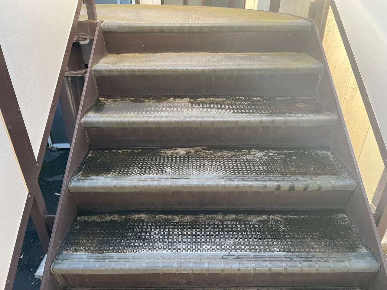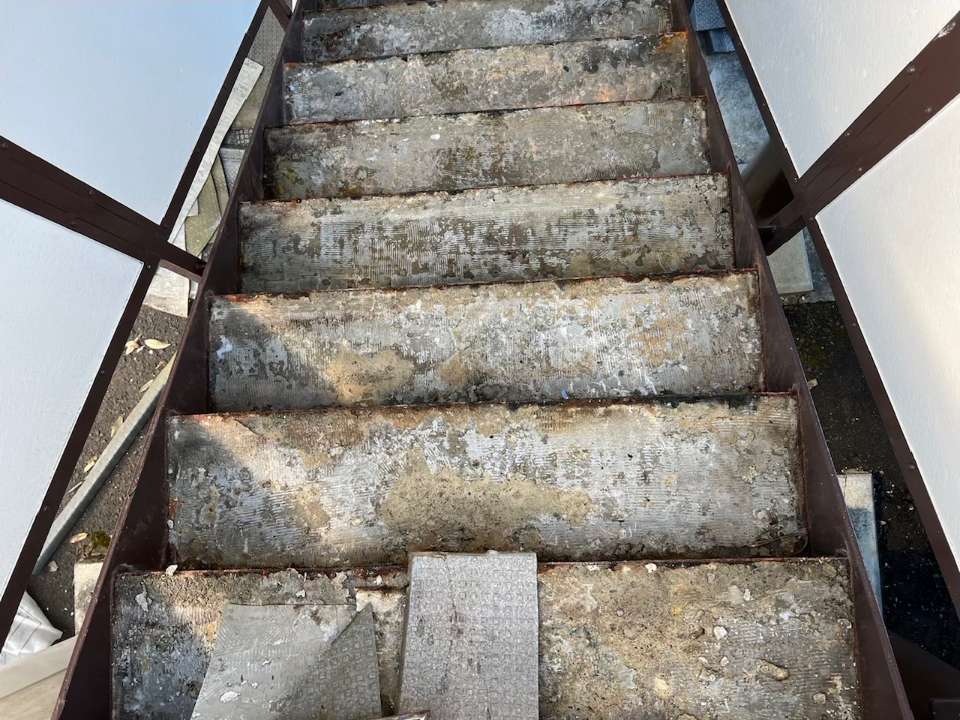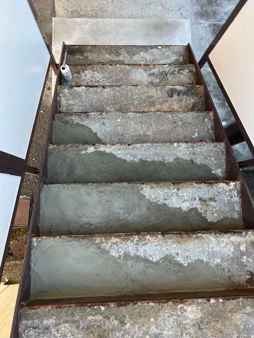 作業内容は、既存階段シート剥し・既存モルタル補修です。