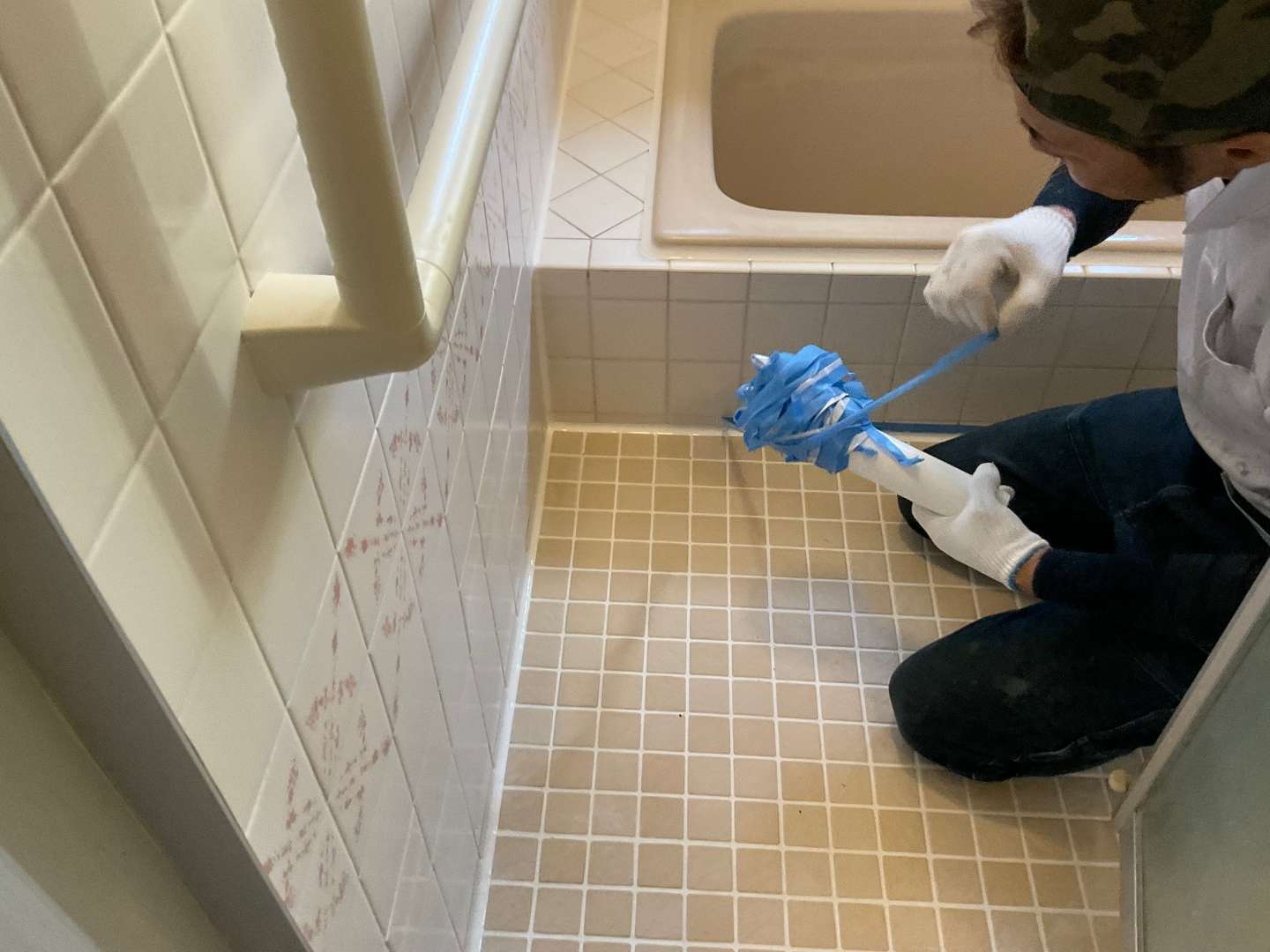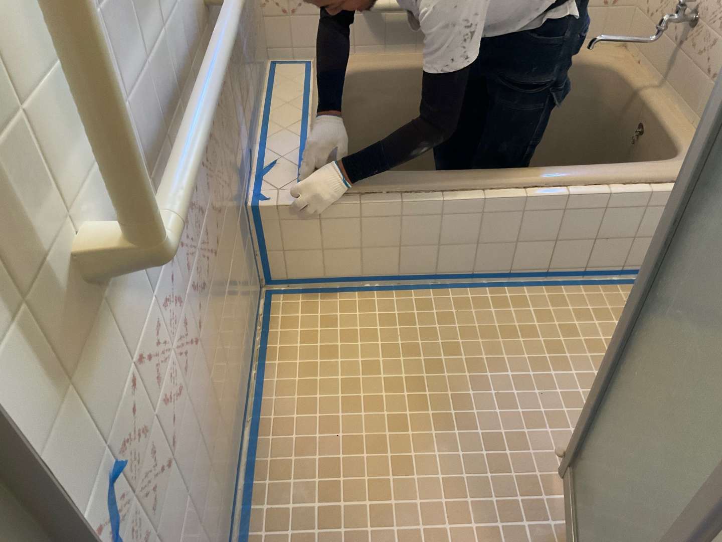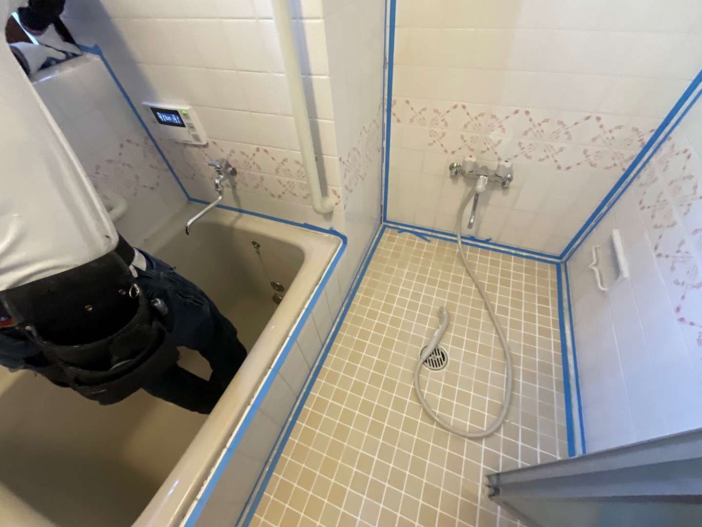 本日は、浴室タイル壁・床部分シーリング作業です