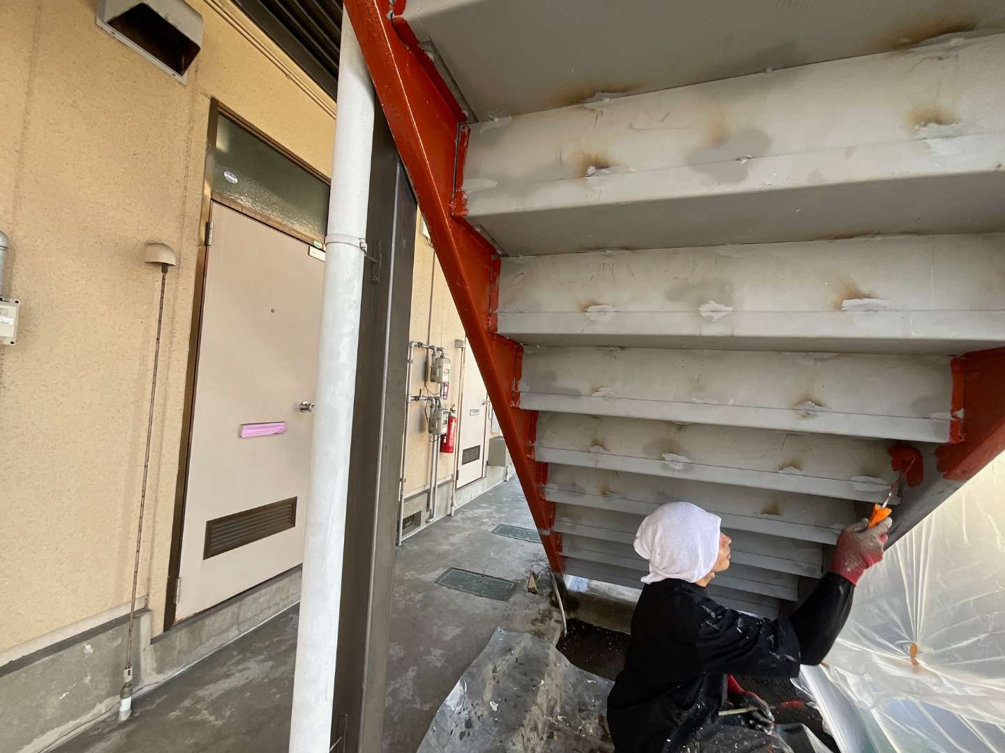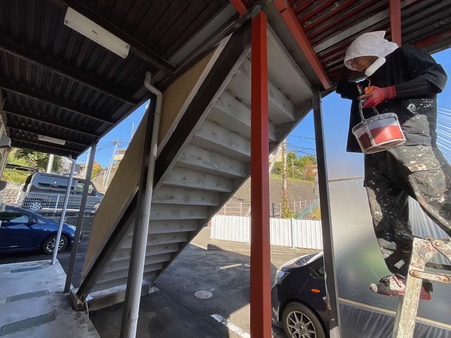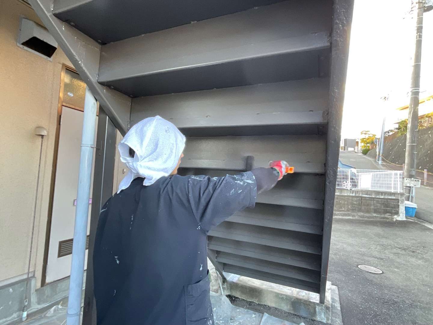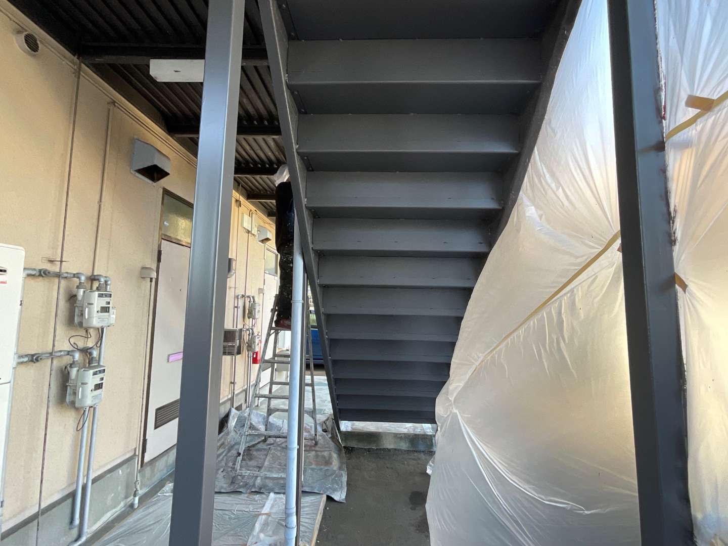 本日は、アパート階段鉄部塗装作業