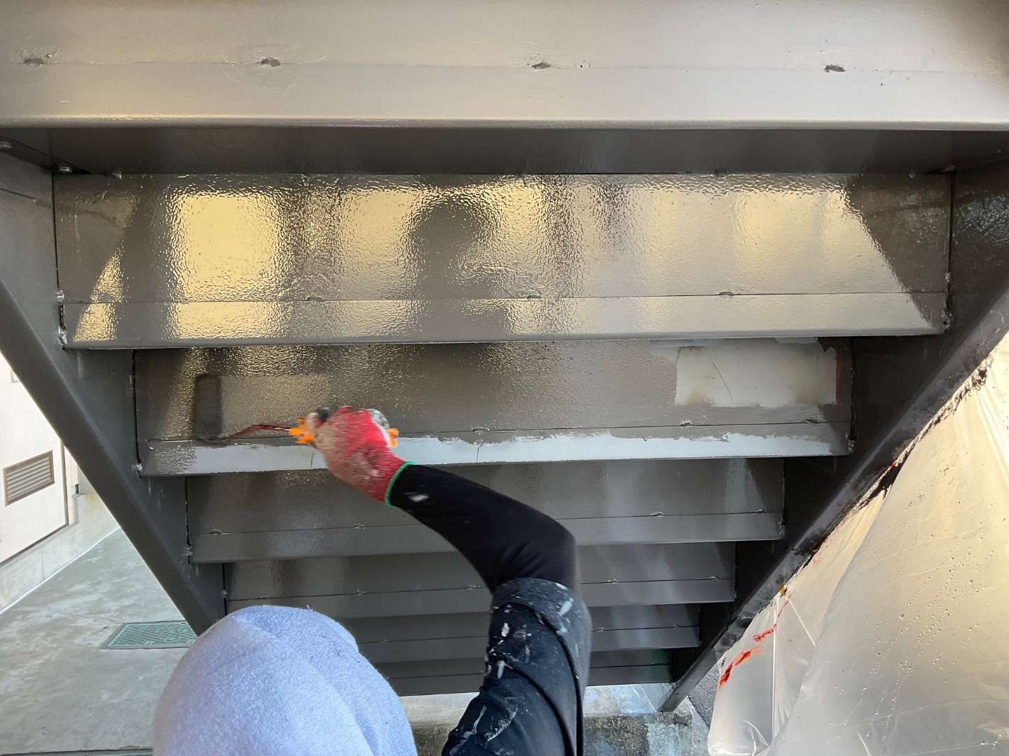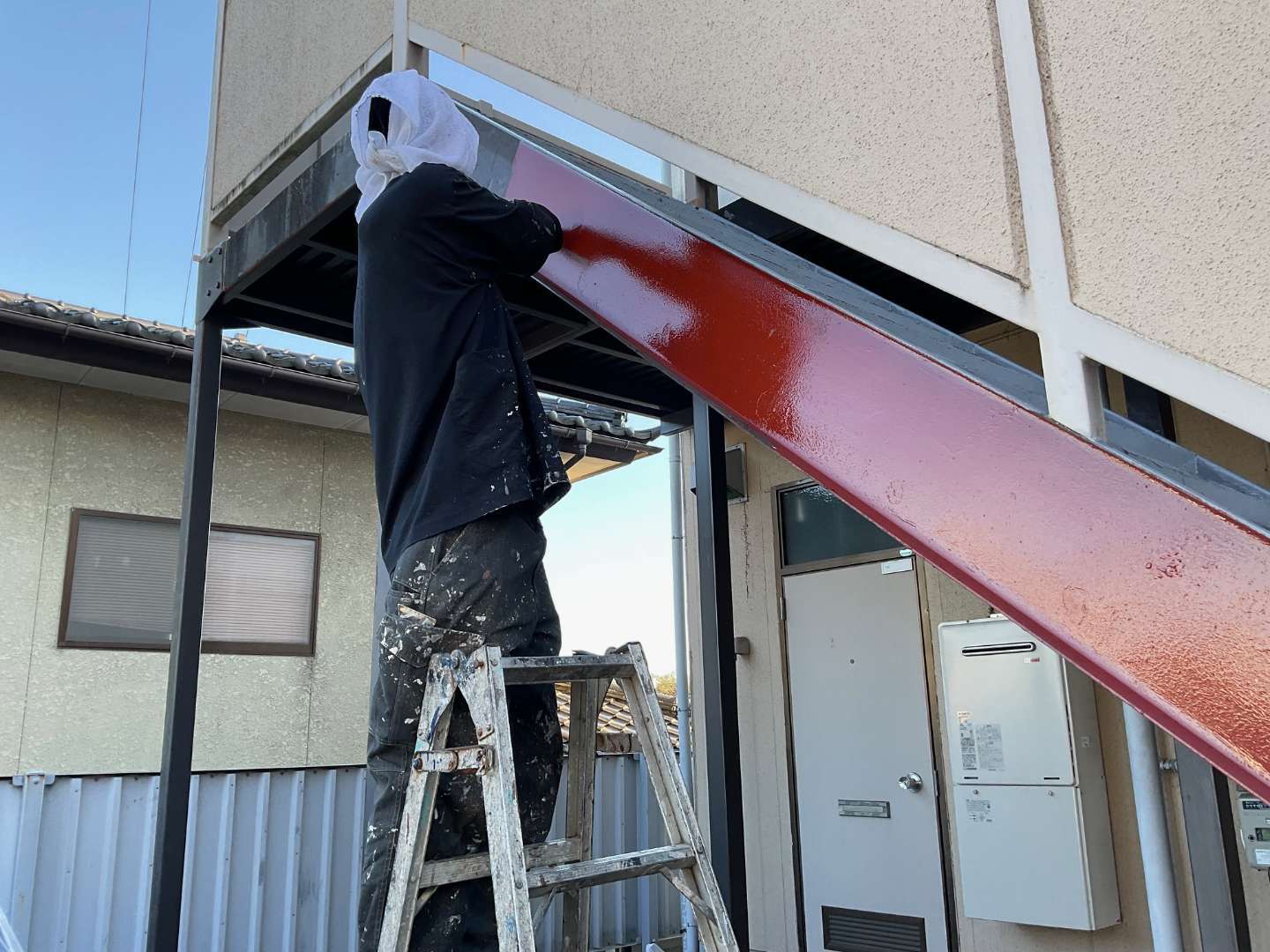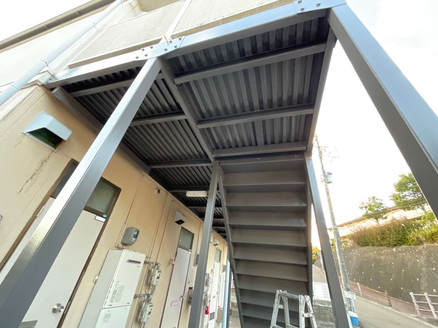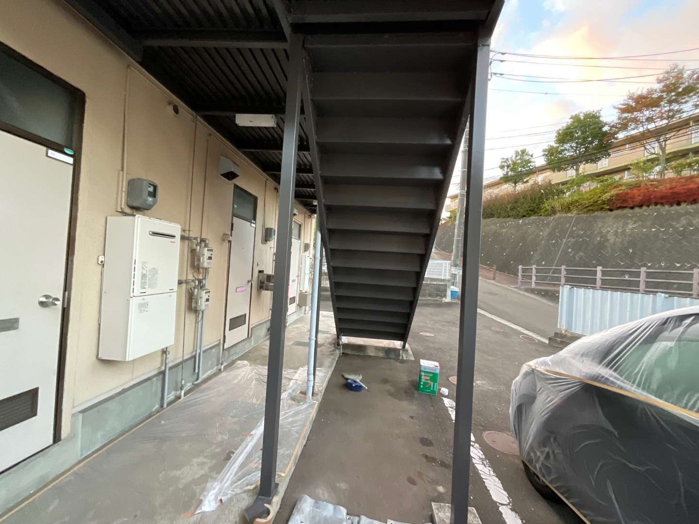 本日は、アパート階段鉄部塗装作業