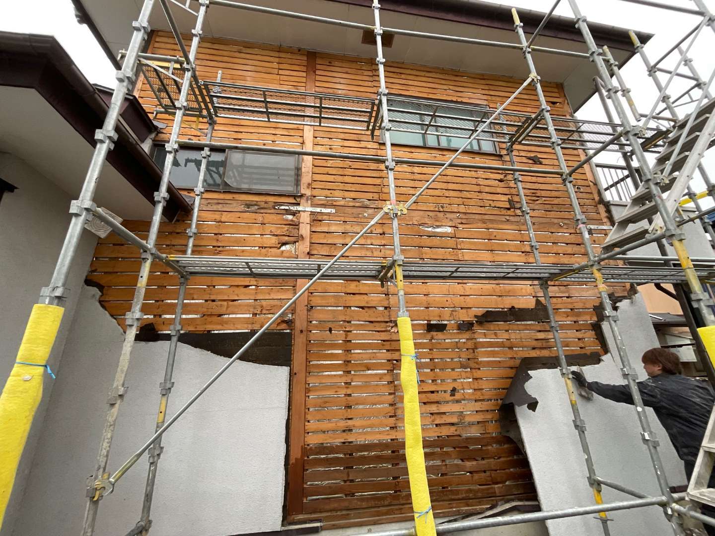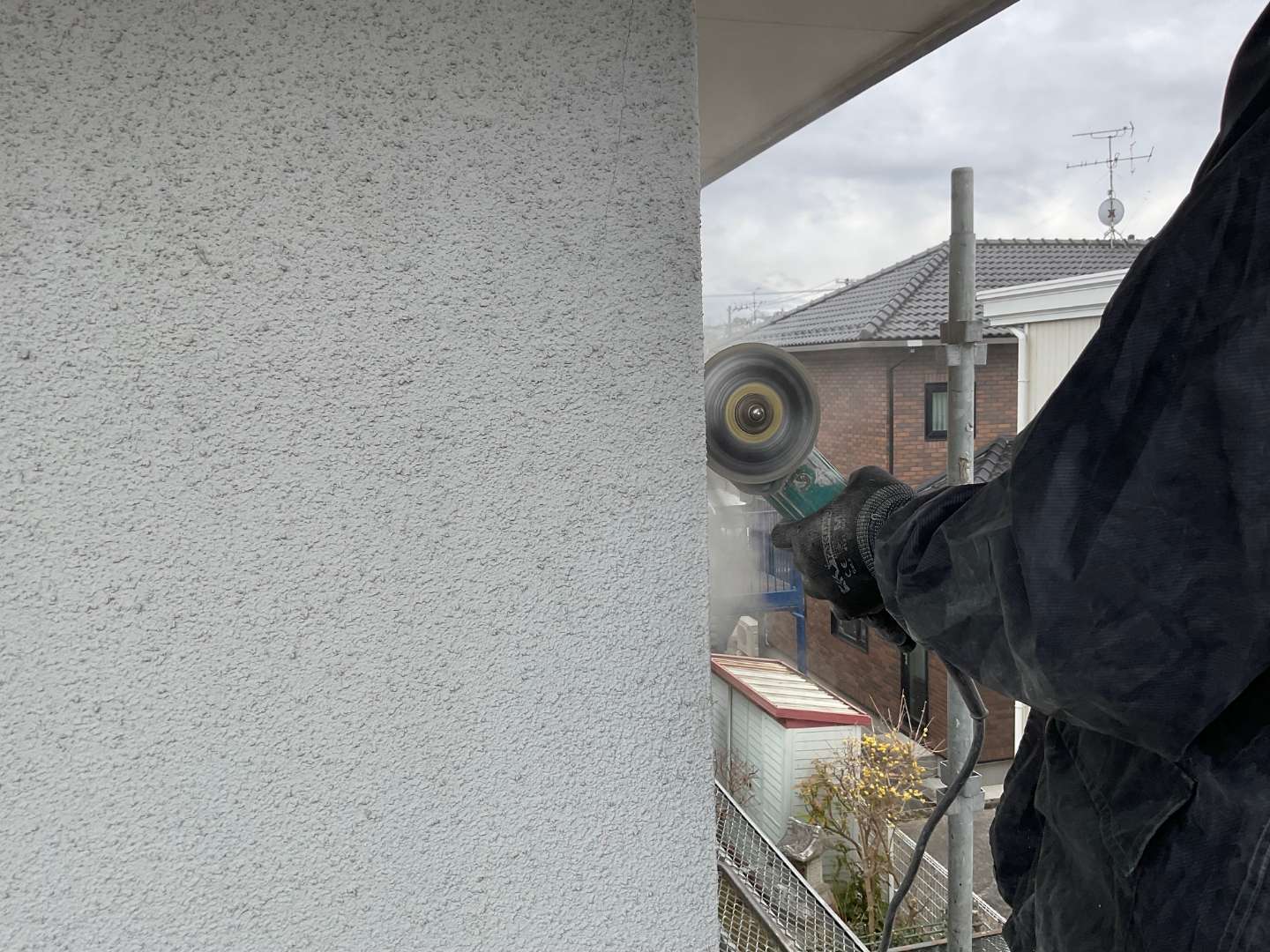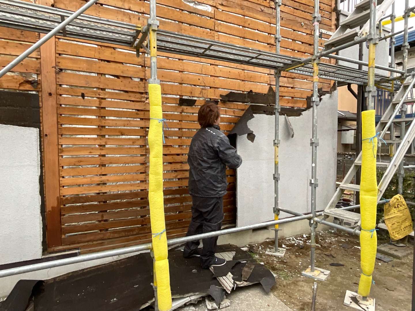 本日の作業は、既存モルタル外壁解体作業です。