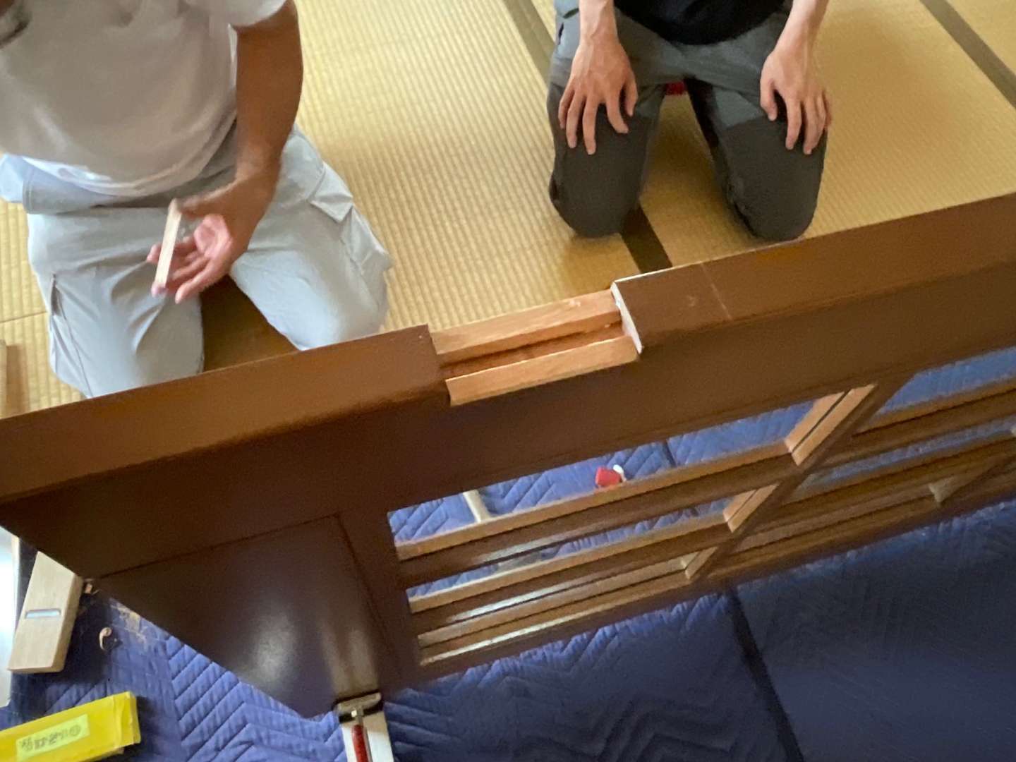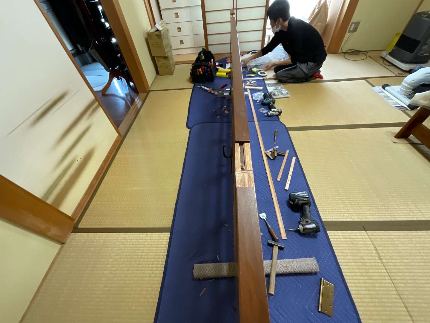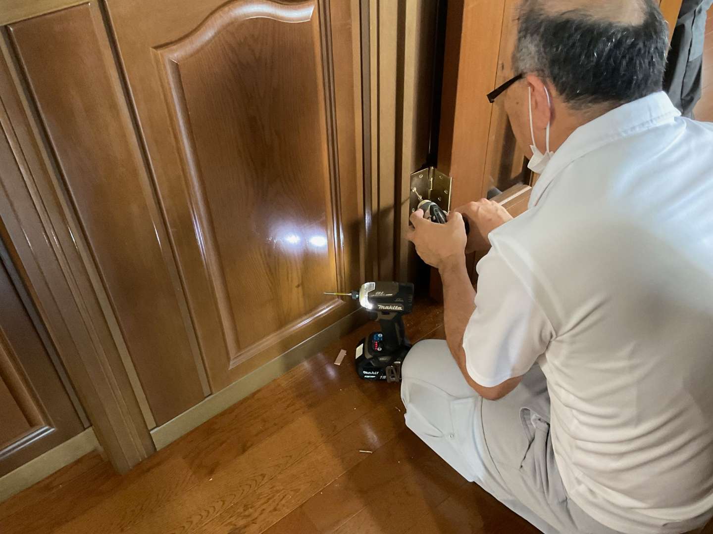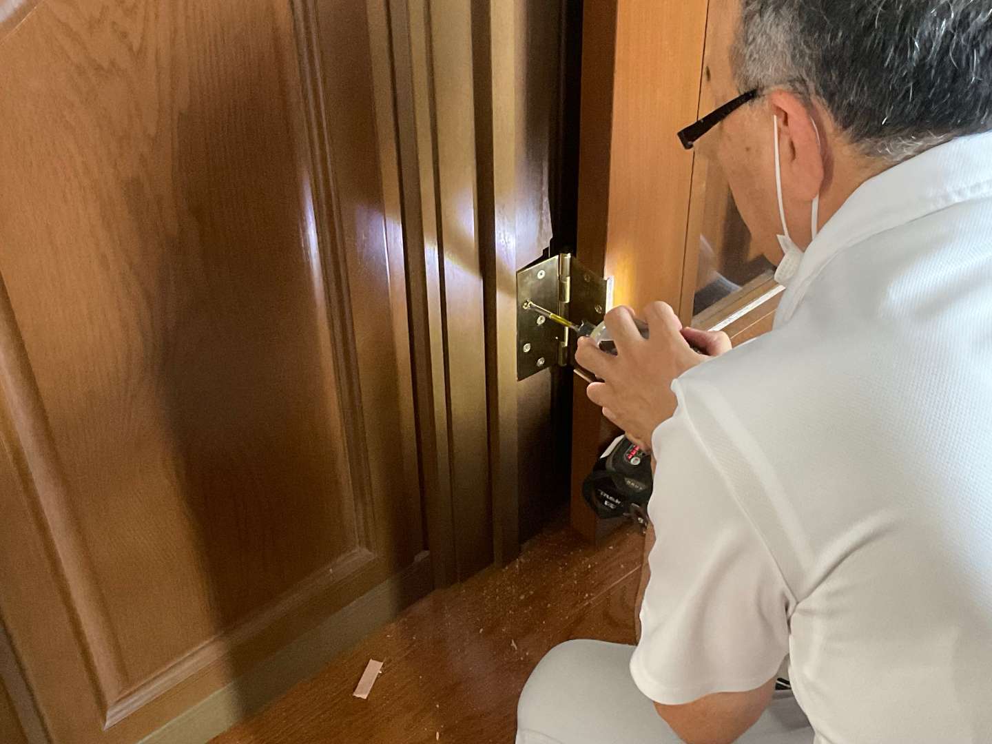 本日は、室内ガラスドア丁番交換・調整作業です。