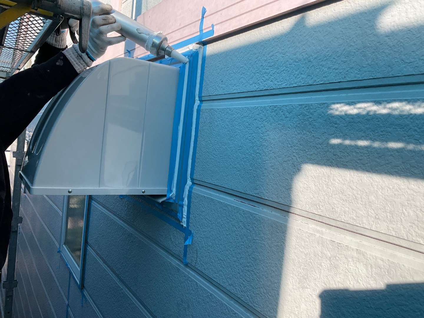 本日は、外壁・サッシ・板金箇所シーリング打ち作業です。