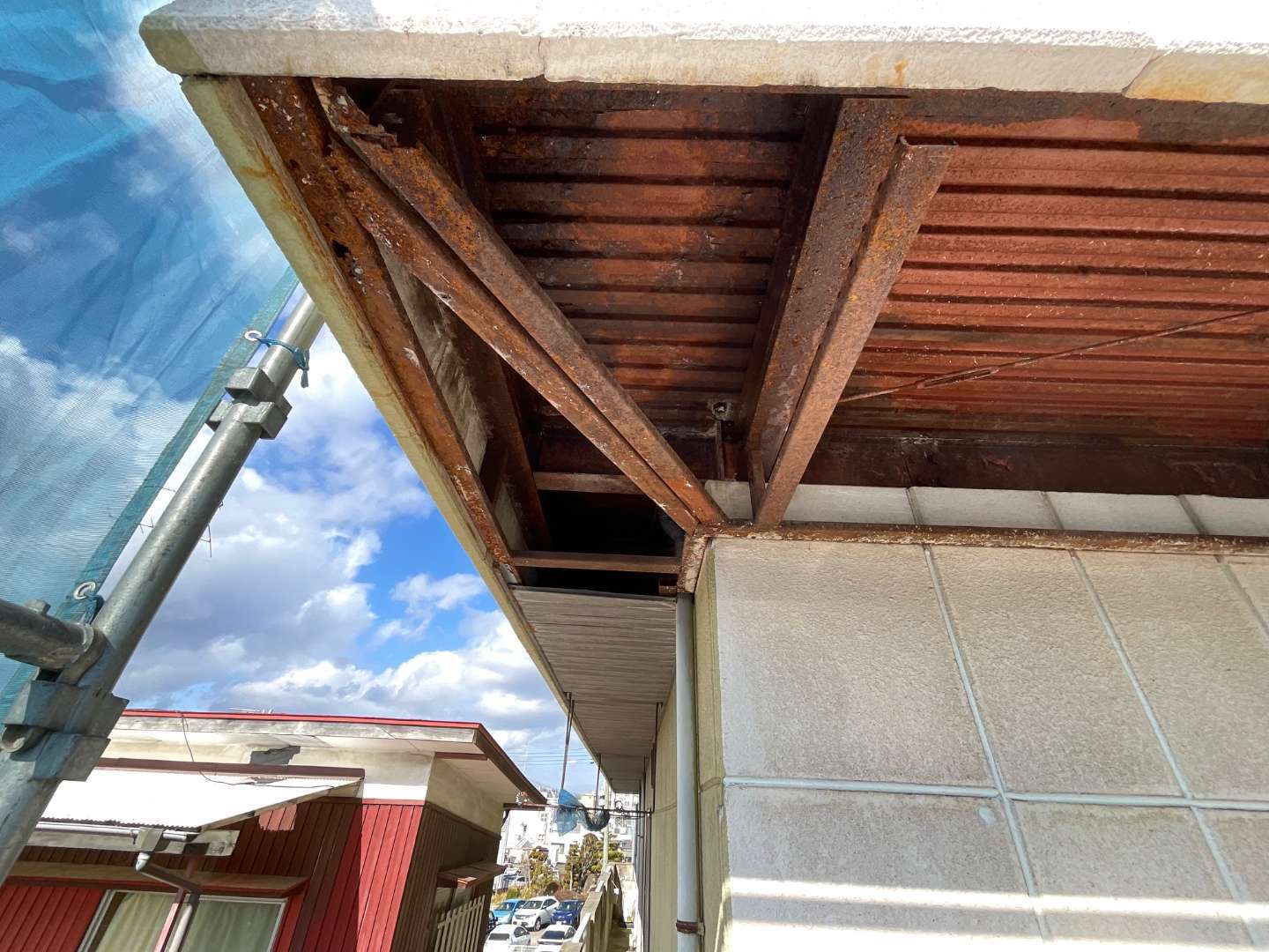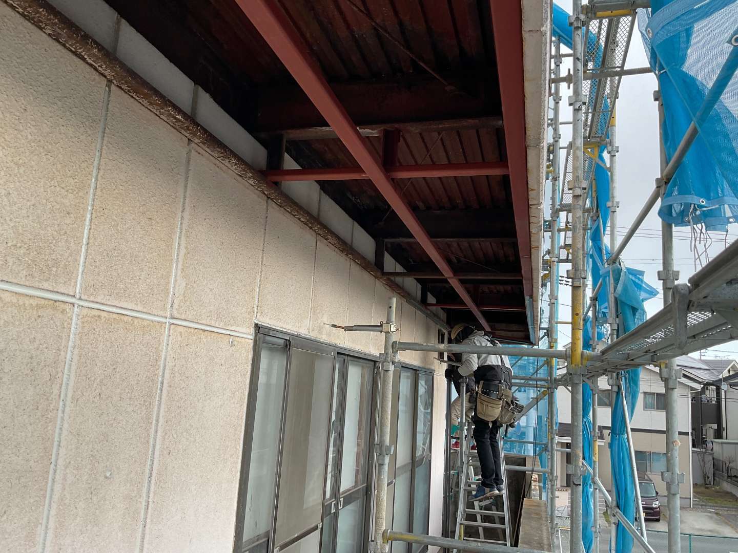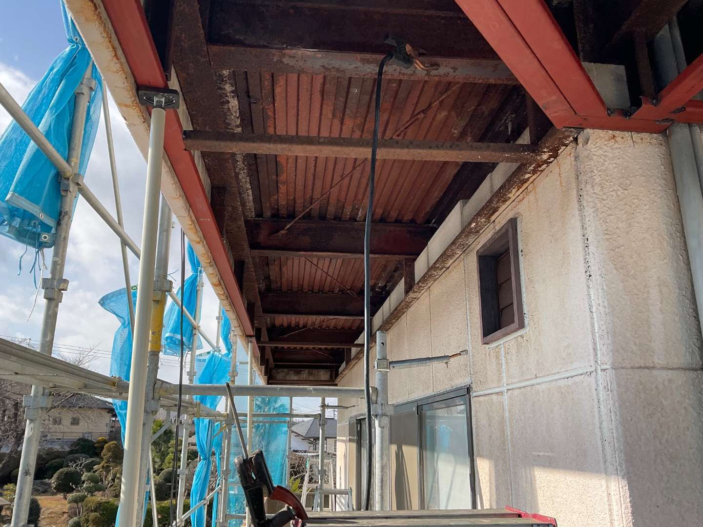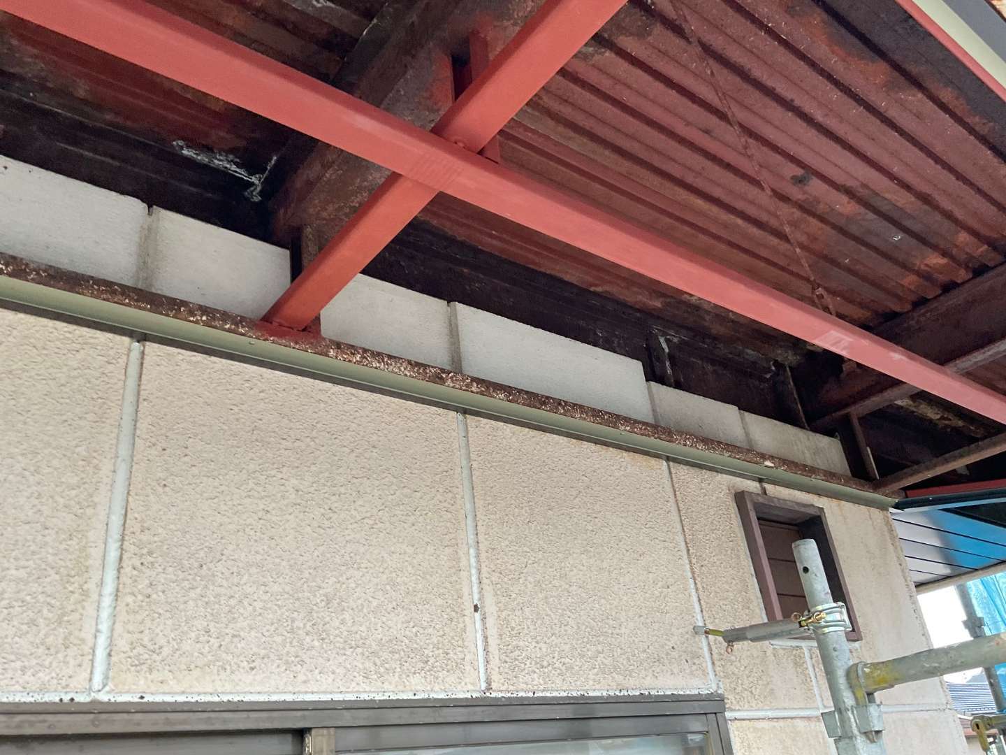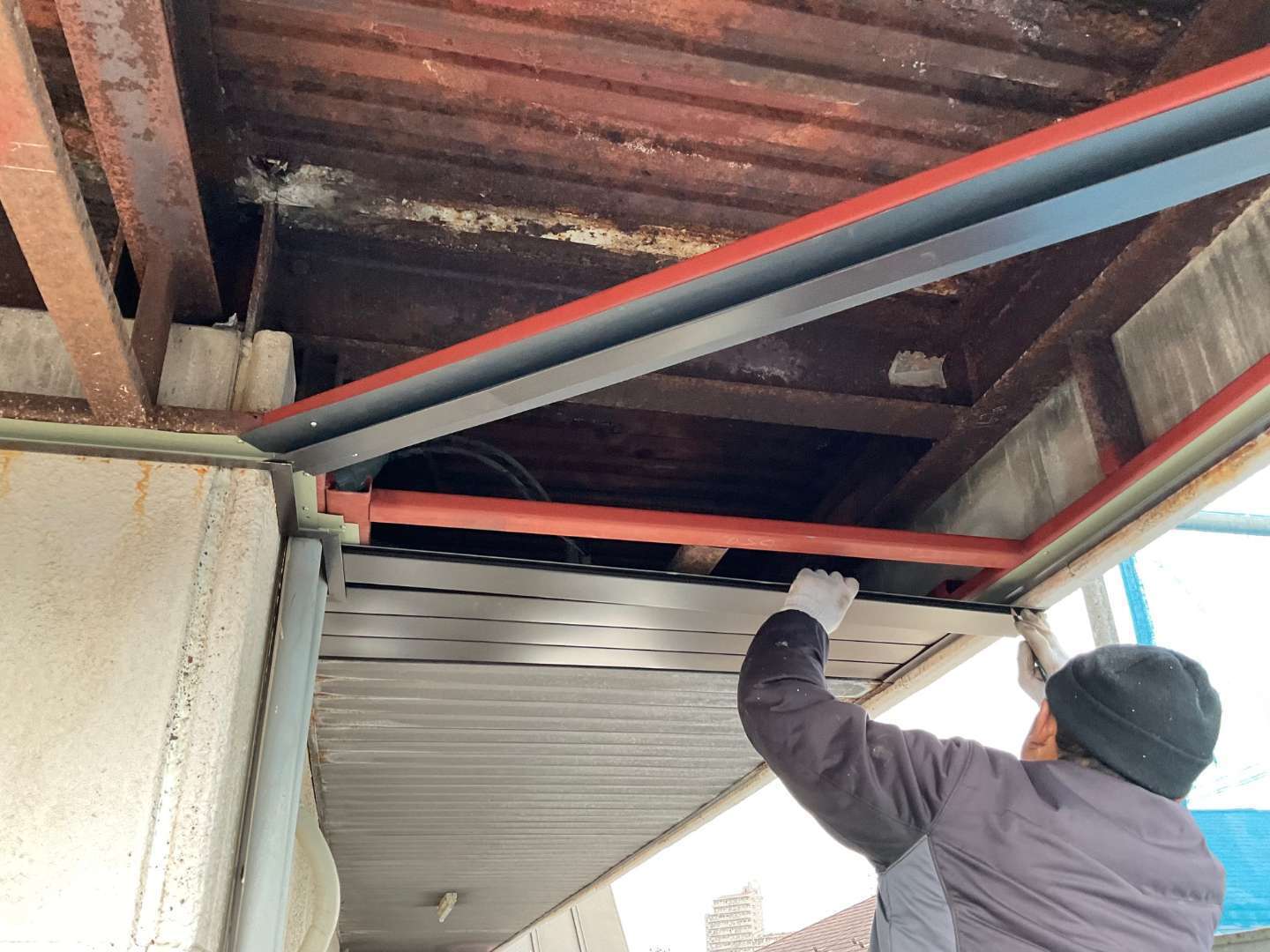 本日は、軒天骨組み鉄骨補強・板金作業です。