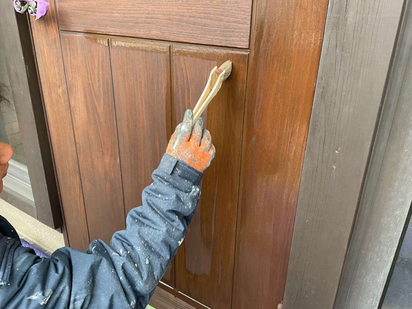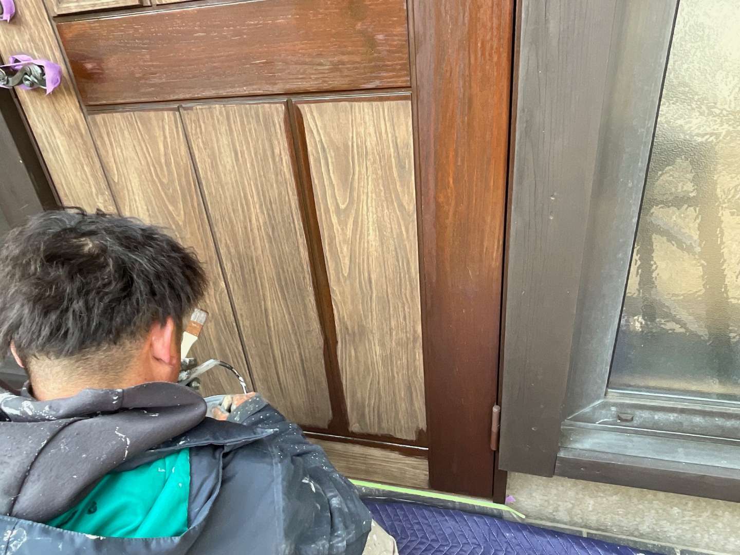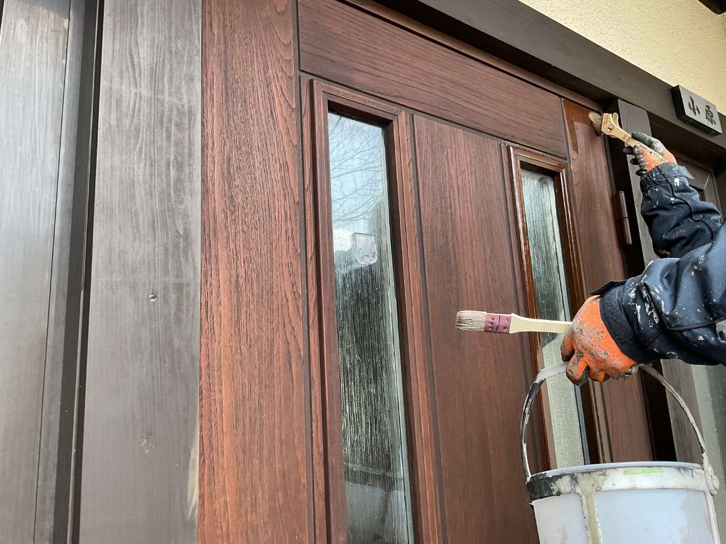 本日は、木製玄関ドア塗り替え作業