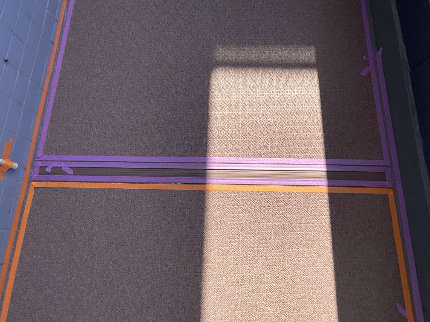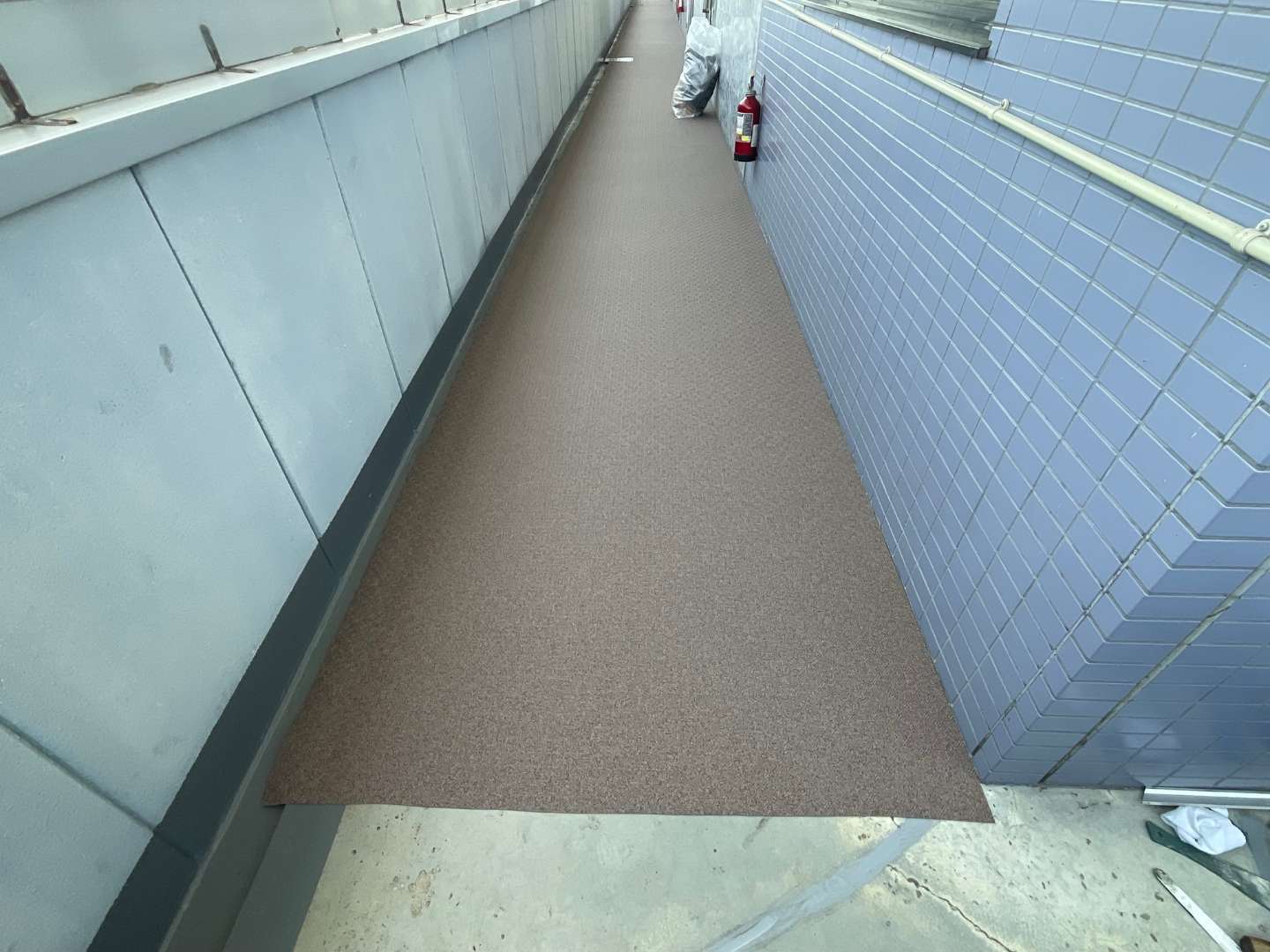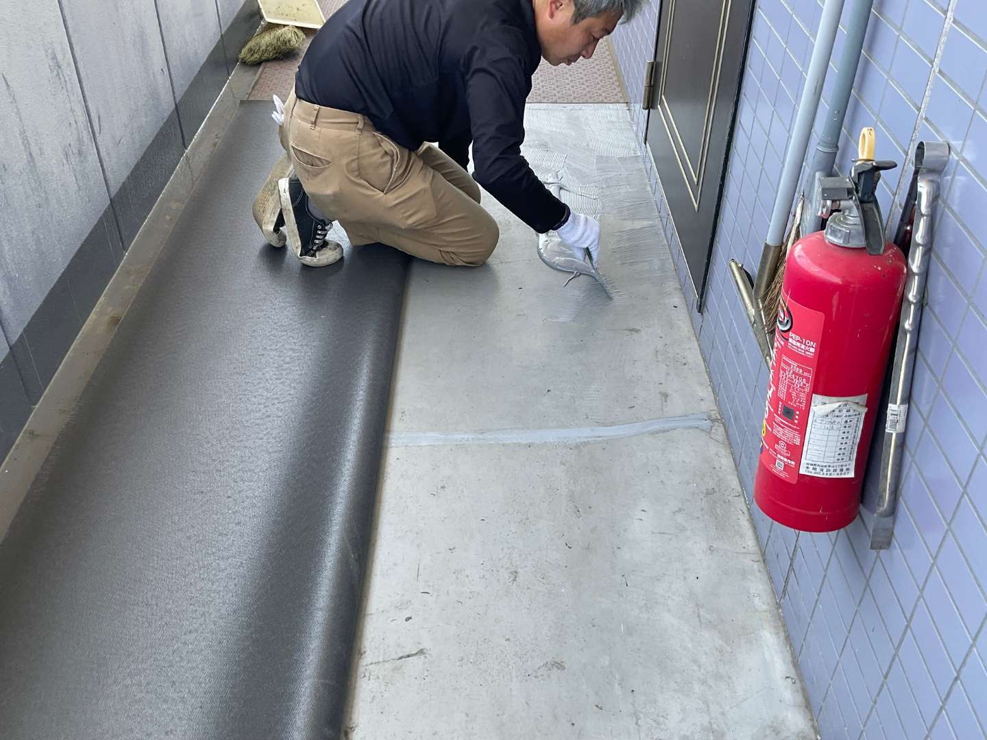 本日は、テナント2階通路長尺シート貼り作業です。