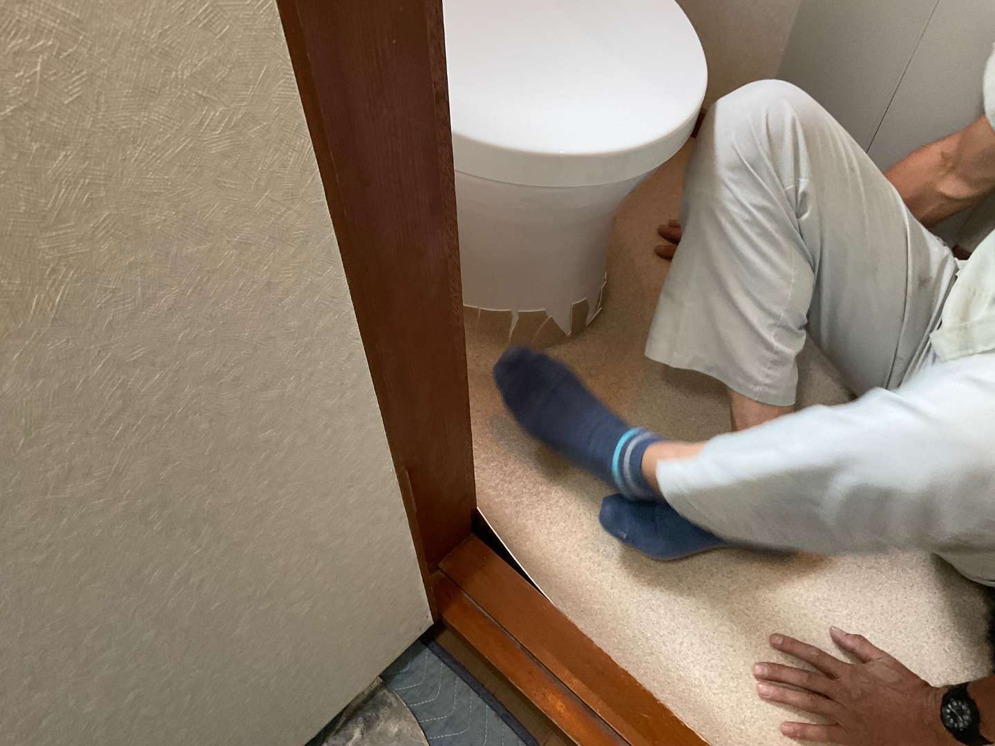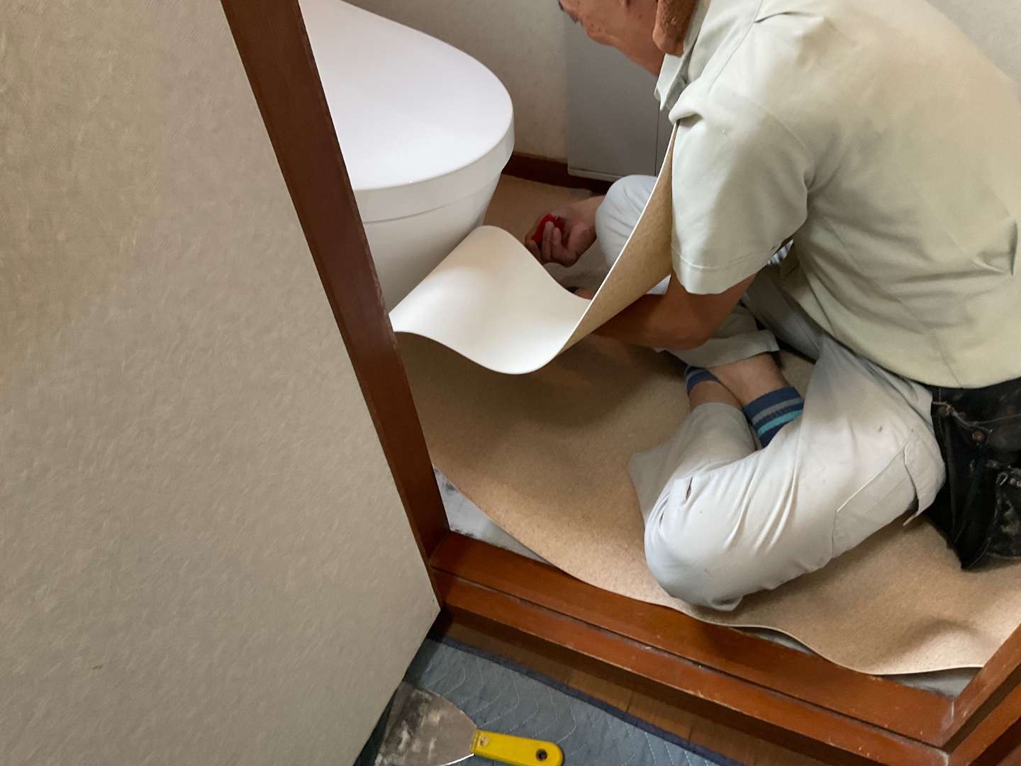 本日は、トイレ床クッションフロアー貼り作業です。