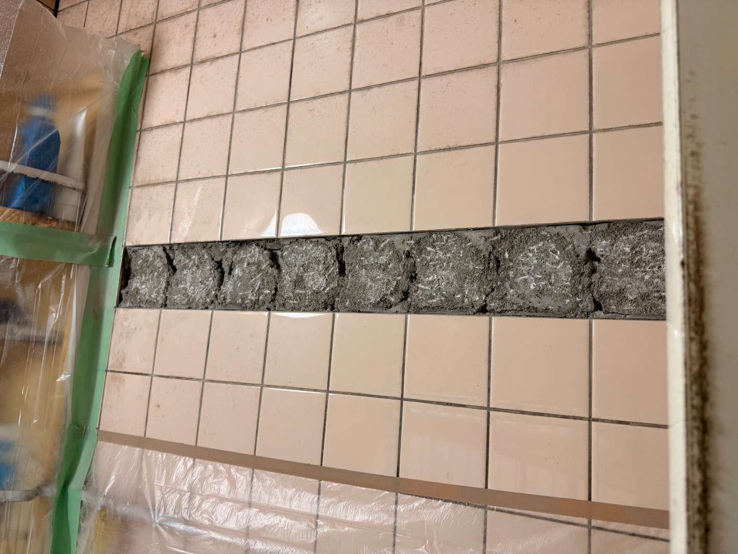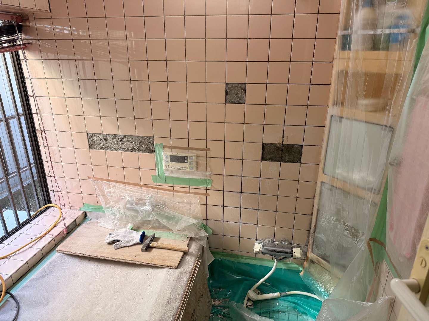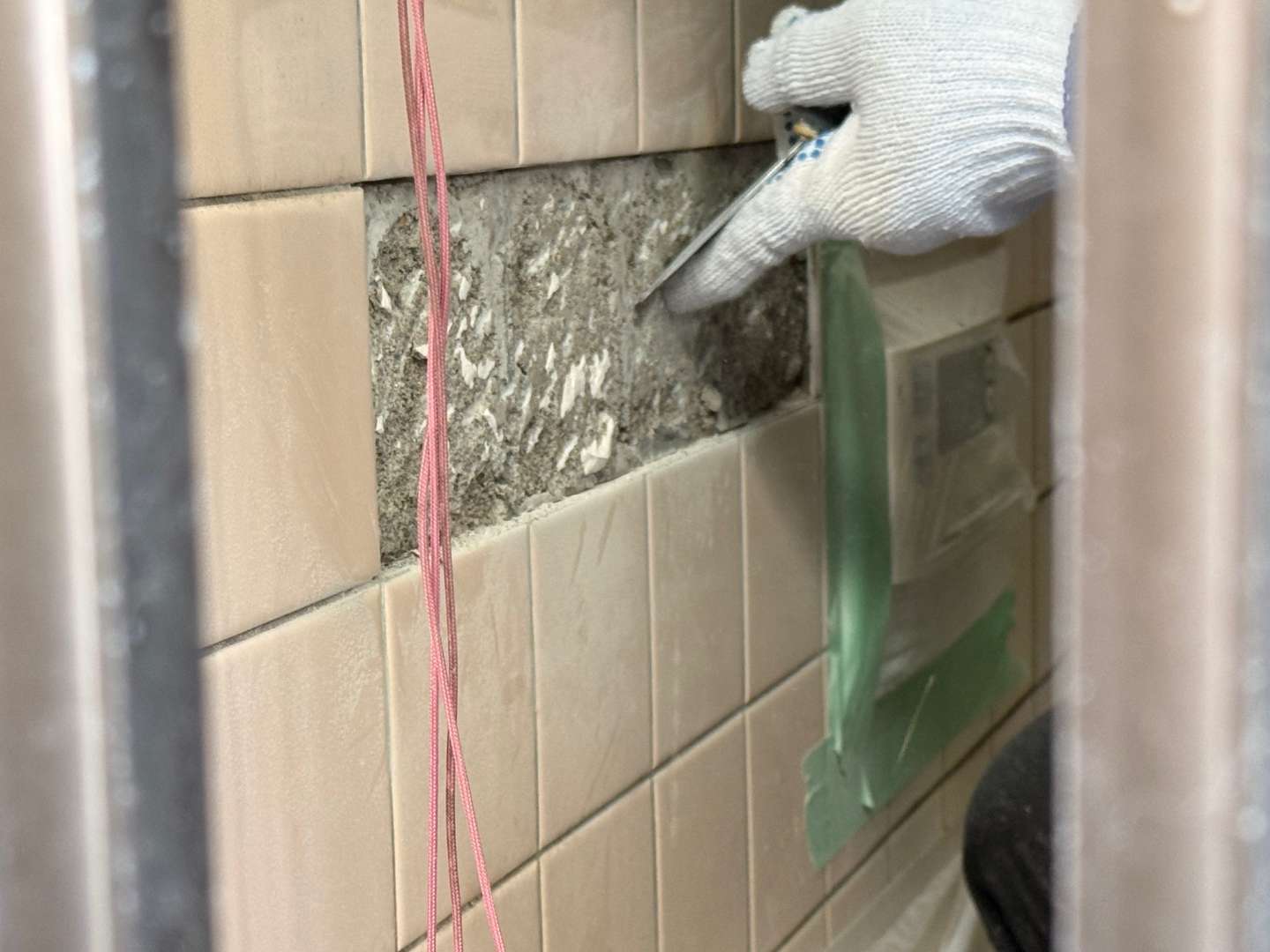 本日は、浴室壁タイル亀裂カ所貼り替え作業です。