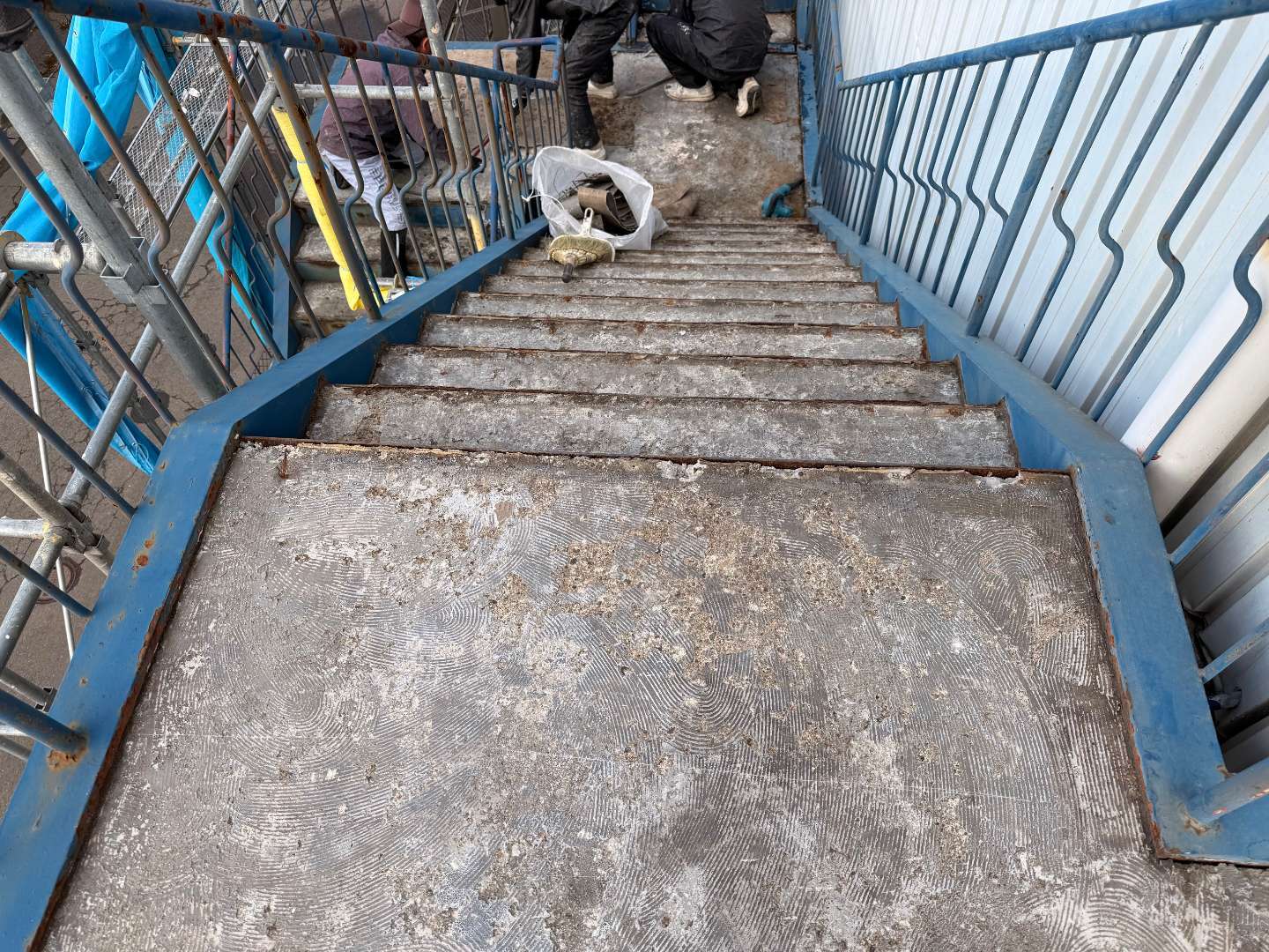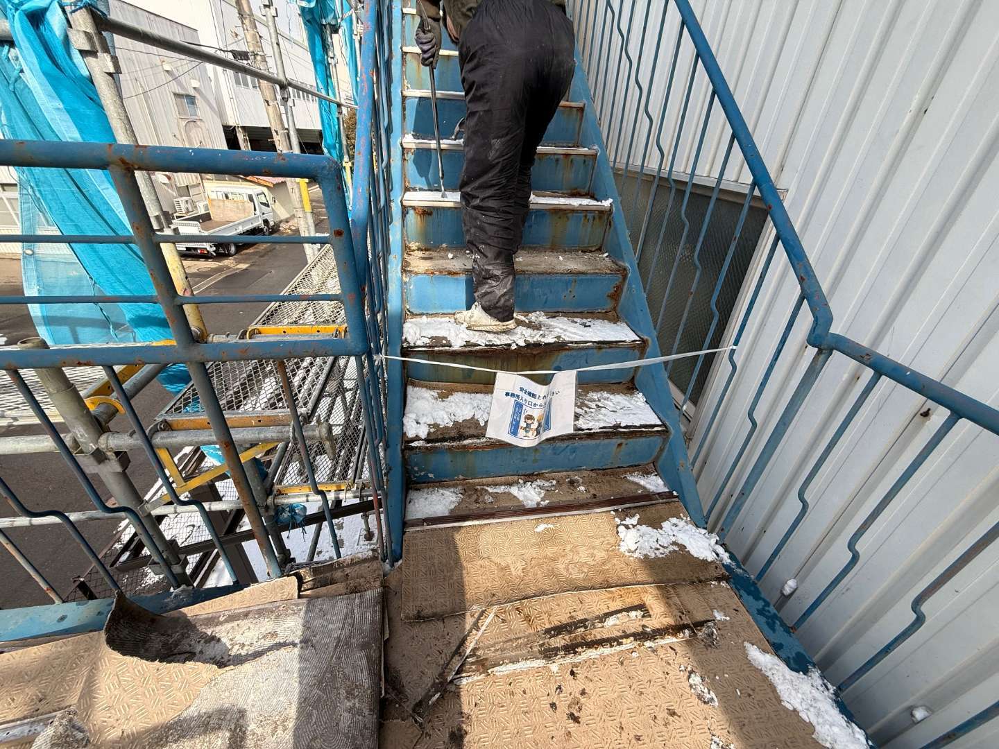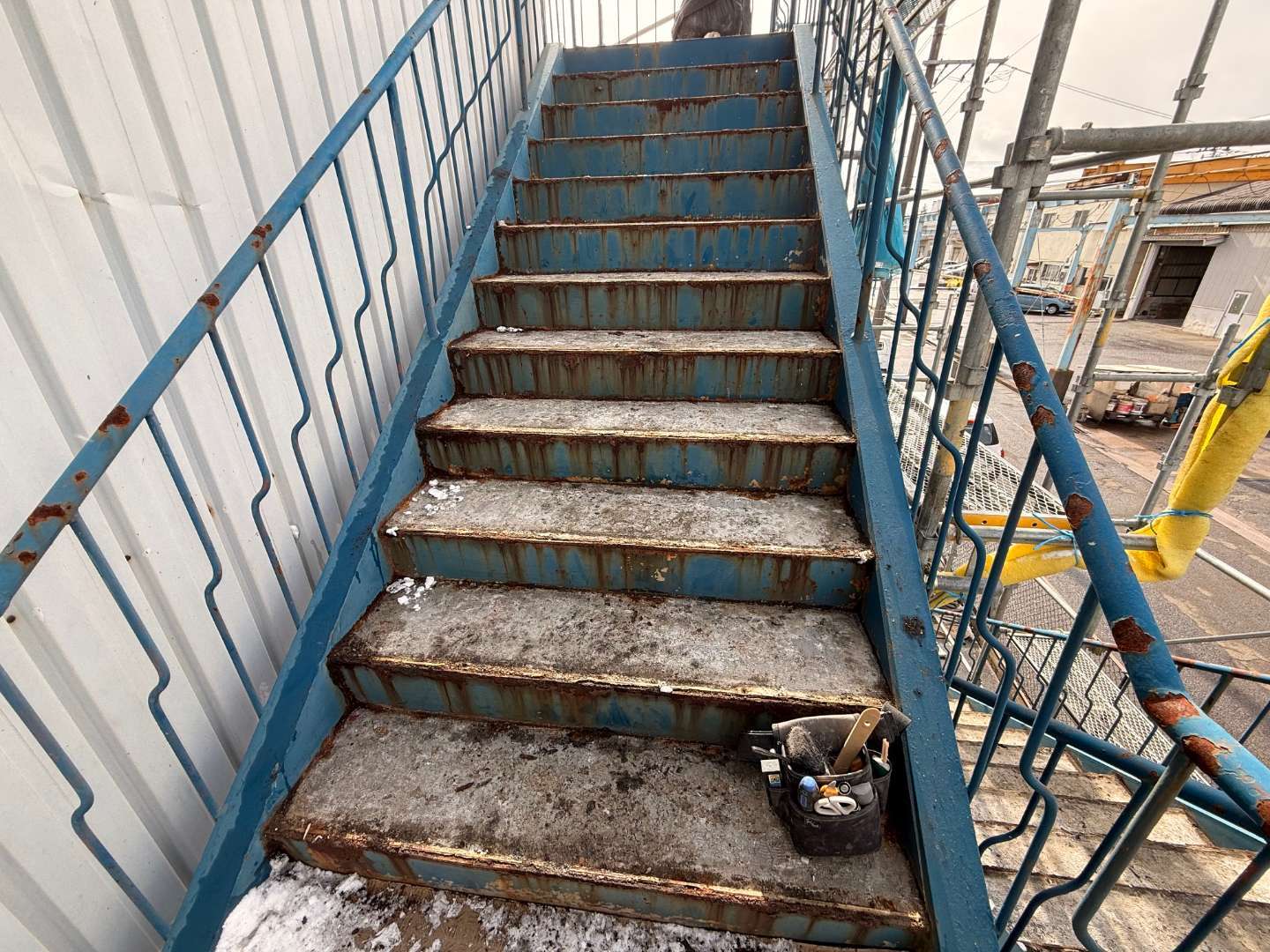 本日は、既存鉄骨階段 長尺シート撤去作業です。