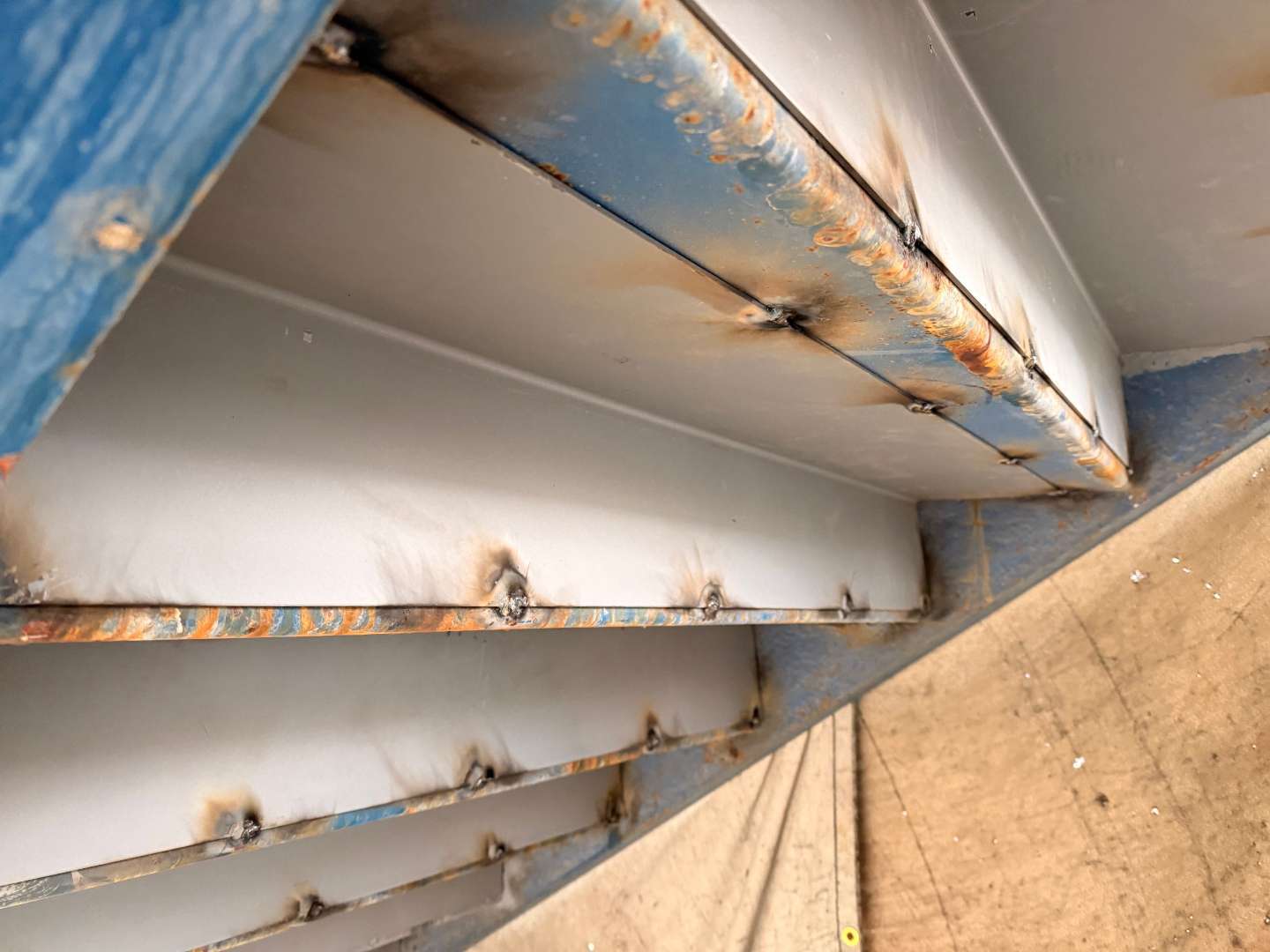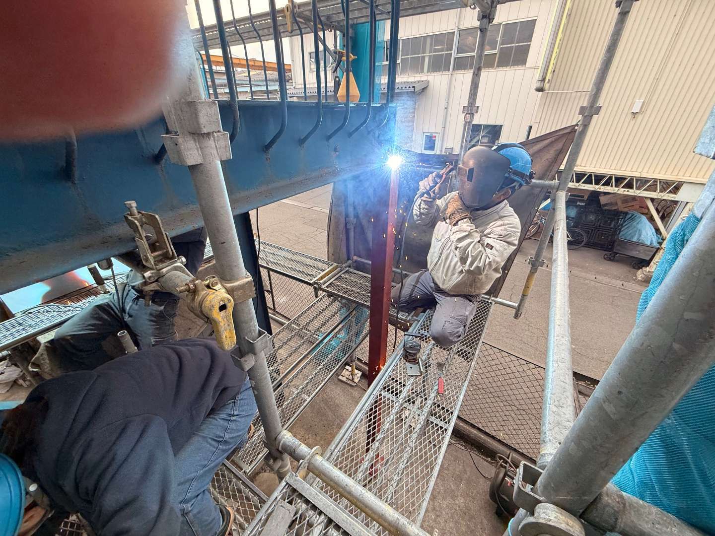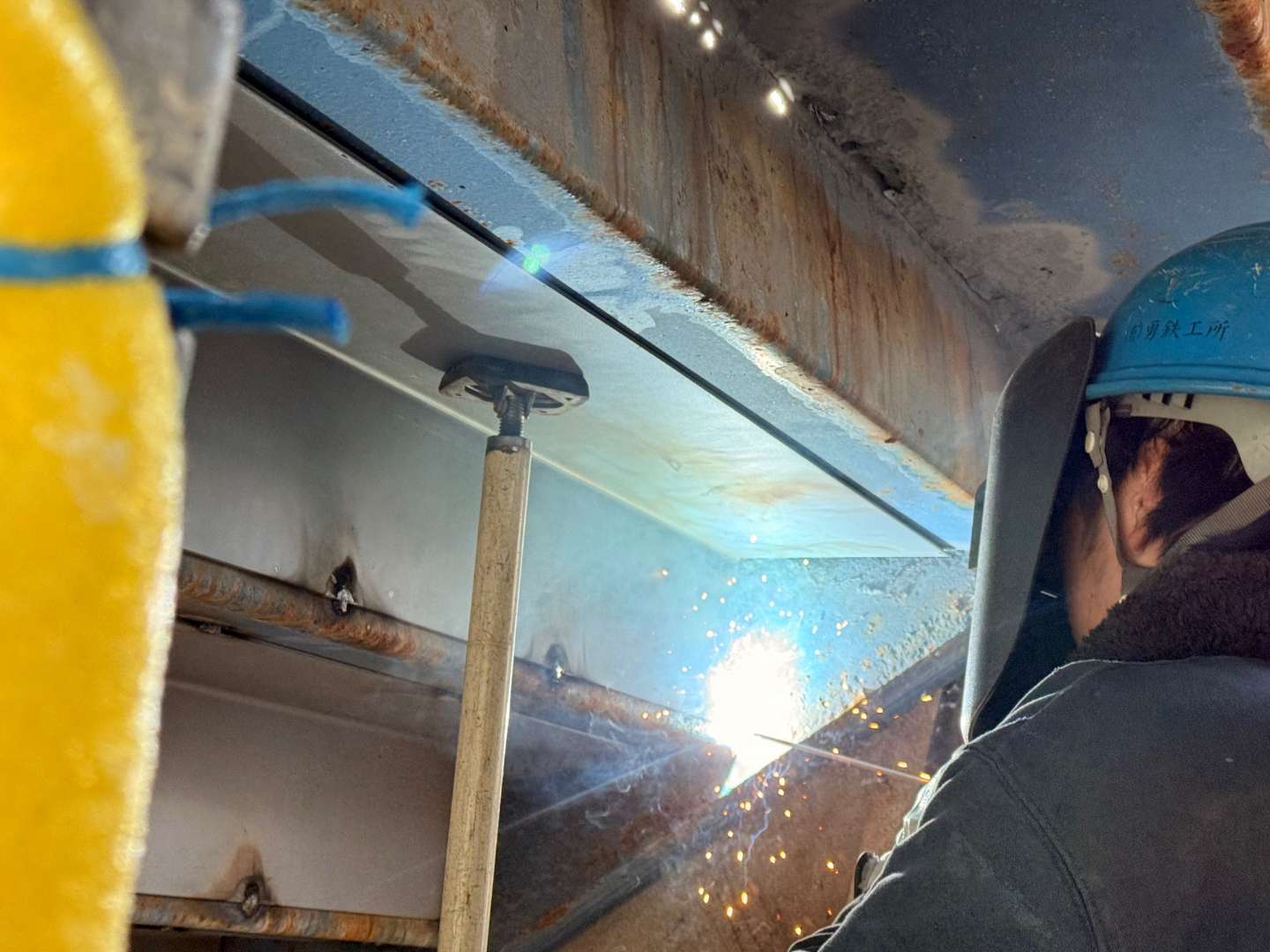 階段裏鉄骨材溶接作業
