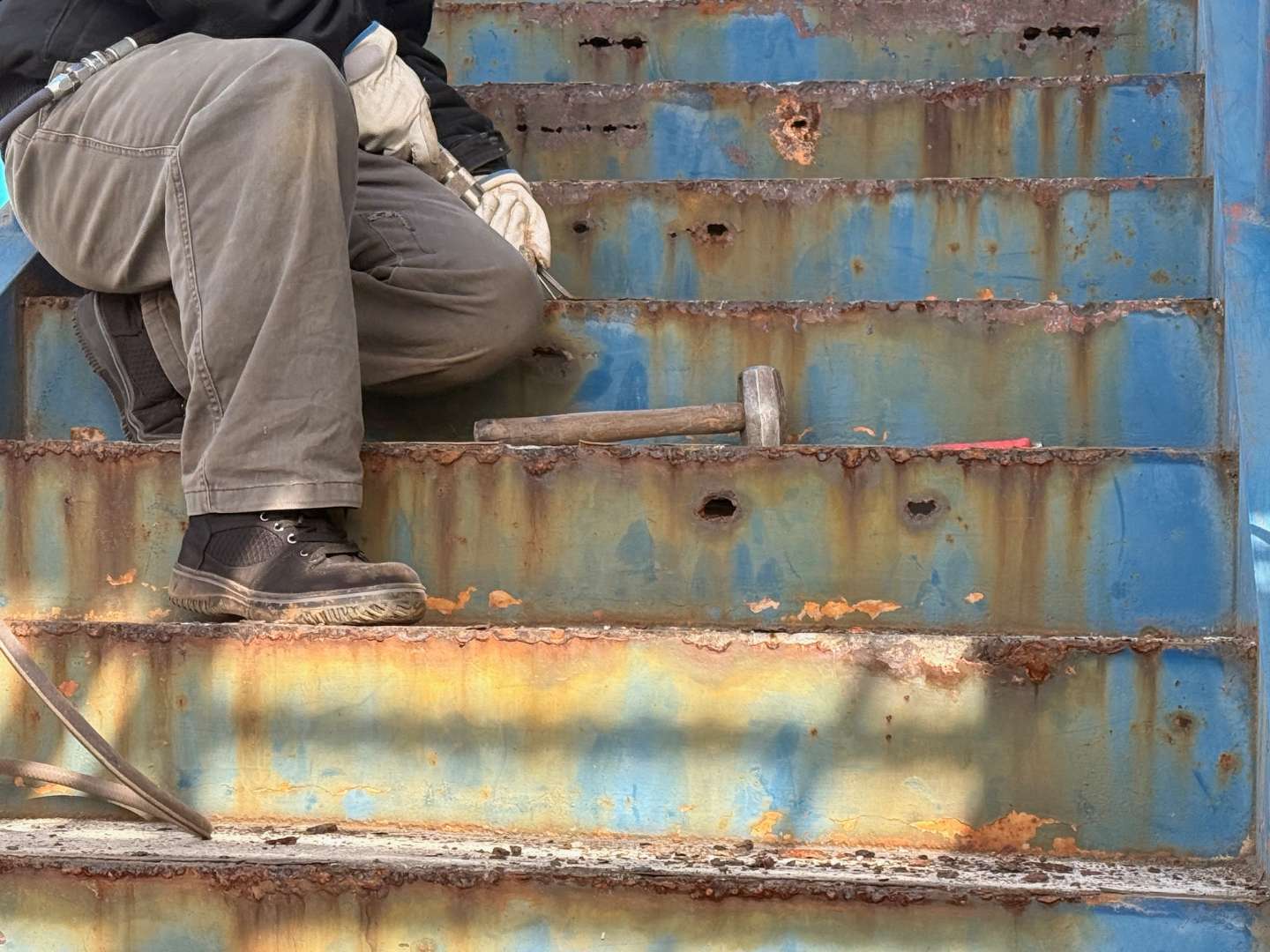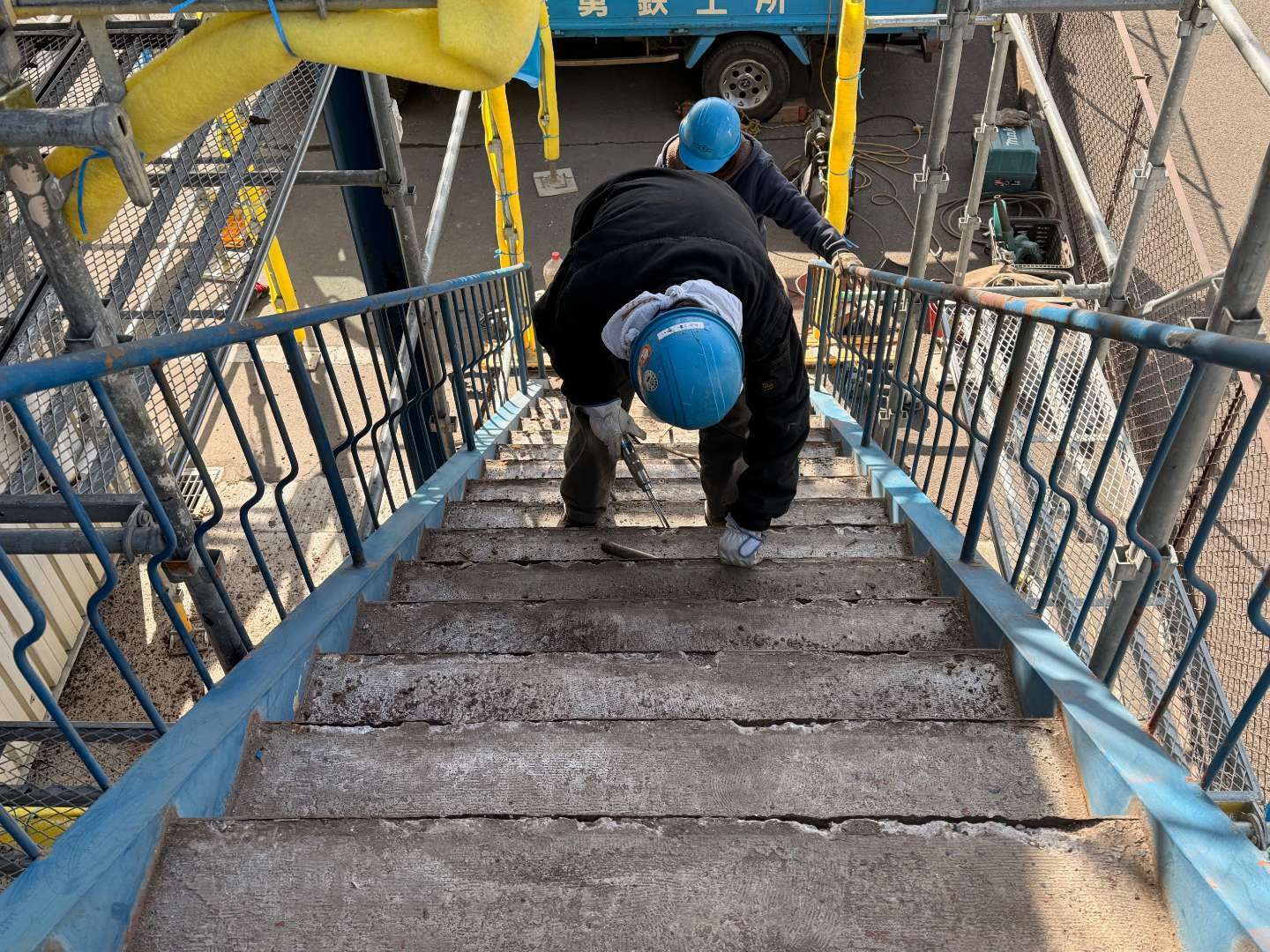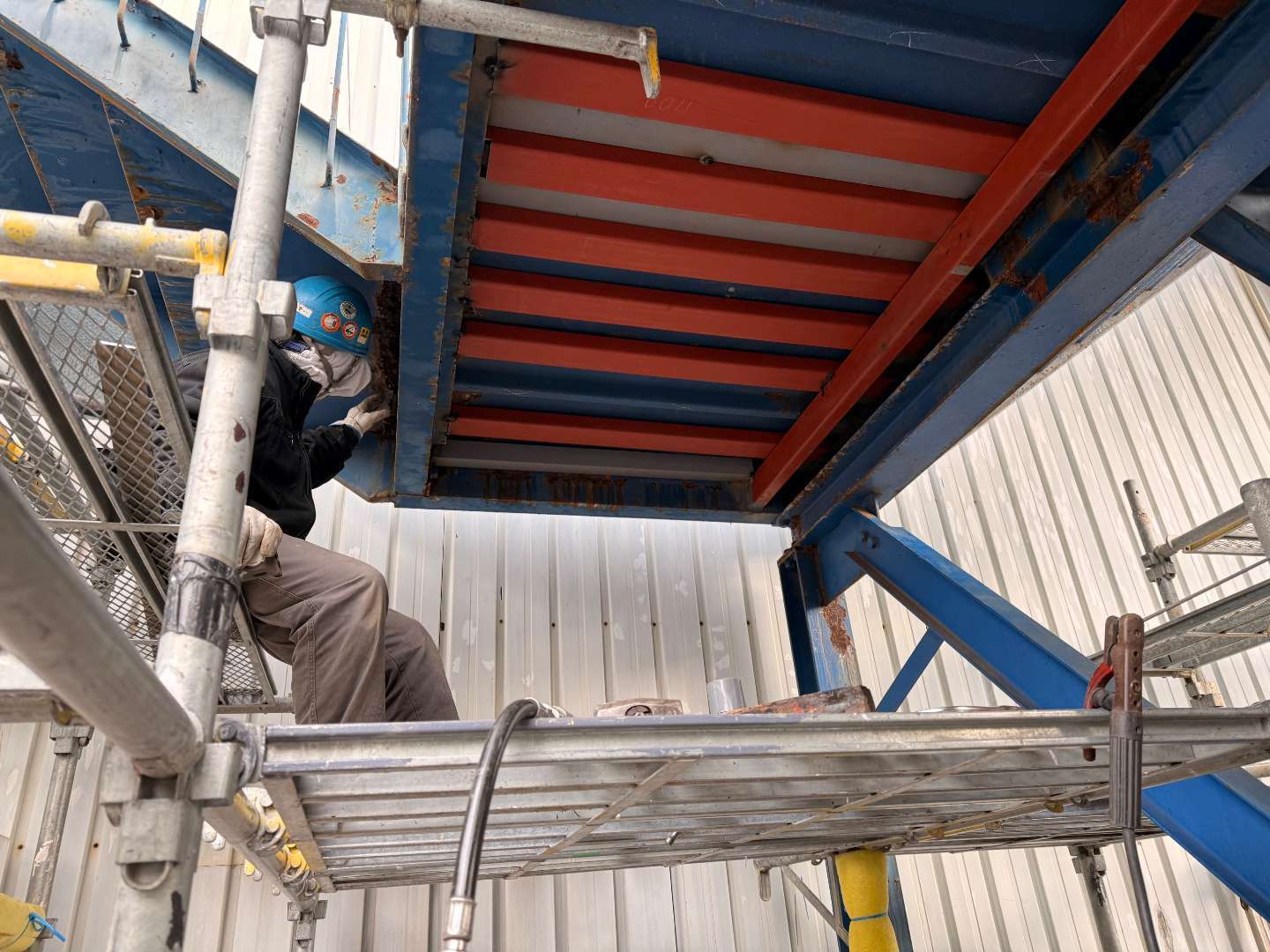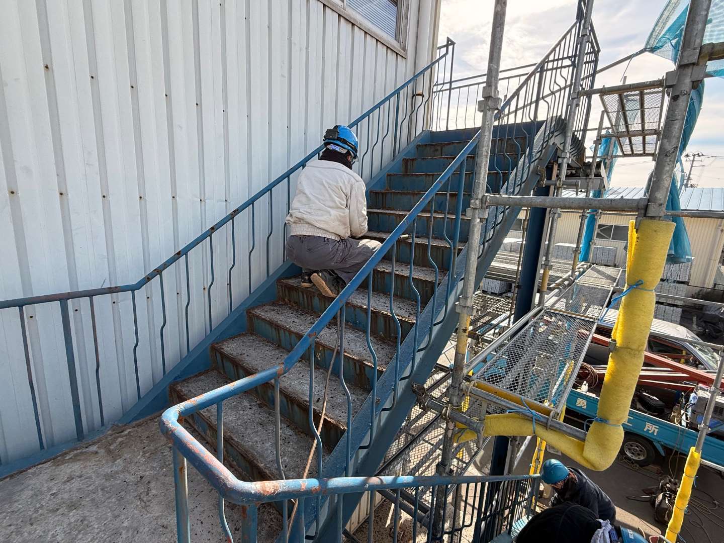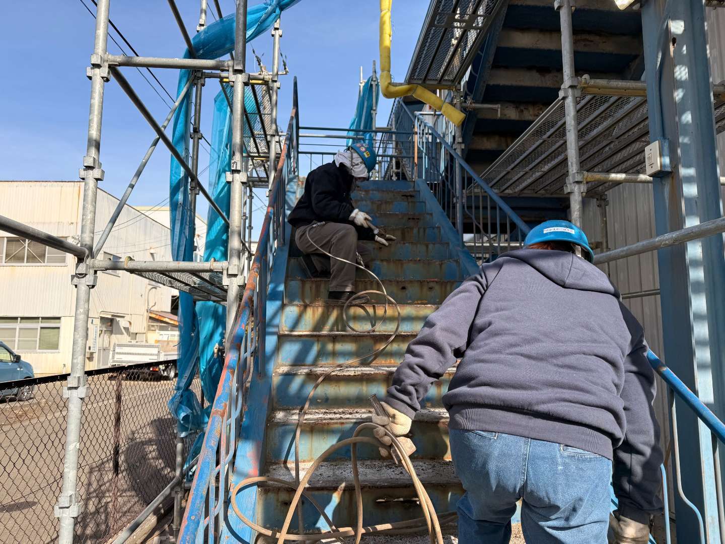 本日は、鉄骨階段ケレン・鉄骨材補強作業です。