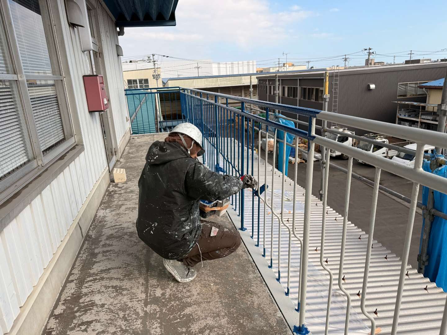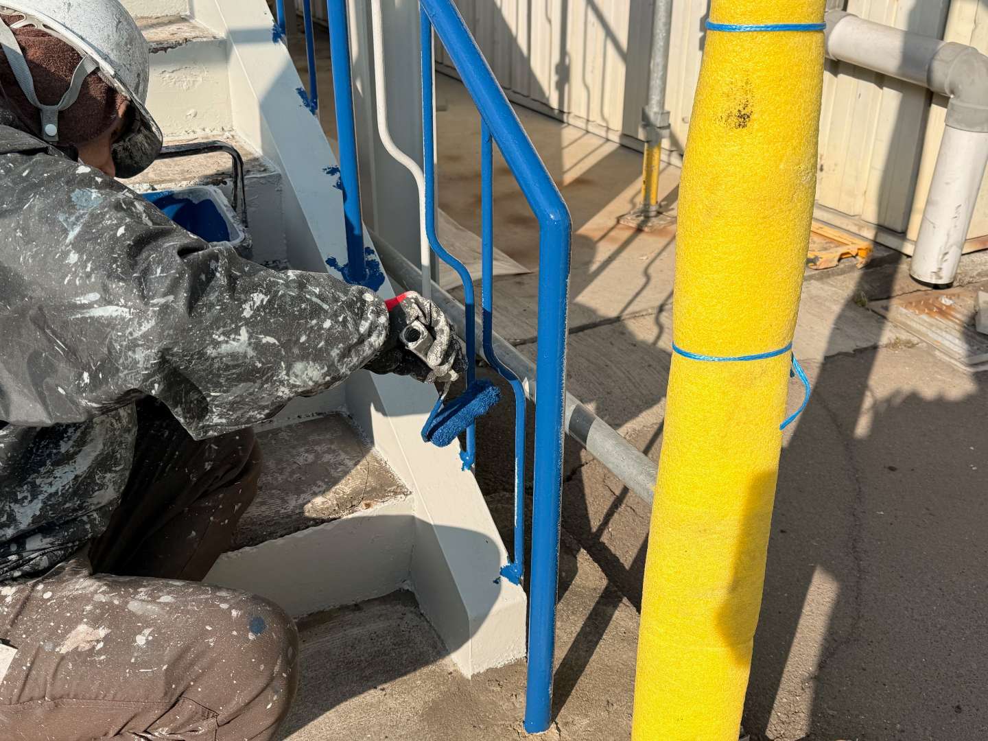 本日は、階段手すり中塗り塗装作業
