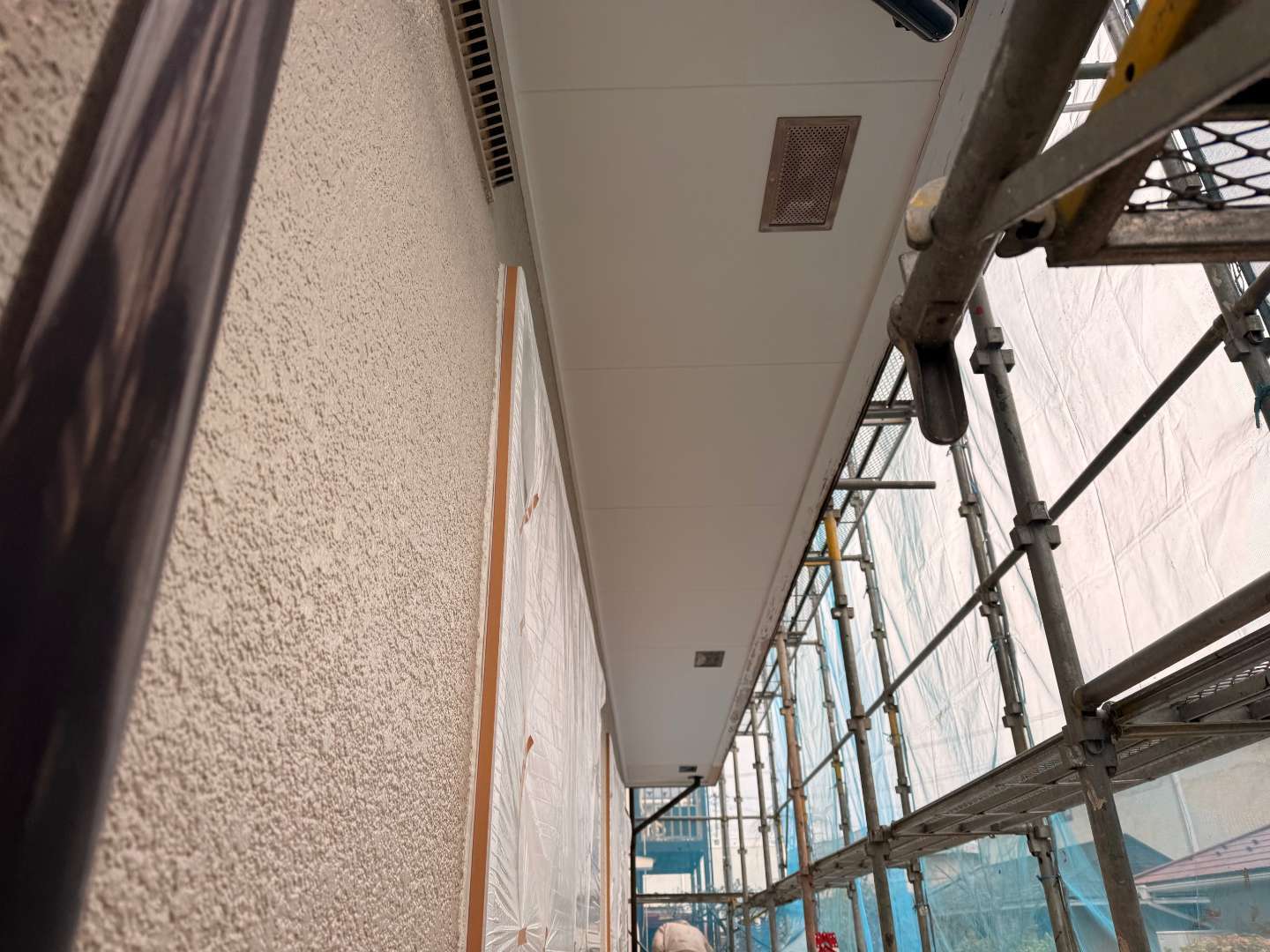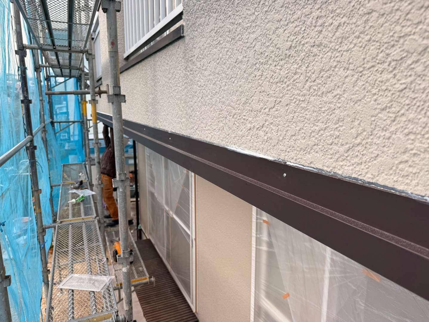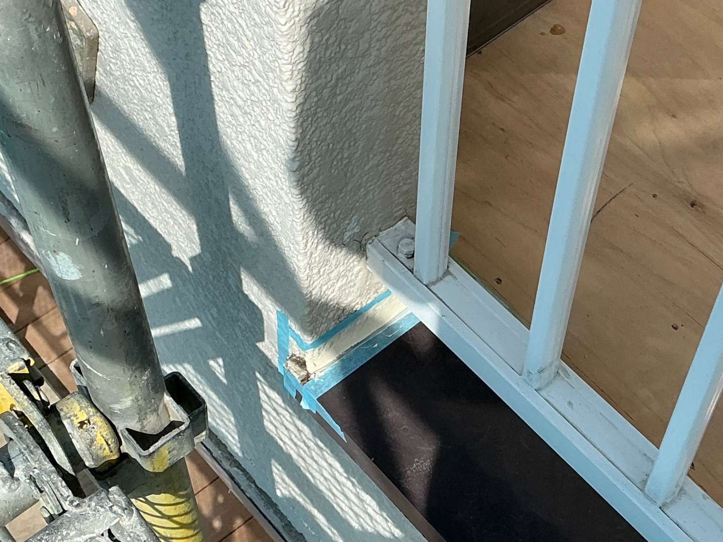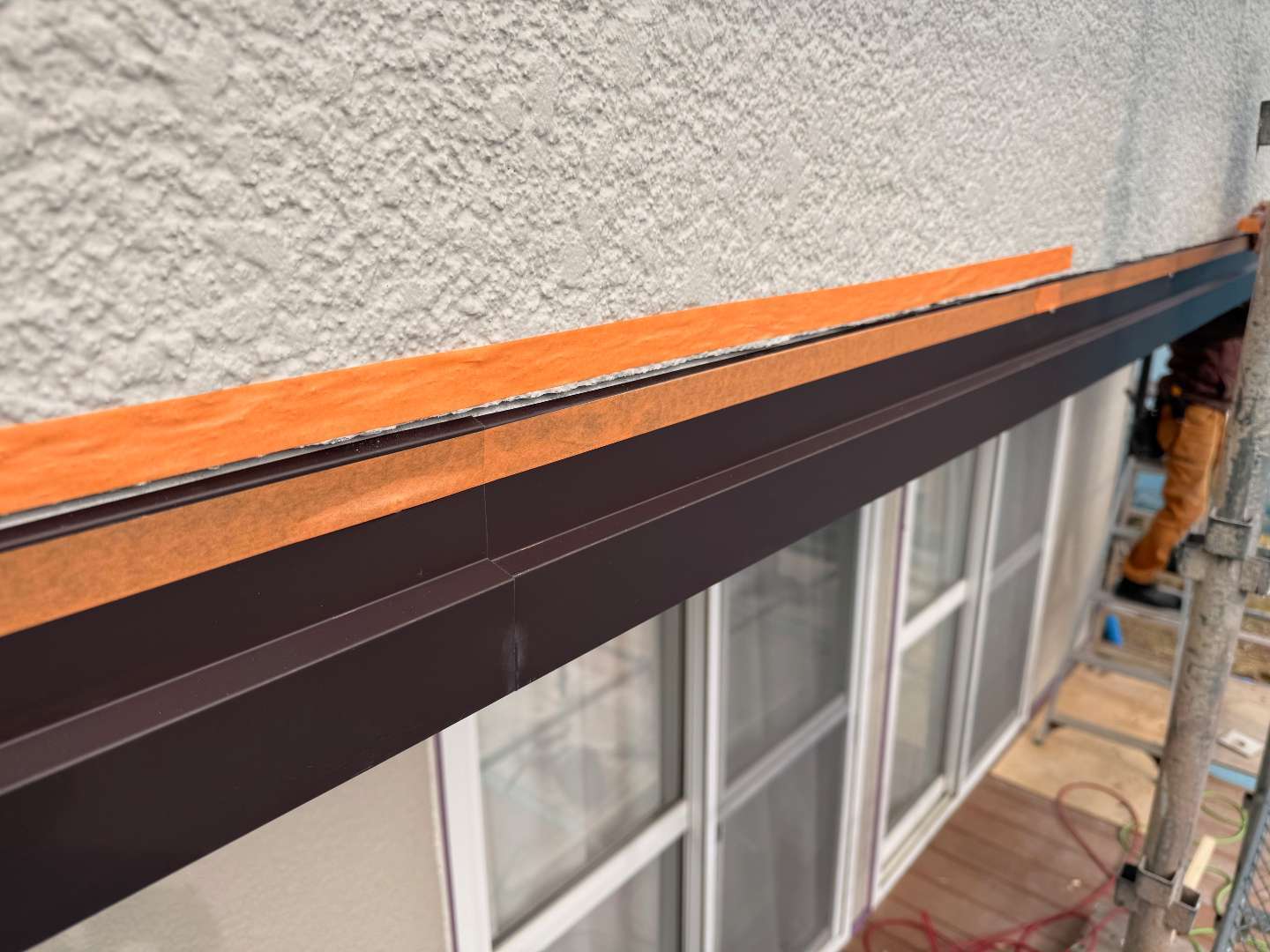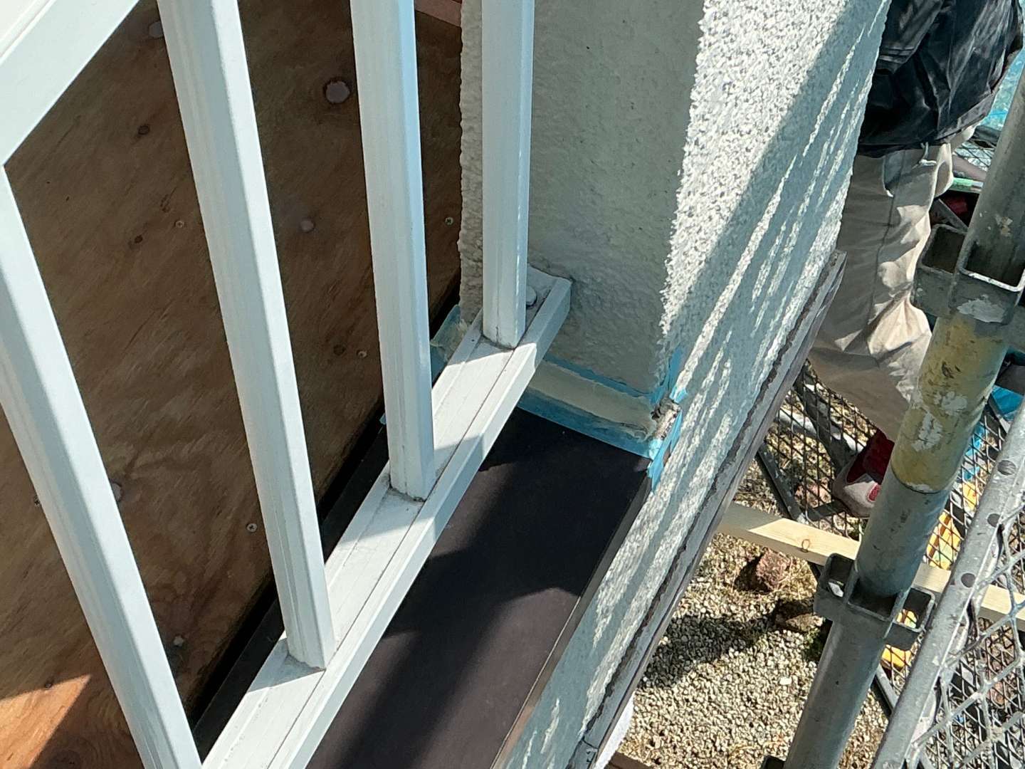 本日は、バルコニーFRP防水・外壁面水切り取付・手摺廻りシーリング・軒天補修・軒天通気ガラリ取付作業です。