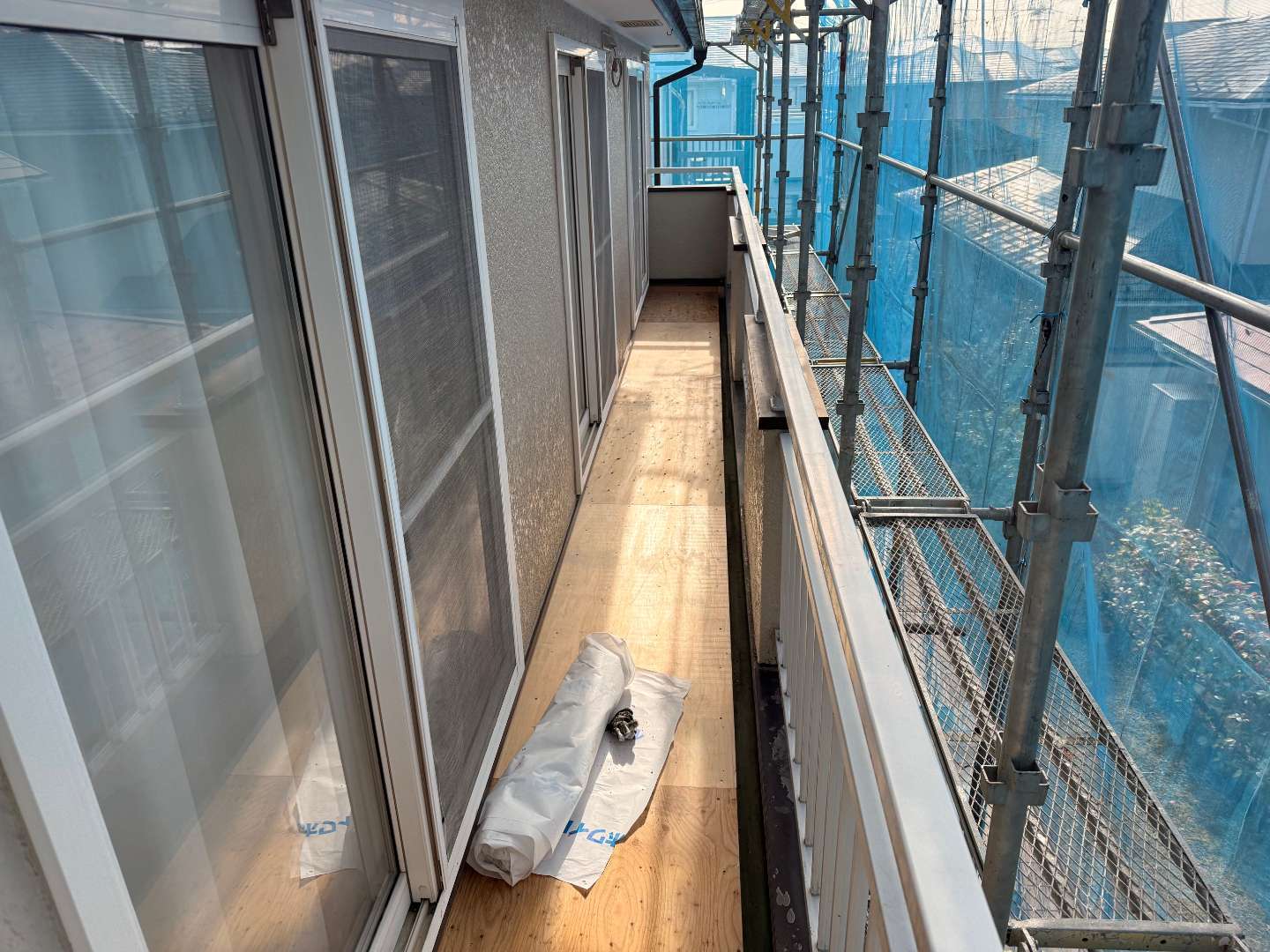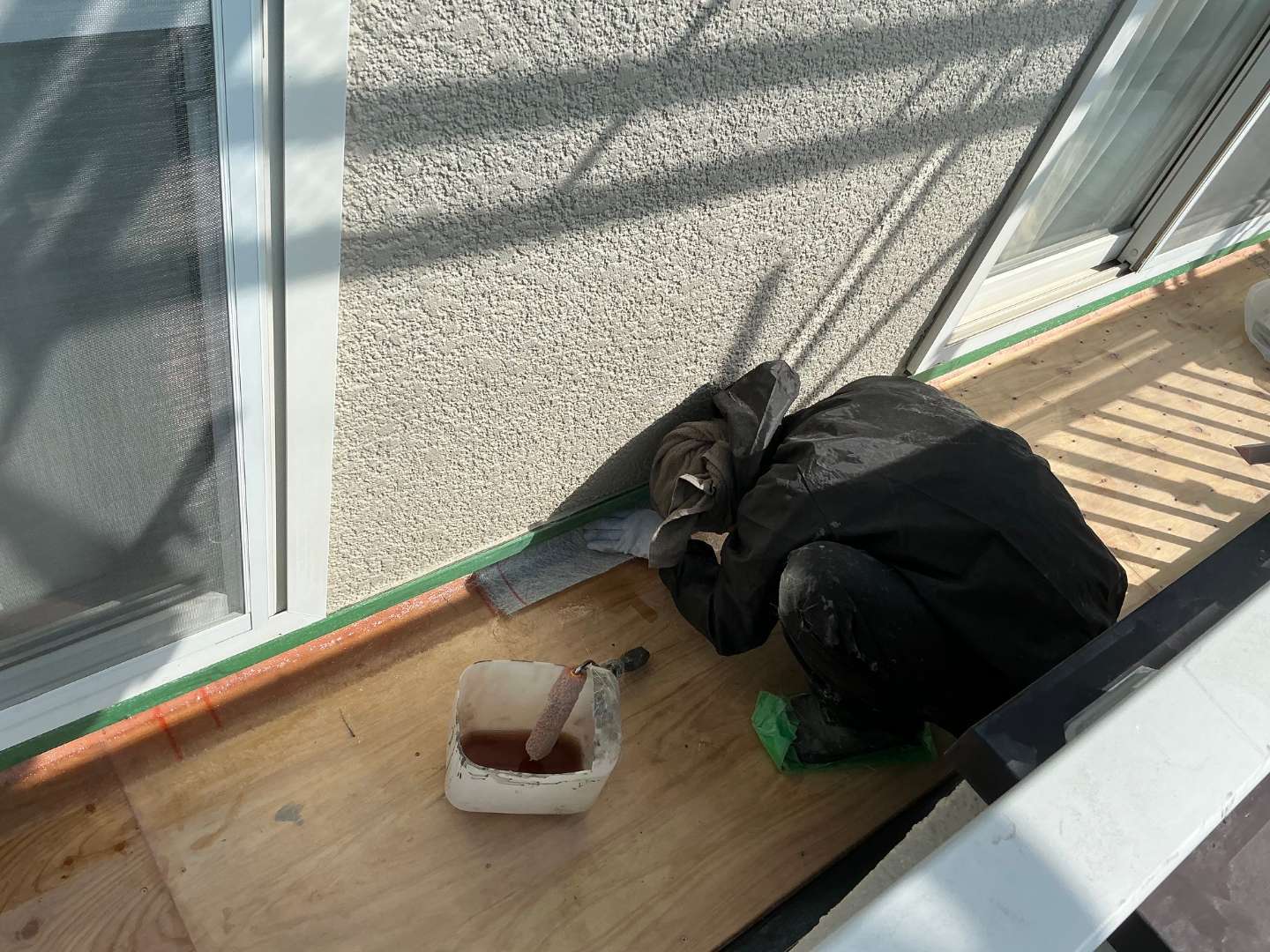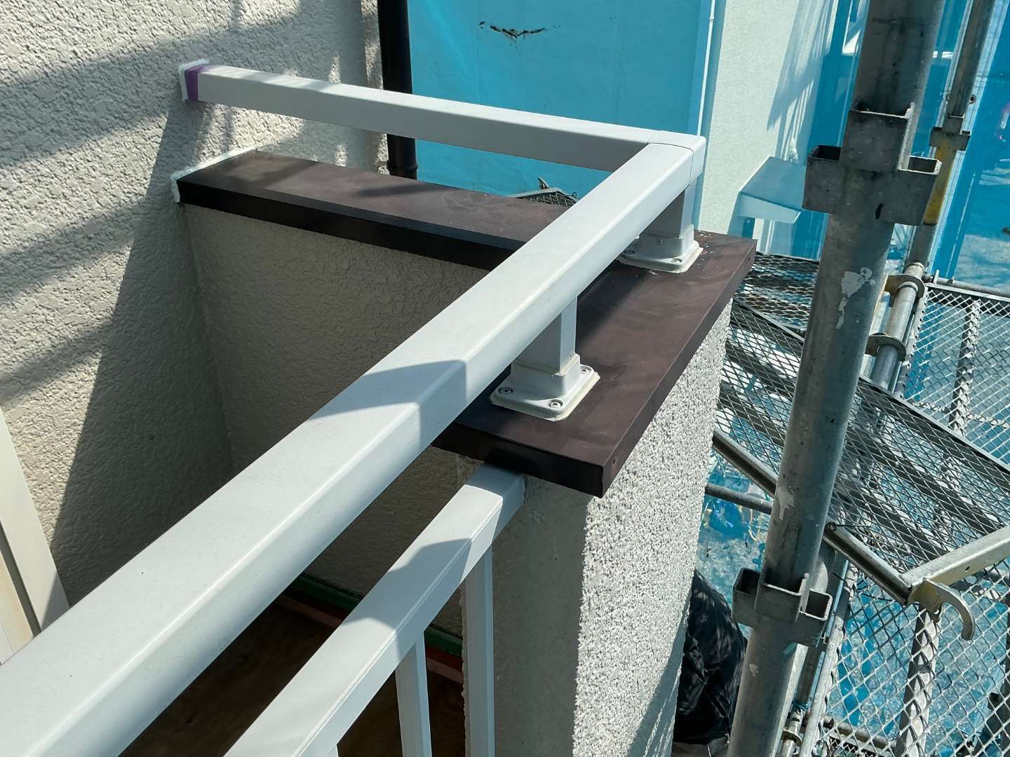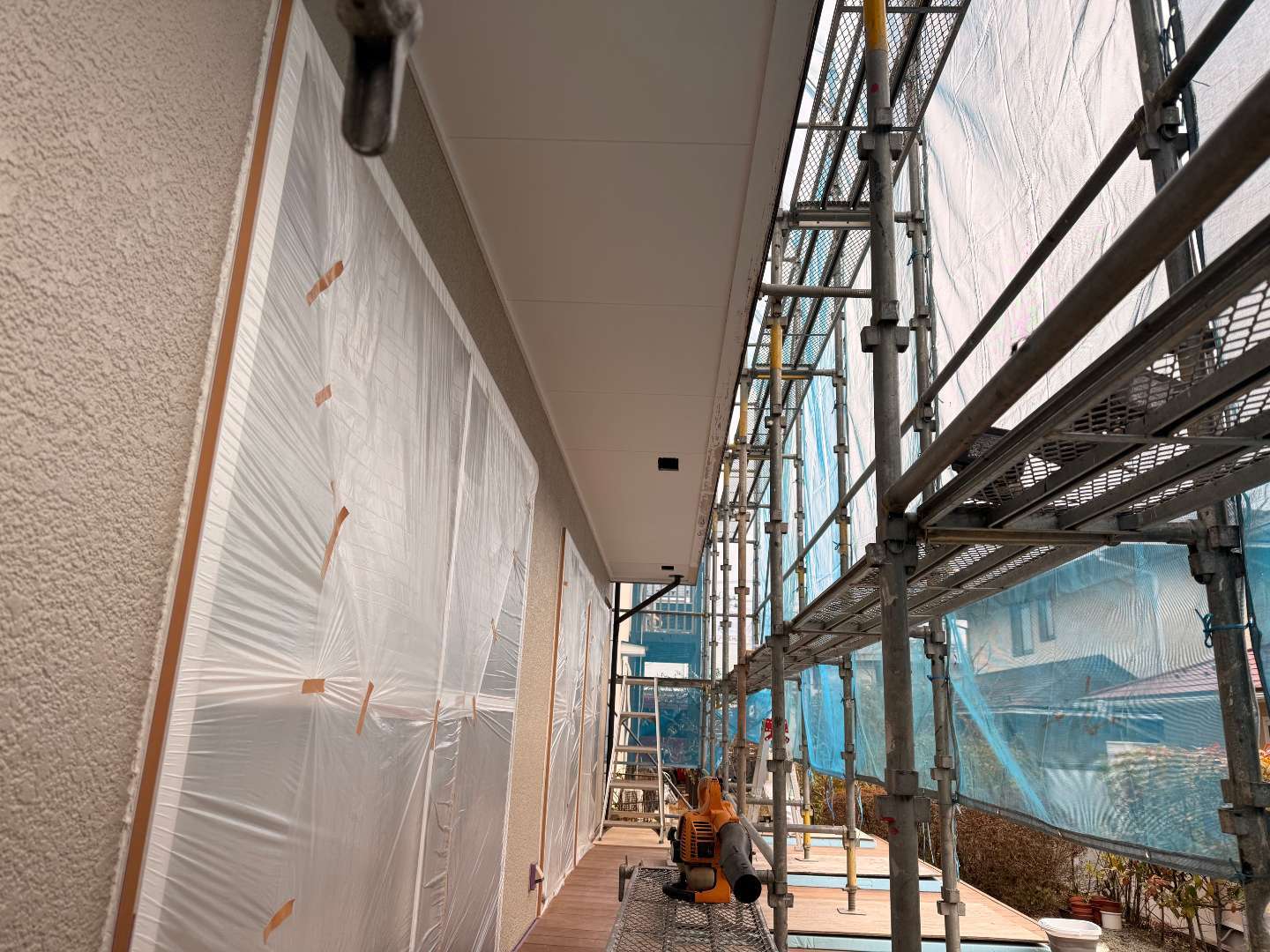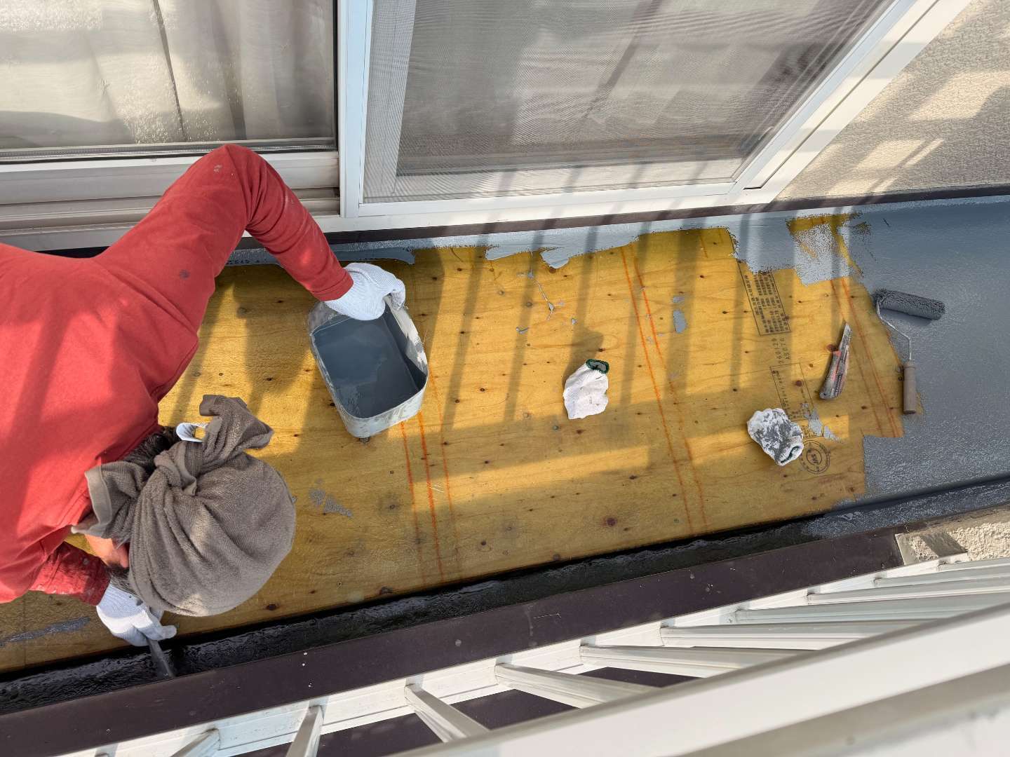 本日は、バルコニーFRP防水・外壁面水切り取付・手摺廻りシーリング・軒天補修・軒天通気ガラリ取付作業です。