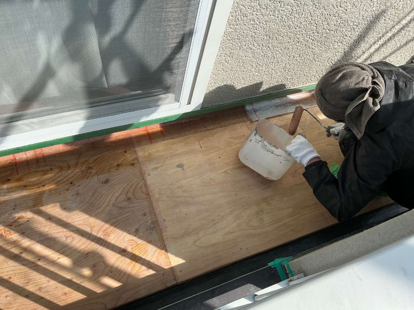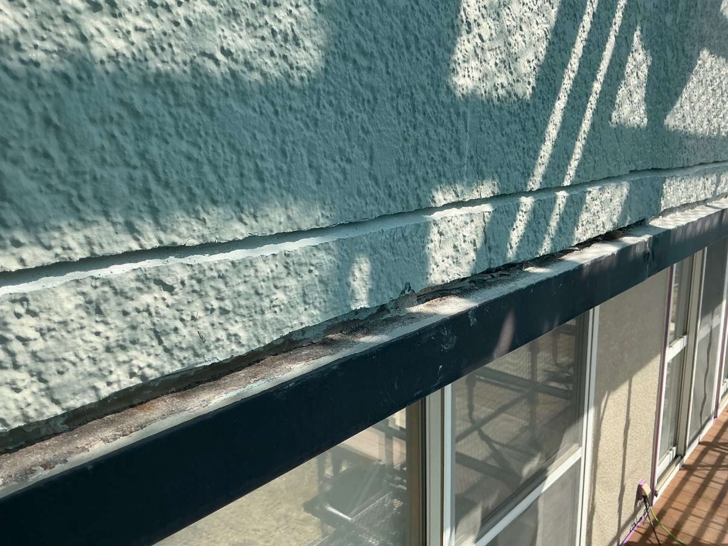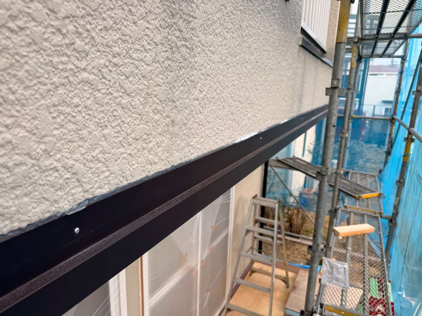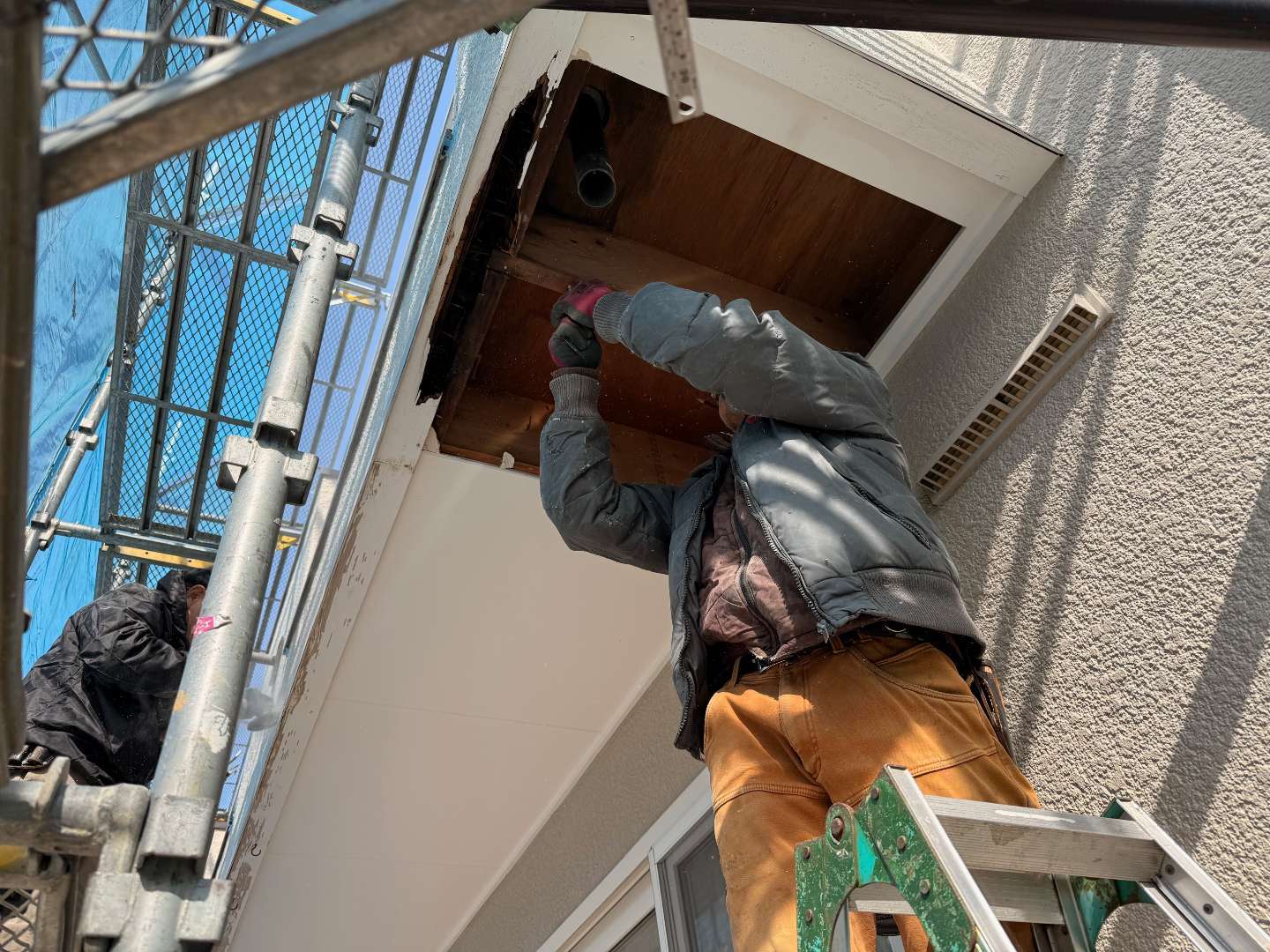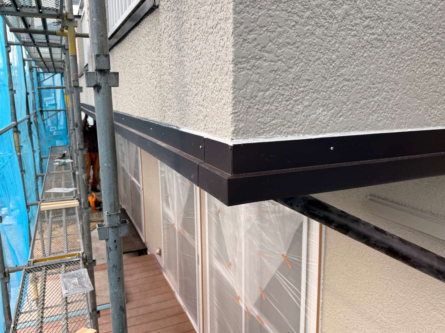 本日は、バルコニーFRP防水・外壁面水切り取付・手摺廻りシーリング・軒天補修・軒天通気ガラリ取付作業です。