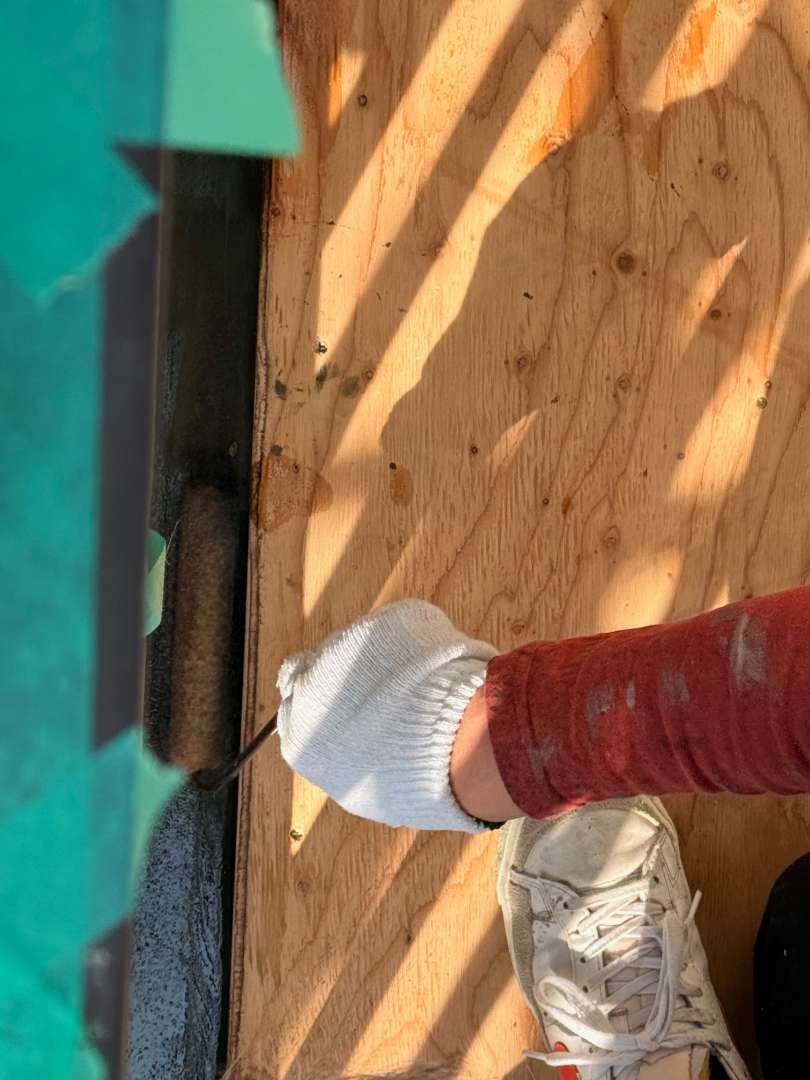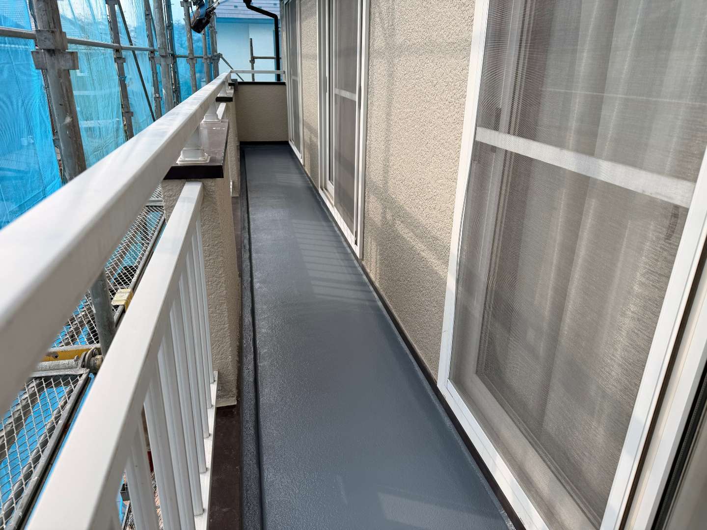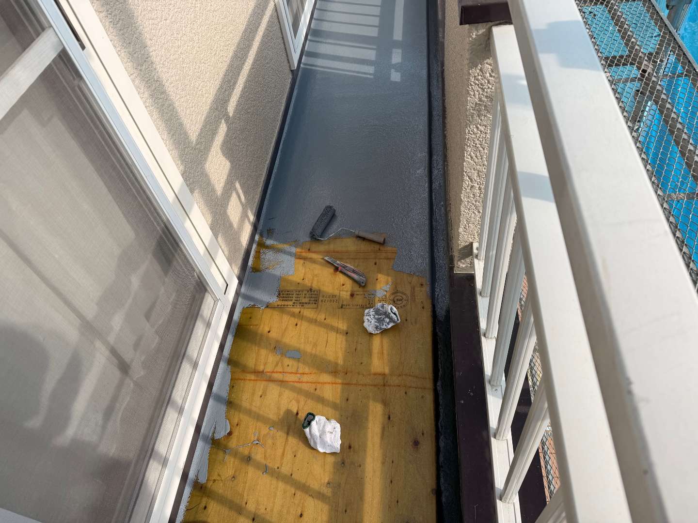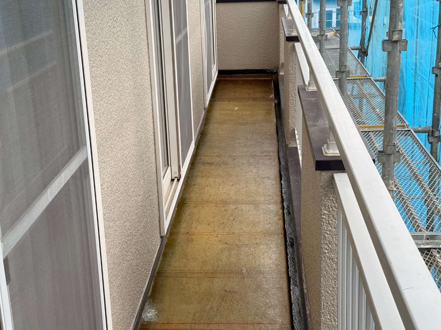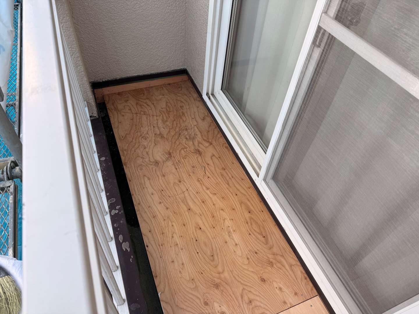 本日は、バルコニーFRP防水・外壁面水切り取付・手摺廻りシーリング・軒天補修・軒天通気ガラリ取付作業です。