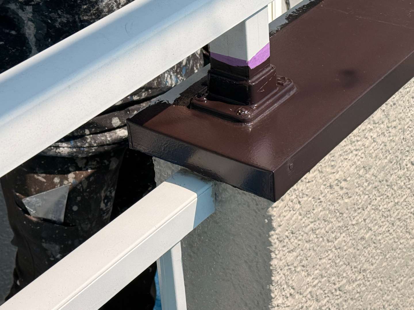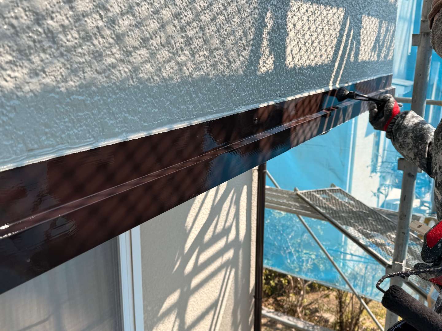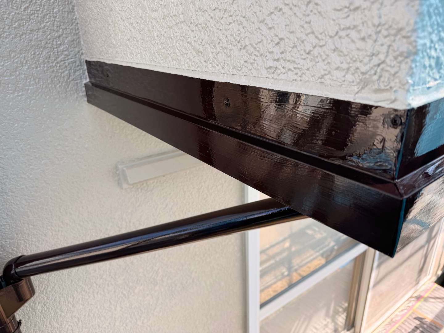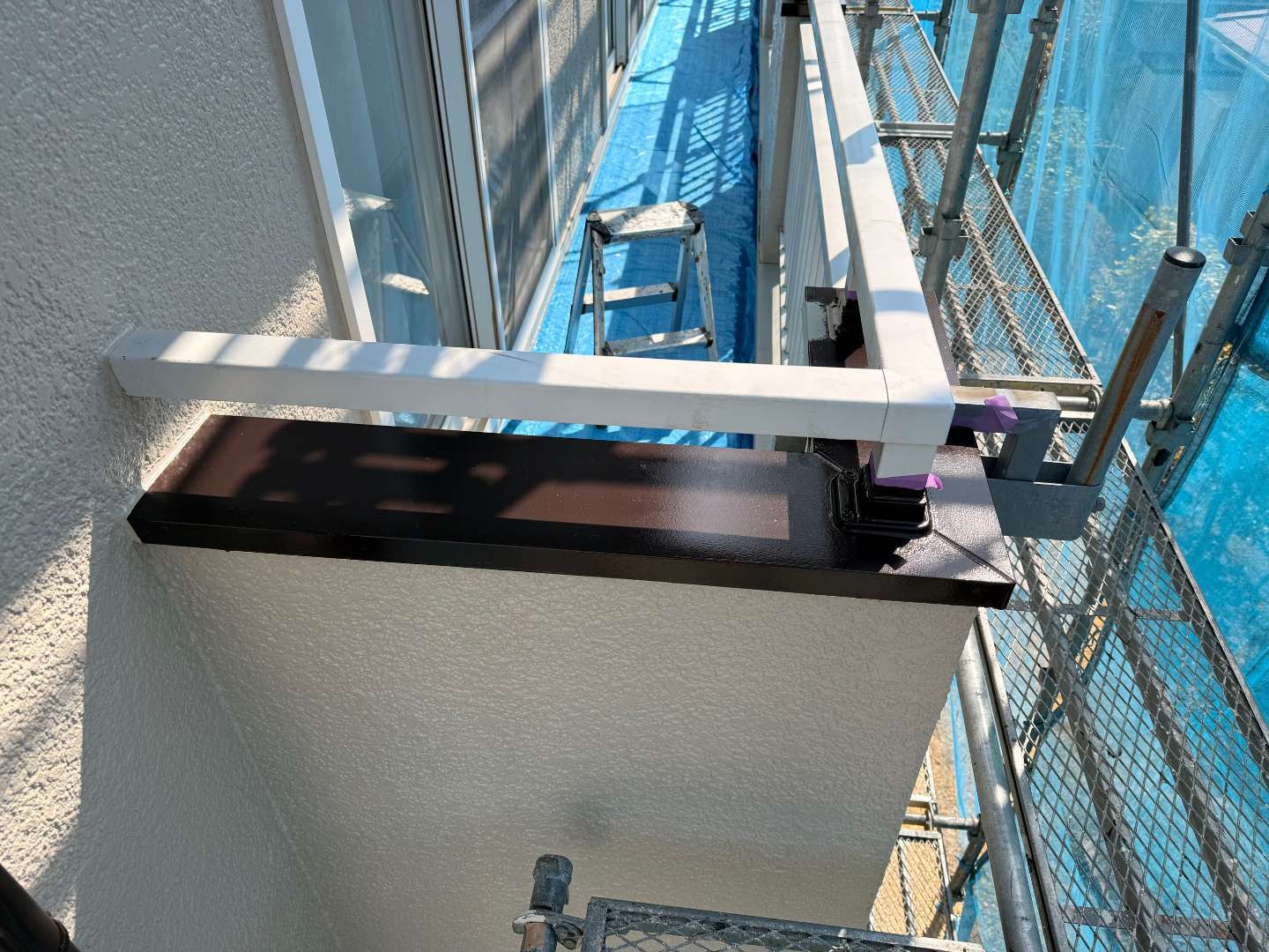 本日は、雨樋仕上げ塗装・バルコニー笠木中塗り・水切り塗装作業
