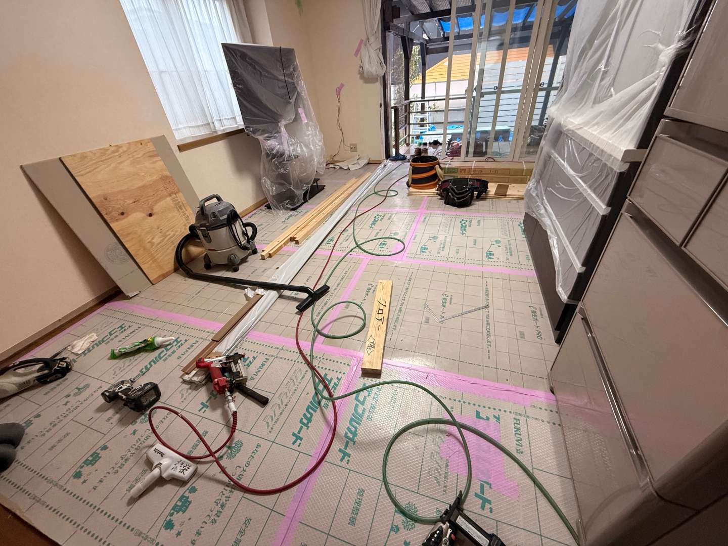 本日は、床フローリング貼り・キッチン1部撤去作業