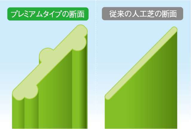 芝の糸の断面を「W型」に加工することで、踏まれても倒れにくく、ヘタりにくいのが特徴です。お孫さんが遊びに来た時に走り回ったり、頻繁にお庭に出たりする方におすすめの、長持ち仕様です。