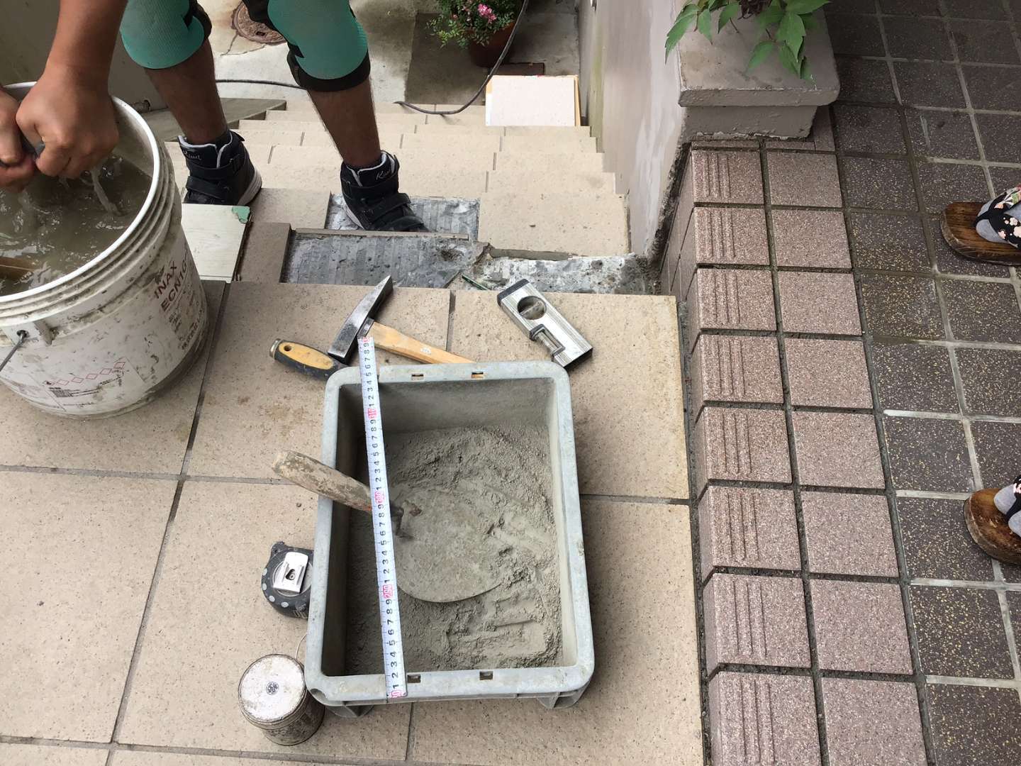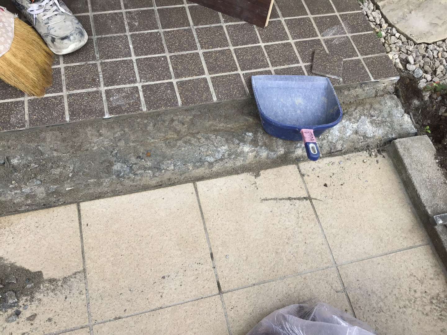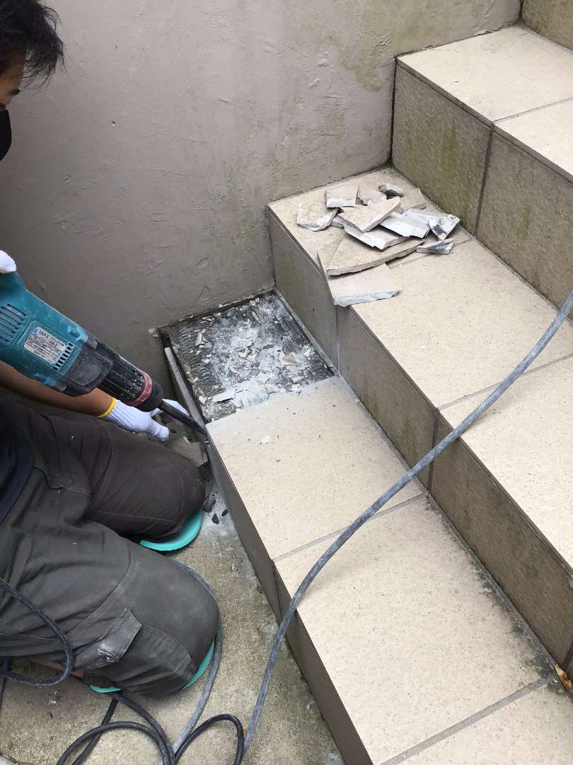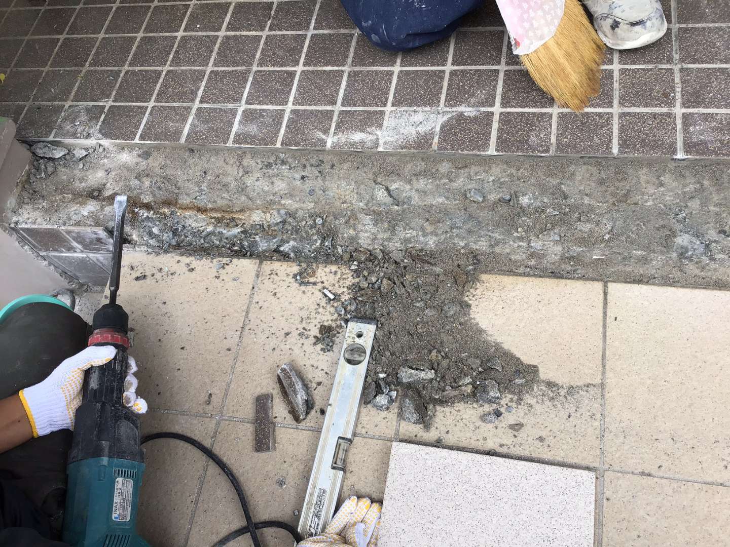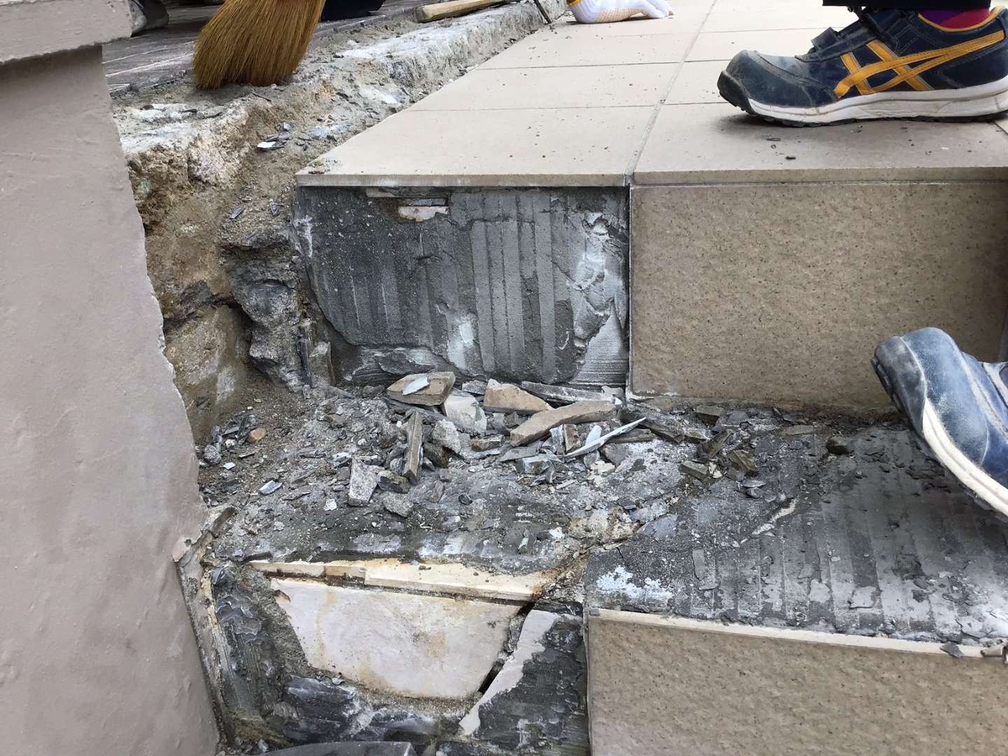 地震での被害で玄関ポーチタイル・階段タイルに亀裂箇所張替えです。
