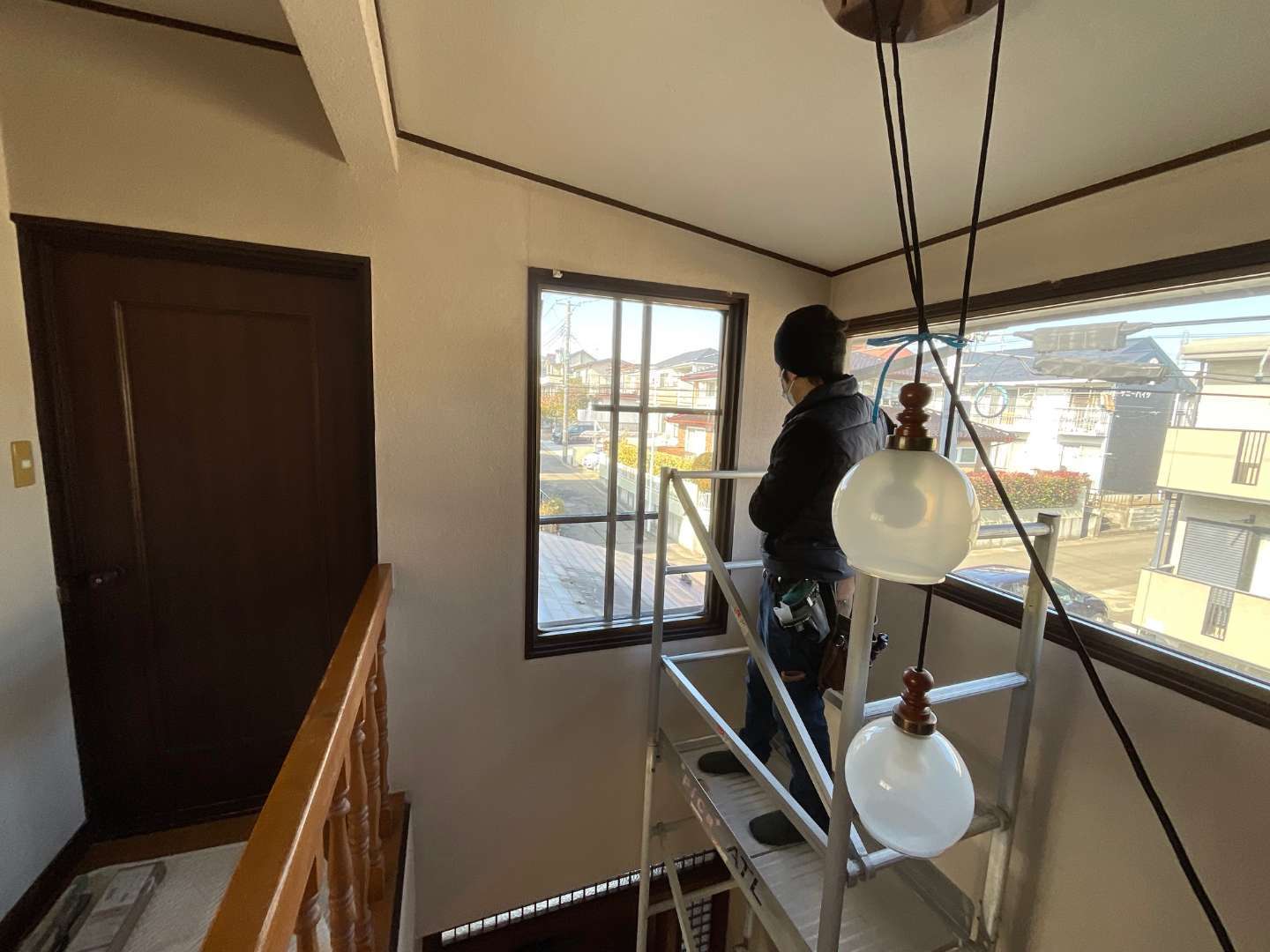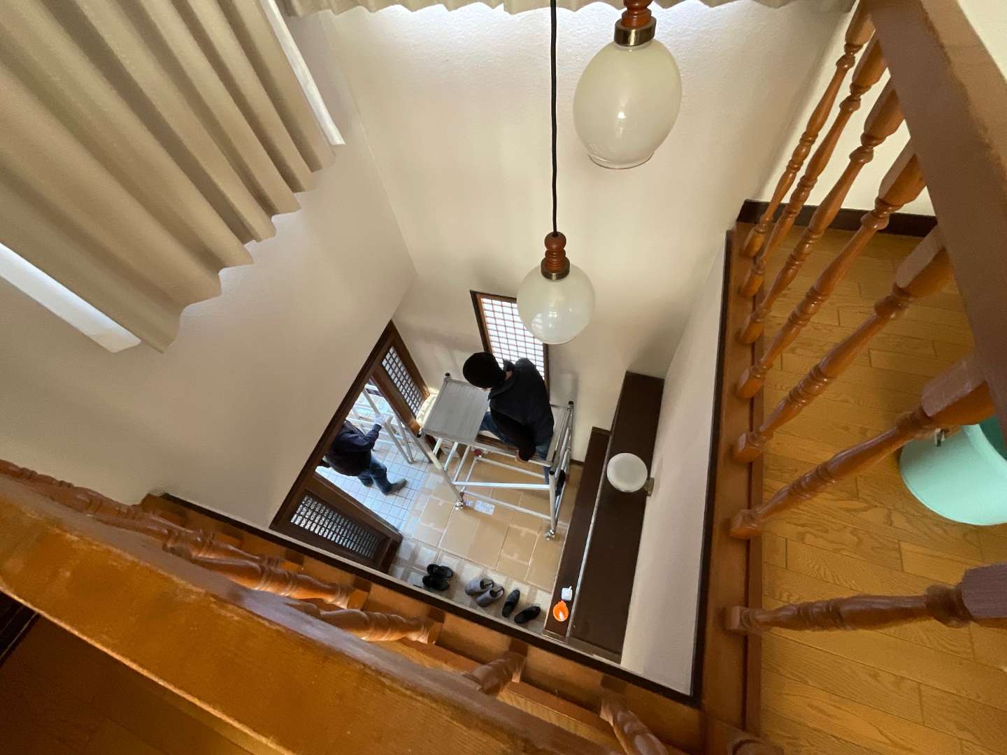 吹き抜け箇所のカーテンレールのひもが壊れ、開閉ができなくなり